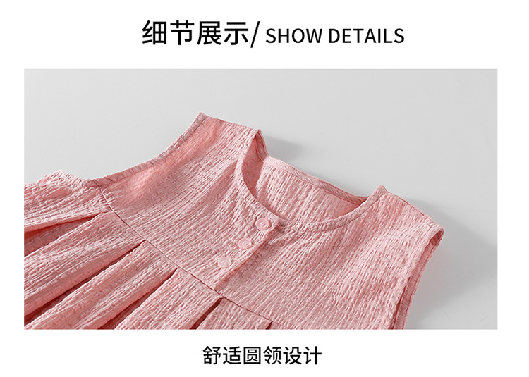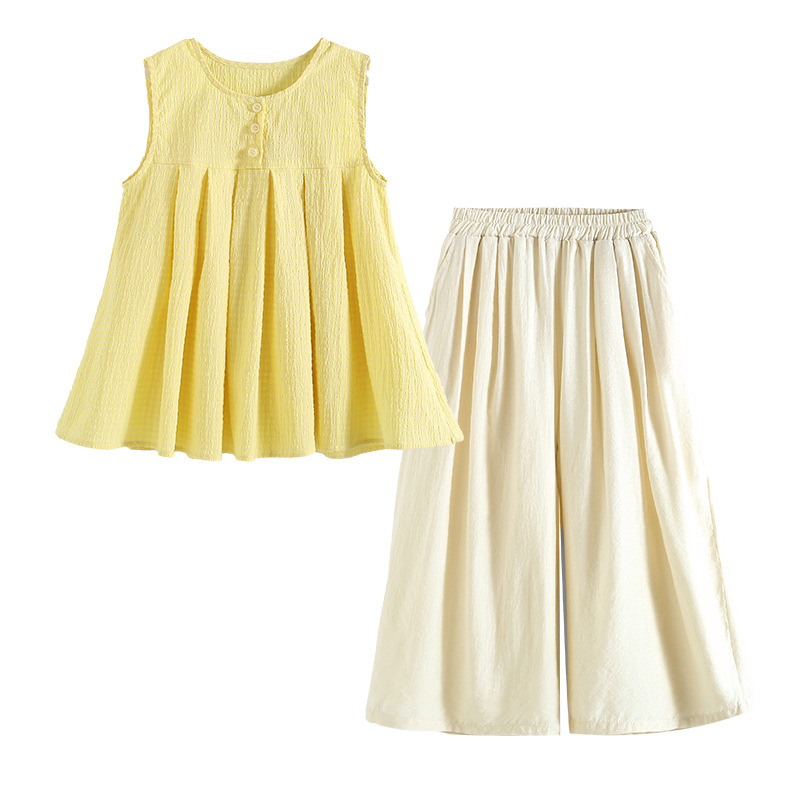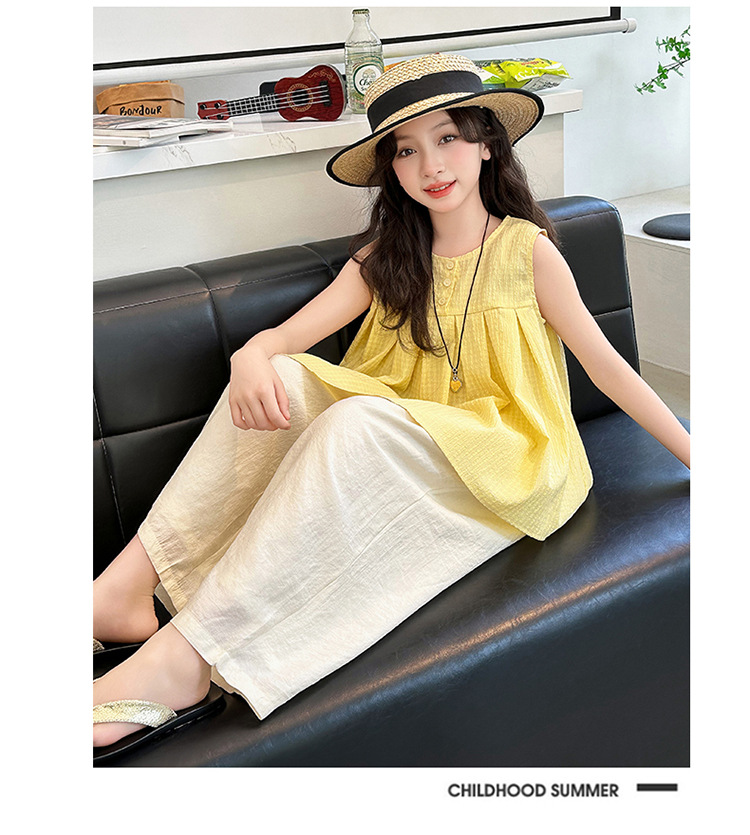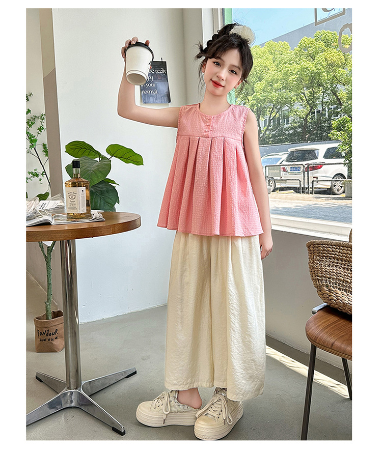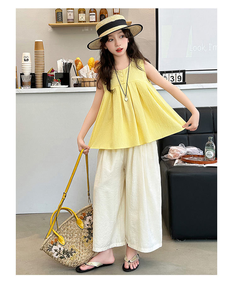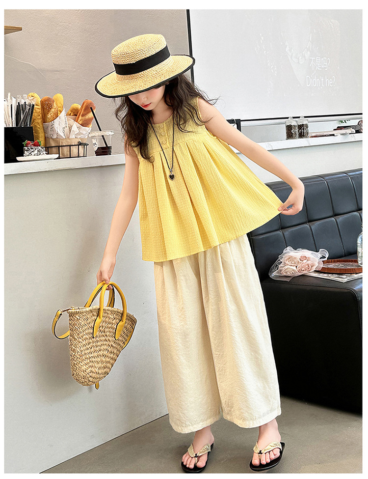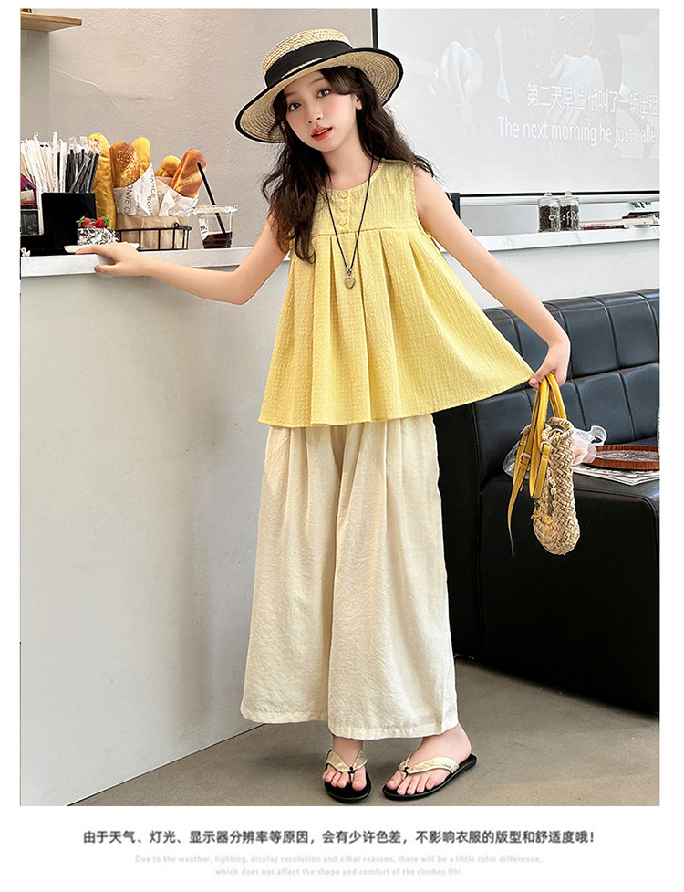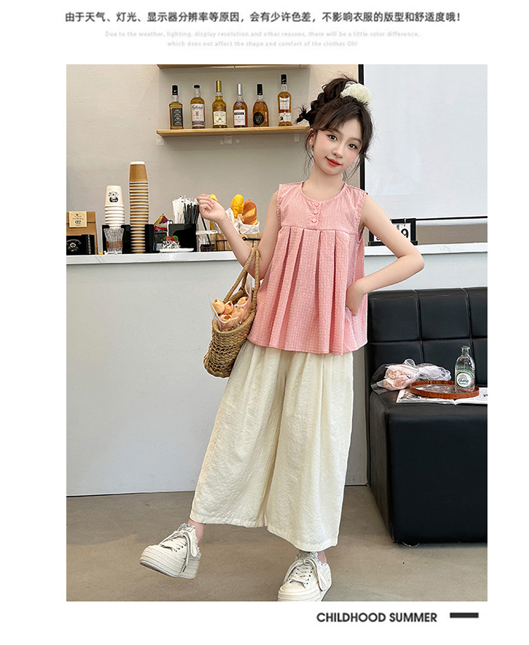 여자 민소매 인형 셔츠 세트 여름 2024 새로운 세련된 어린이 유행 여름 조끼 소녀 넓은 다리 바지