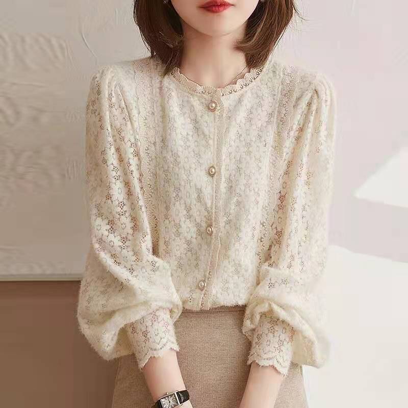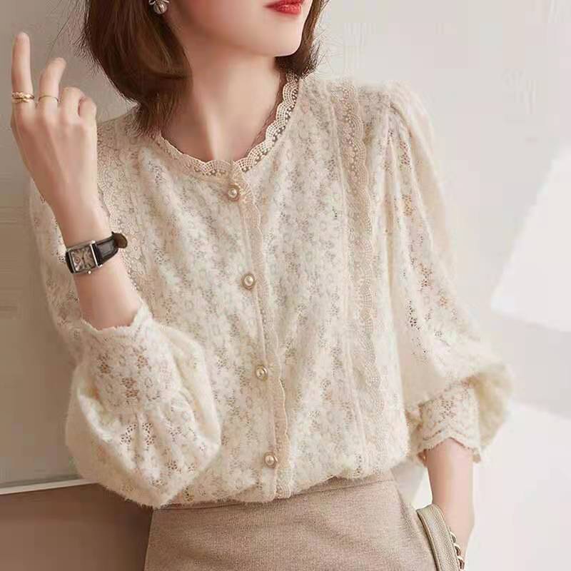 2024 봄과 가을 새로운 프랑스 스타일 부드러운 샌딩 스티칭 레이스 라운드 넥 꽃 퍼프 슬리브 레이스 셔츠 여성용 탑스토어 가기