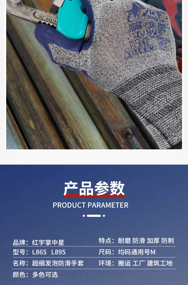 홍위장중싱(L895) 침지폼 장갑, 내마모성, 미끄럼 방지, 라텍스 주름, 건설 현장 작업용 안전 장갑