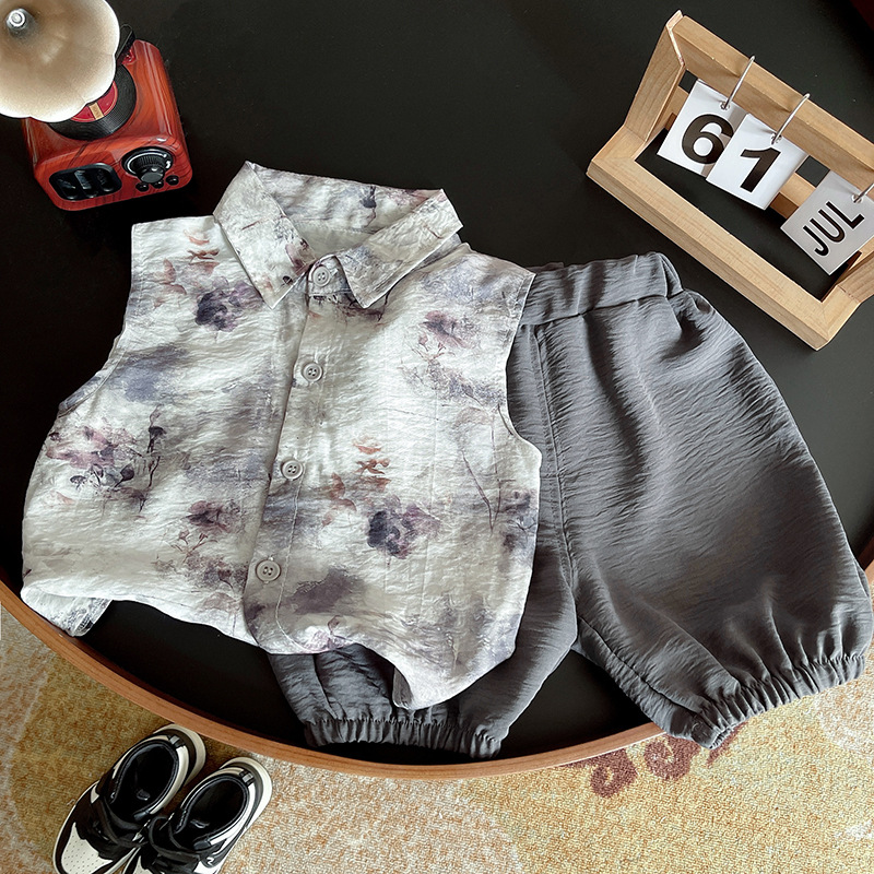 여름 아동복 조끼 패션 어린이 세트 어린이 캐주얼 착용 잉크 연꽃 연못 조끼 세트