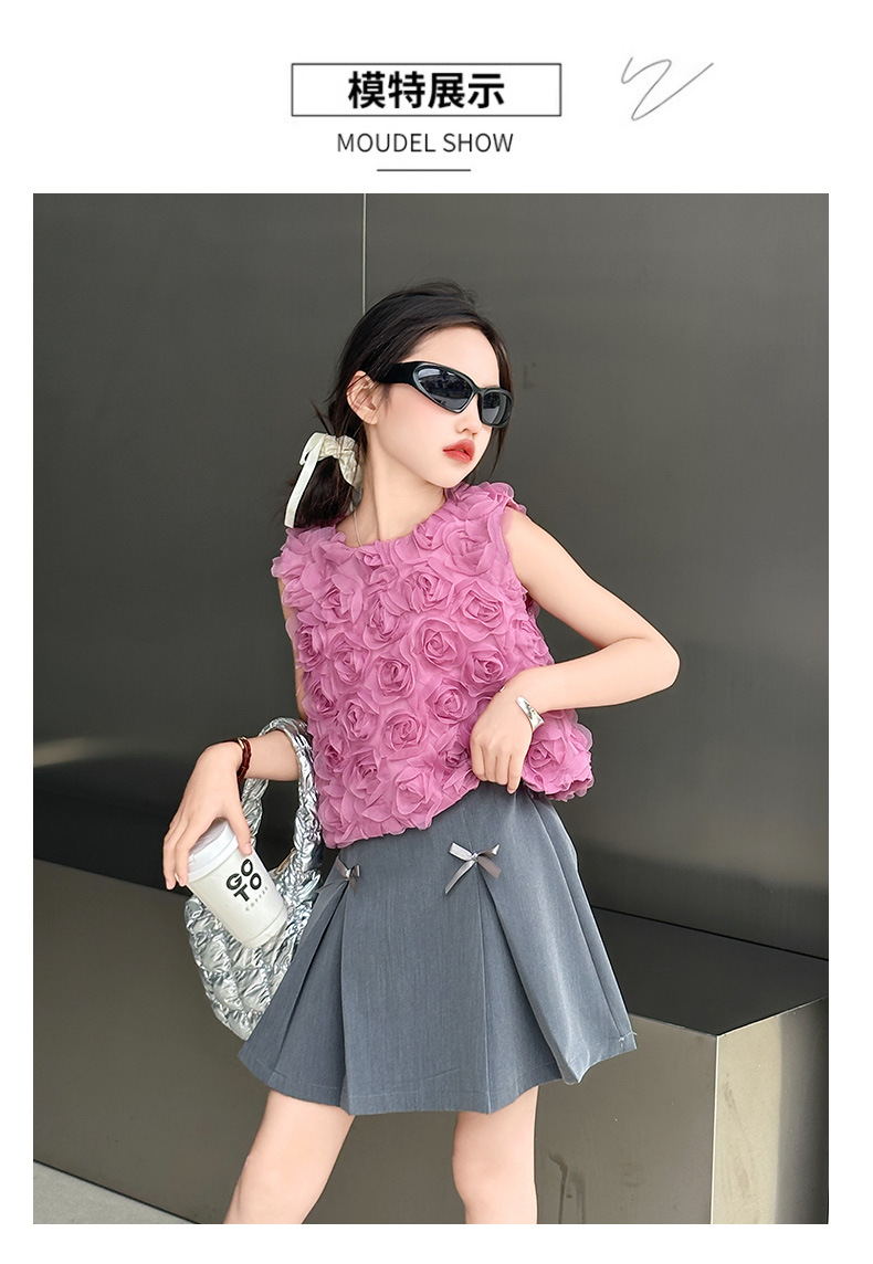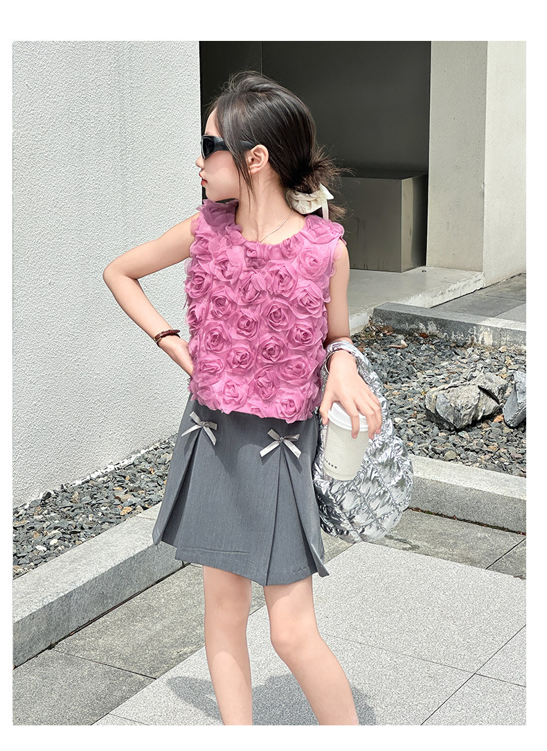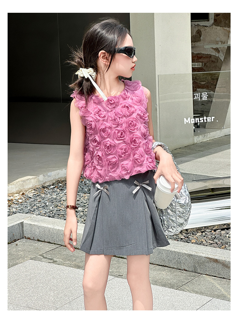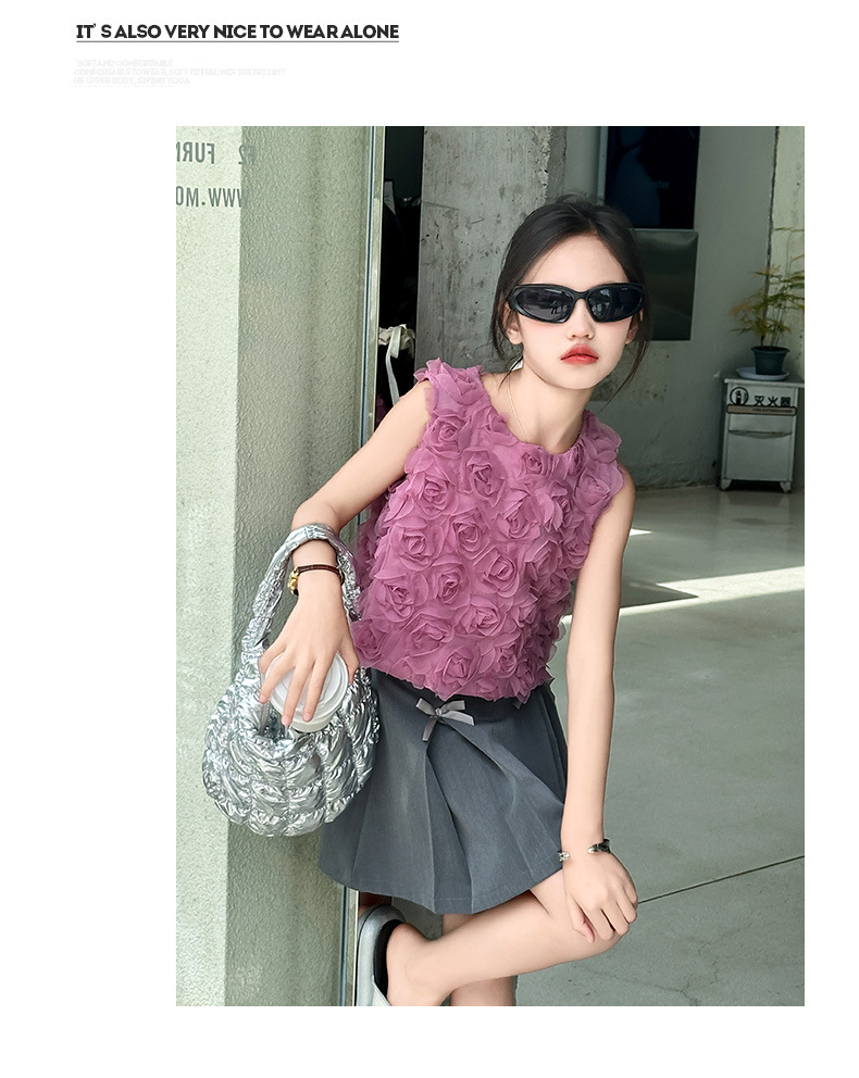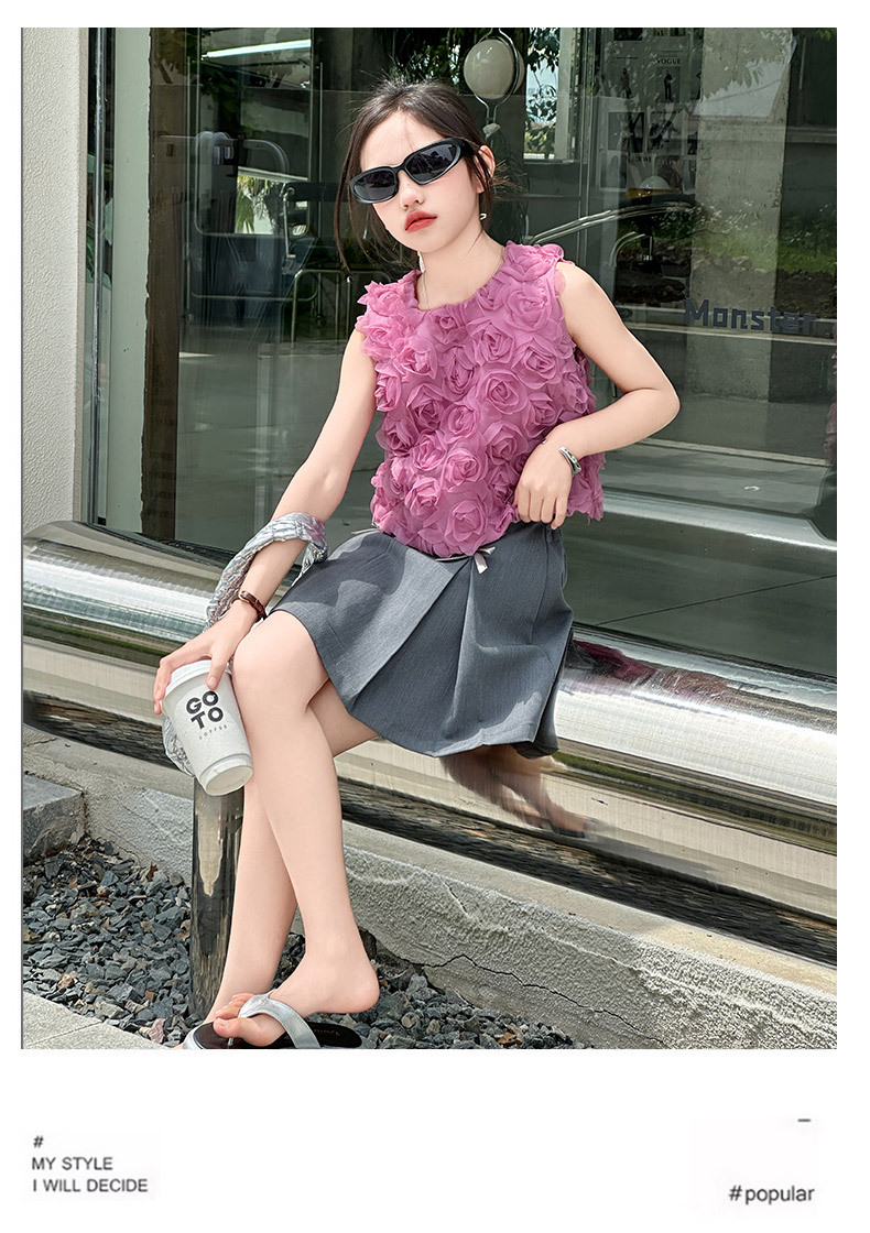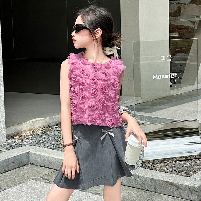 여성 대형 어린이 3 차원 장미 세트 2024 년 여름 프랑스 민소매 조끼 휴일 최고 치마 투피스 세트