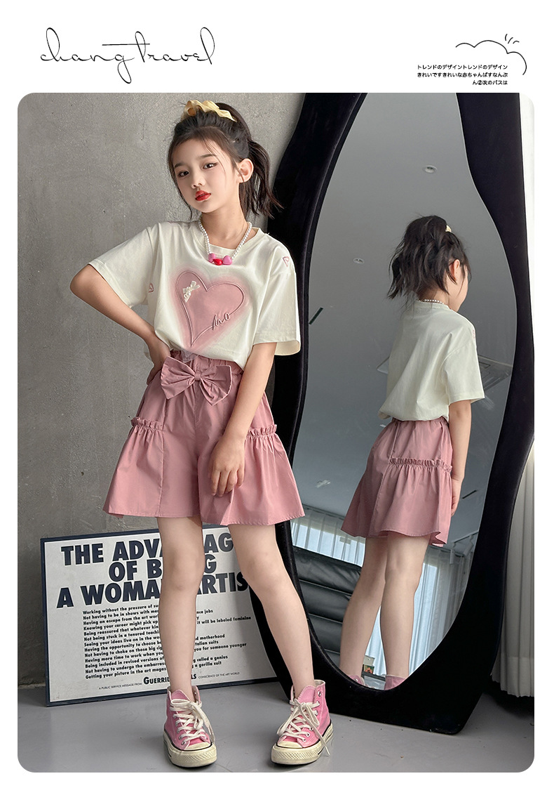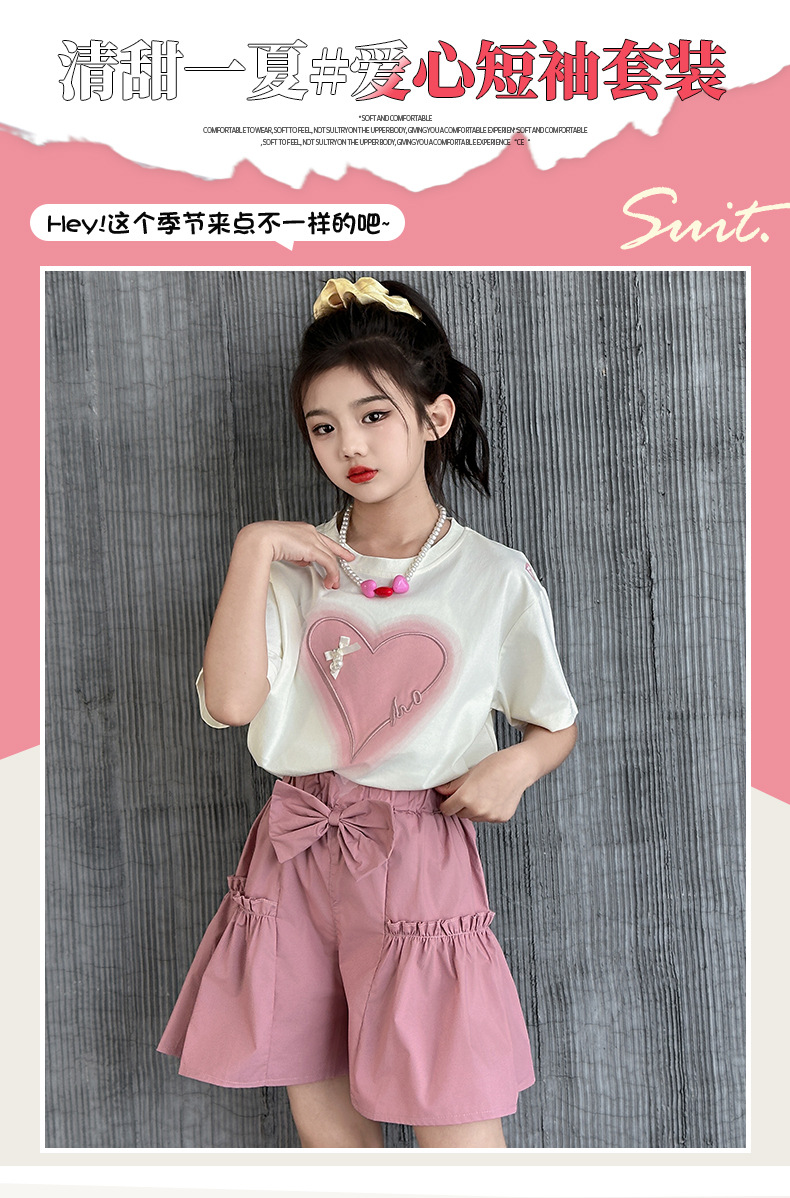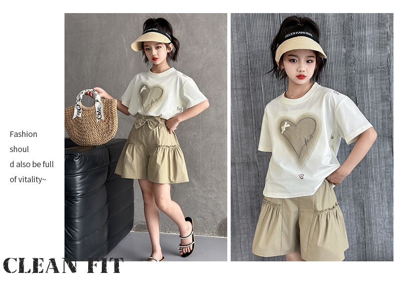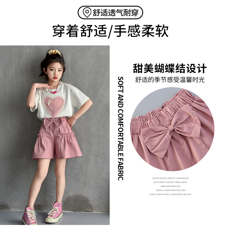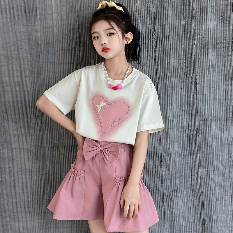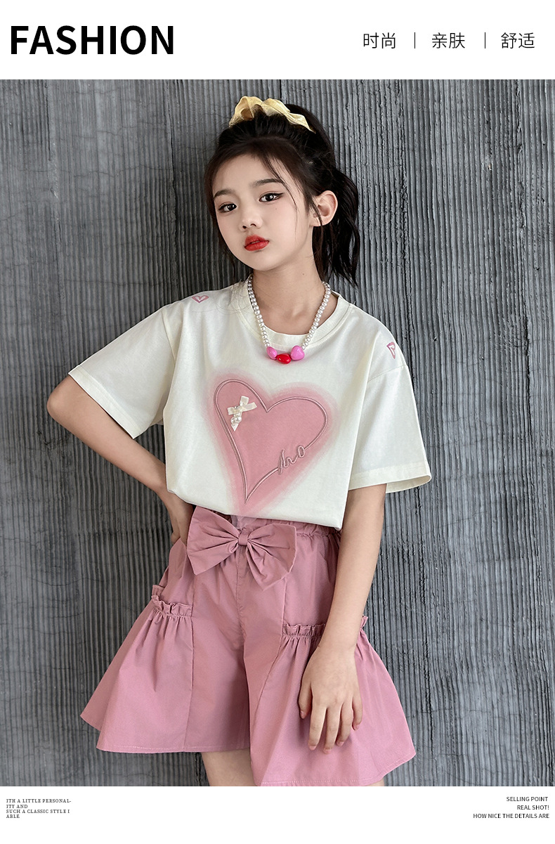 소녀 여름 반팔 세트 2024 새로운 스타일 소녀 세련된 패션 퓨어 코튼 미드 빅 어린이 여름 반바지 투피스 세트