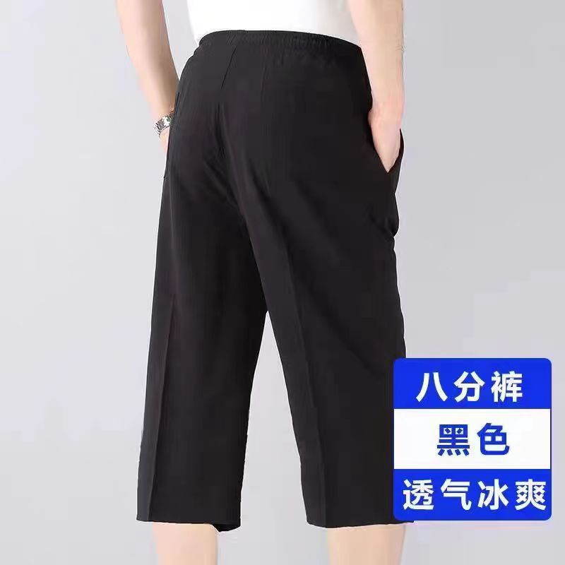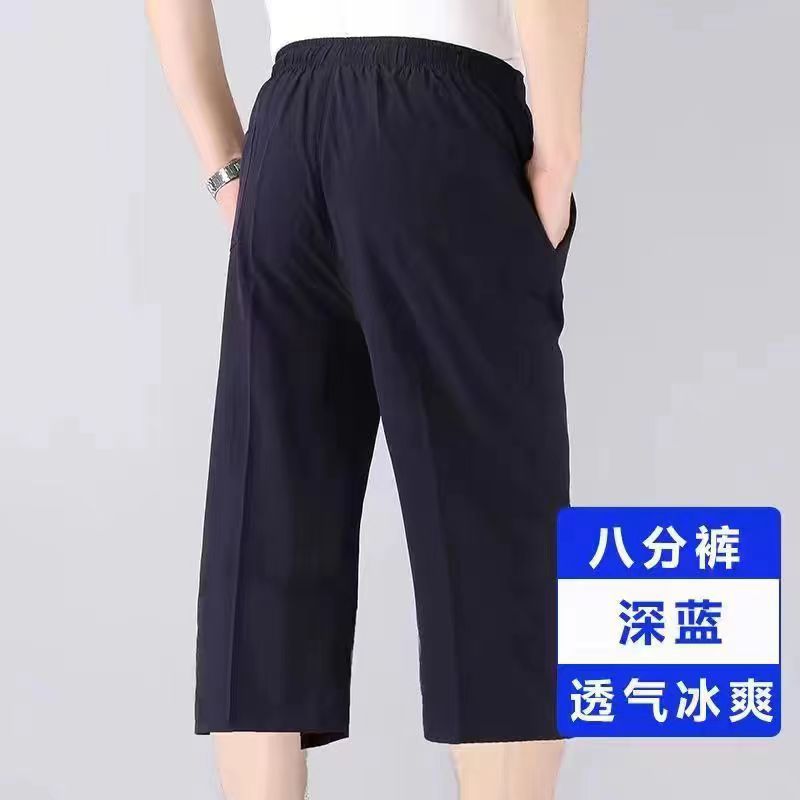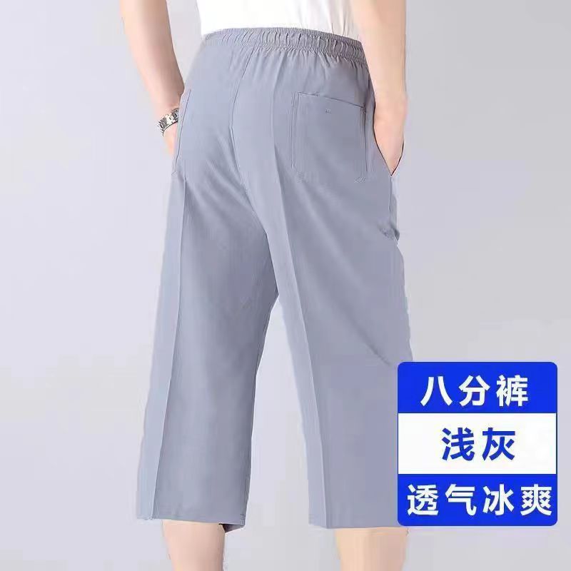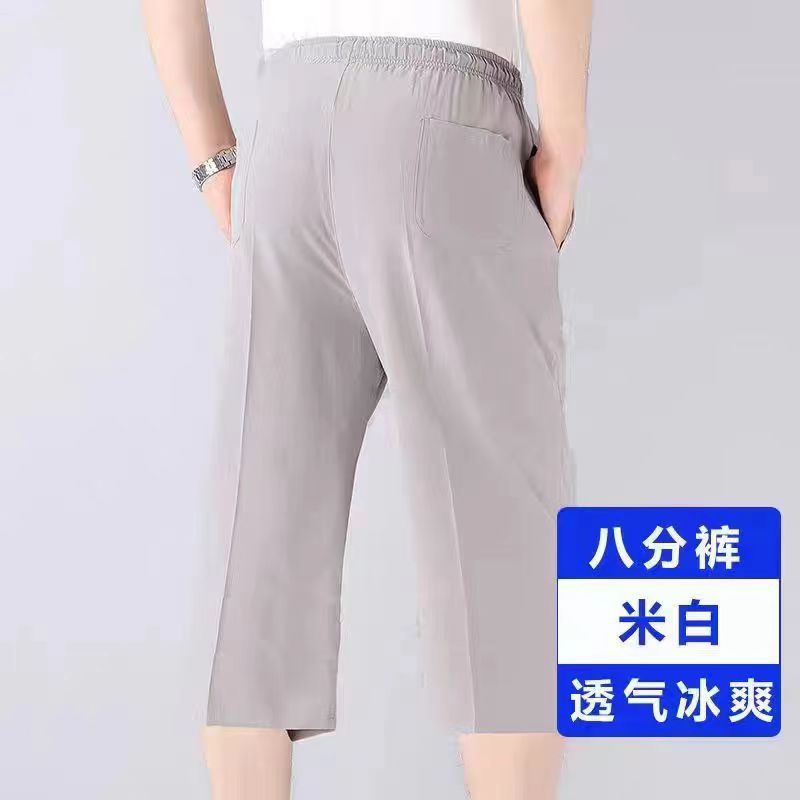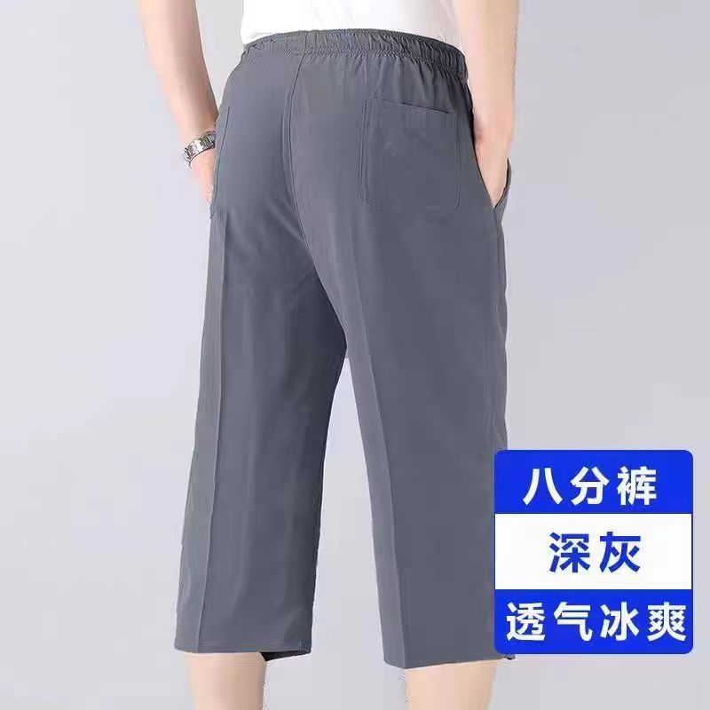 아이스 실크 속건성 8부 바지 남성용 얇은 신축성 있는 허리 하이 웨이스트 8부 반바지 중년 및 노인 아빠 중간 길이 바지 통기성