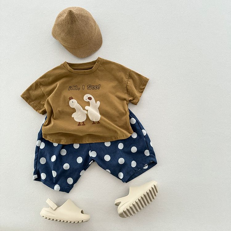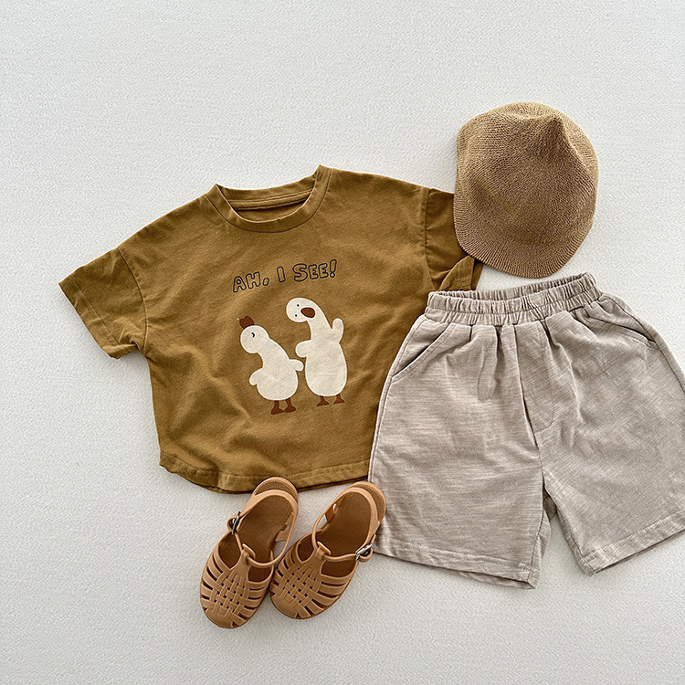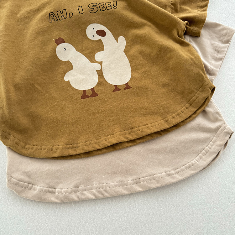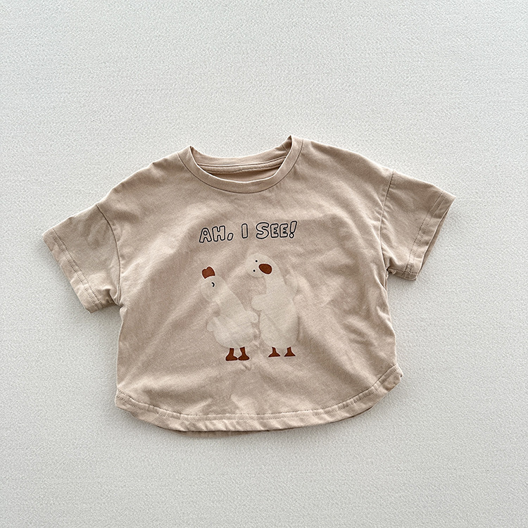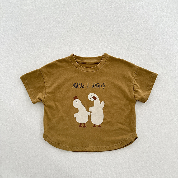 어린이 재미 있고 귀여운 ~ 여름 어린이 만화 짧은 소매 티셔츠의 한국 버전 소년 소녀 아기 외국 스타일 사랑스러운 오리 프린트 하프 슬리브 탑