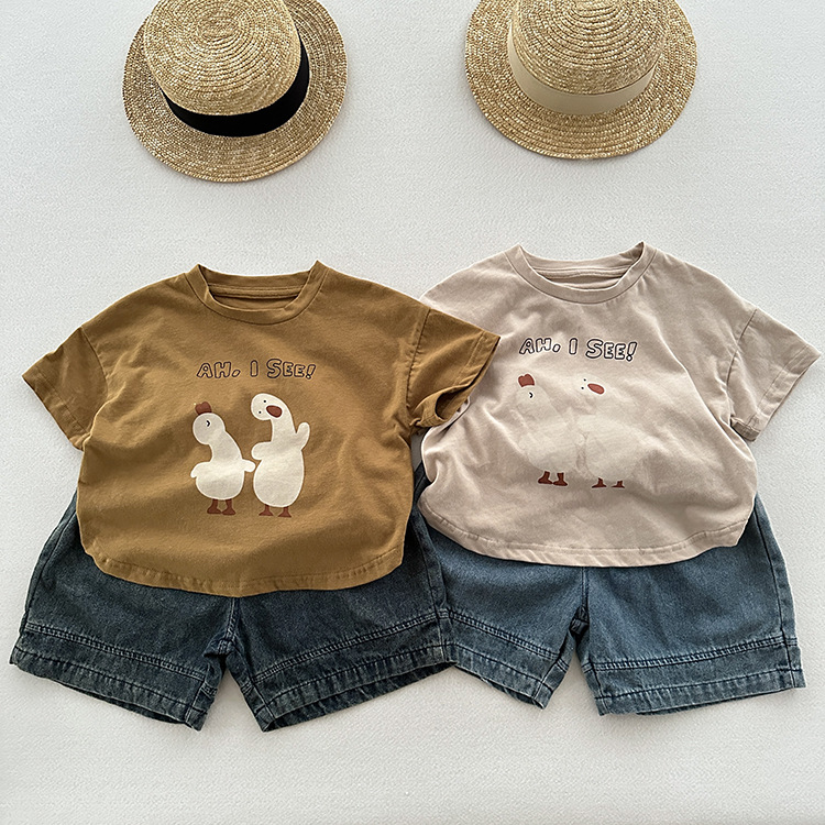어린이 재미 있고 귀여운 ~ 여름 어린이 만화 짧은 소매 티셔츠의 한국 버전 소년 소녀 아기 외국 스타일 사랑스러운 오리 프린트 하프 슬리브 탑스토어 가기