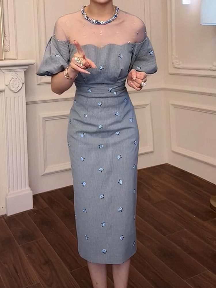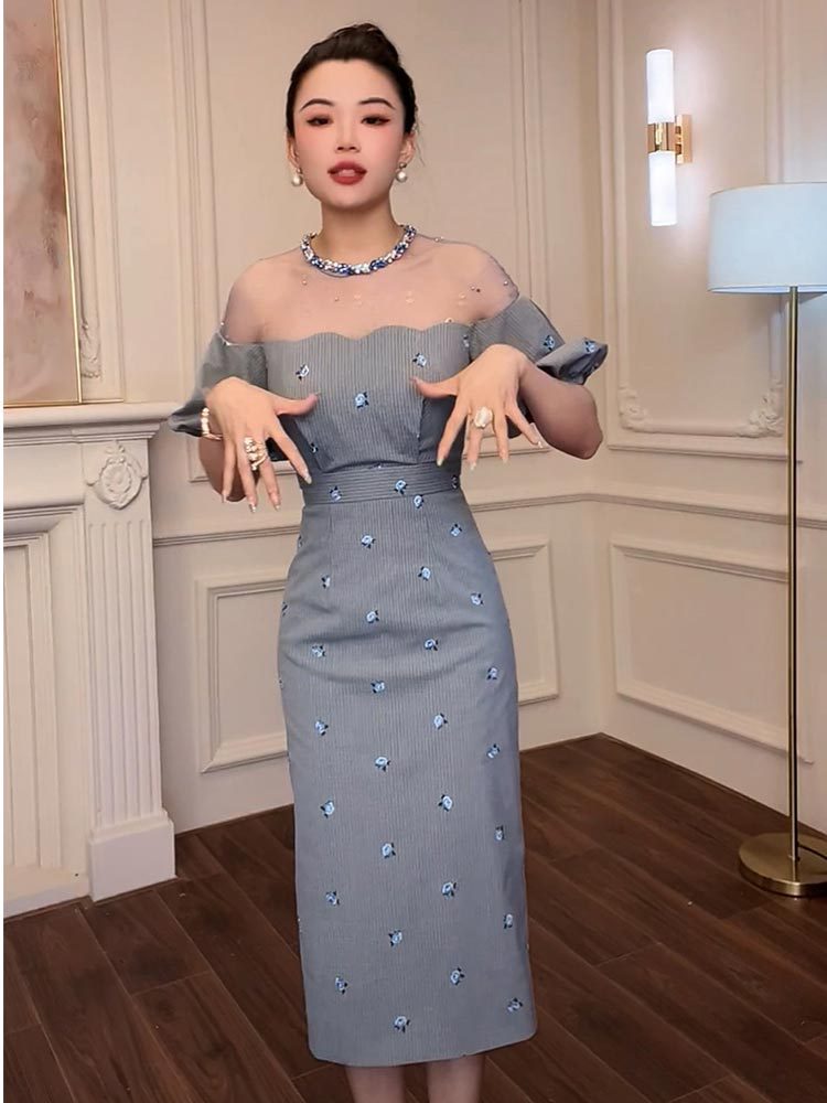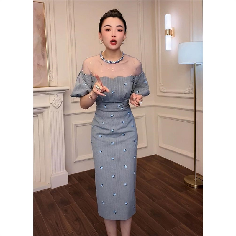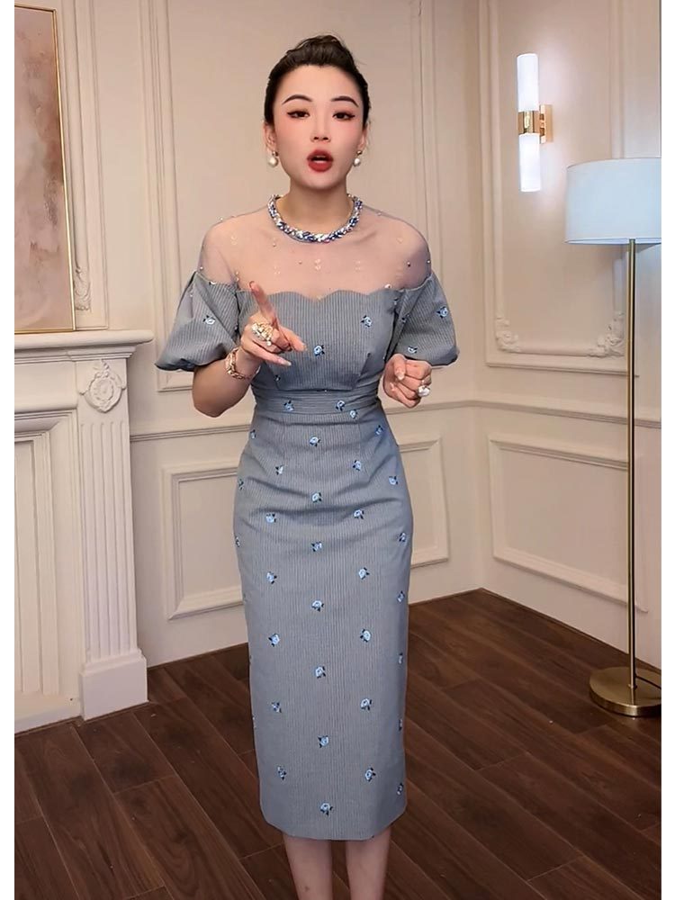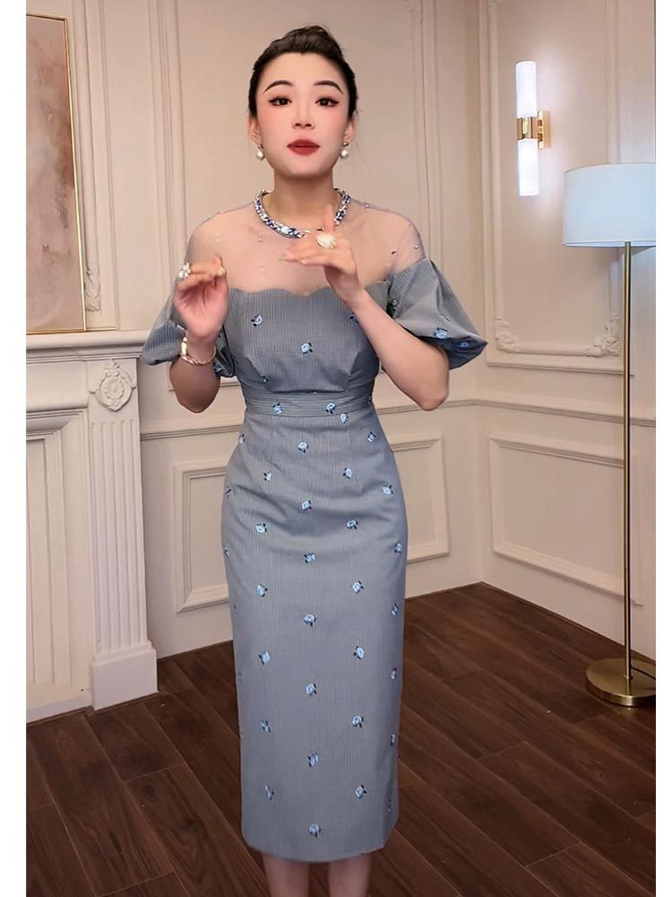 YT051207 프랑스 하이 엔드 슈퍼 잘 생긴 고급 절묘한 틈새 디자인 인쇄 스티칭 버블 슬리브 원피스