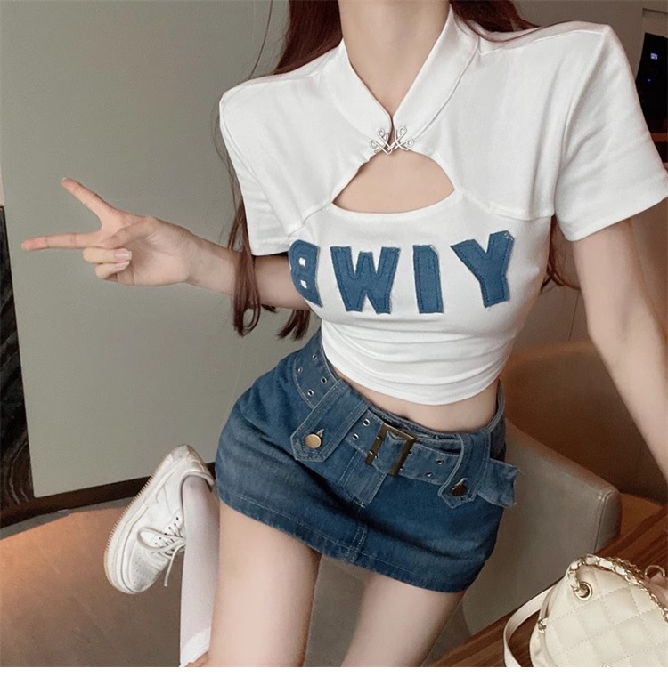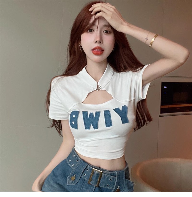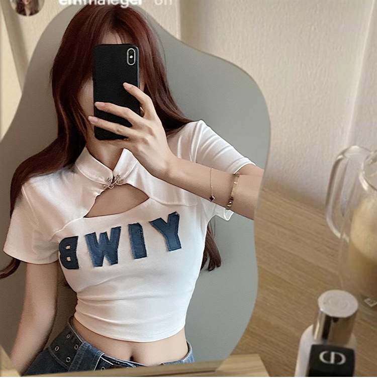 티셔츠 여성 여름 중국 스타일 최고 세련된 달콤하고 매운 할로우 디자인 센스 청삼 칼라 순수한 욕망 스타일 슬림 핏 짧은 반팔 Ins스토어 가기