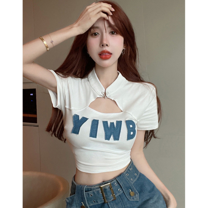 티셔츠 여성 여름 중국 스타일 최고 세련된 달콤하고 매운 할로우 디자인 센스 청삼 칼라 순수한 욕망 스타일 슬림 핏 짧은 반팔 Ins