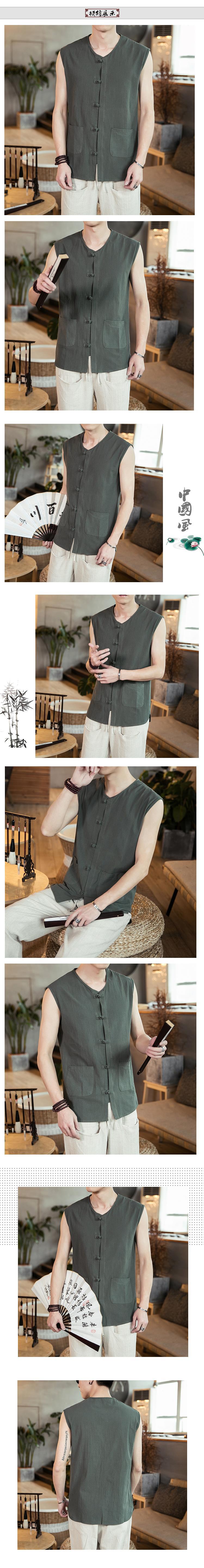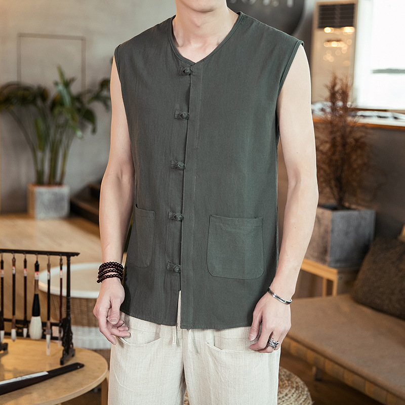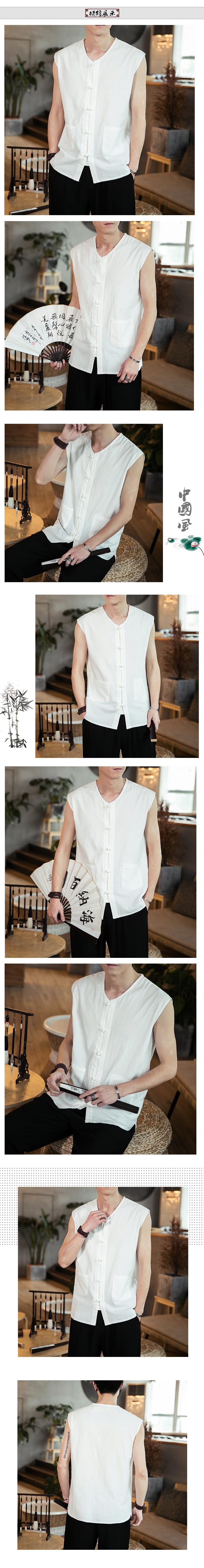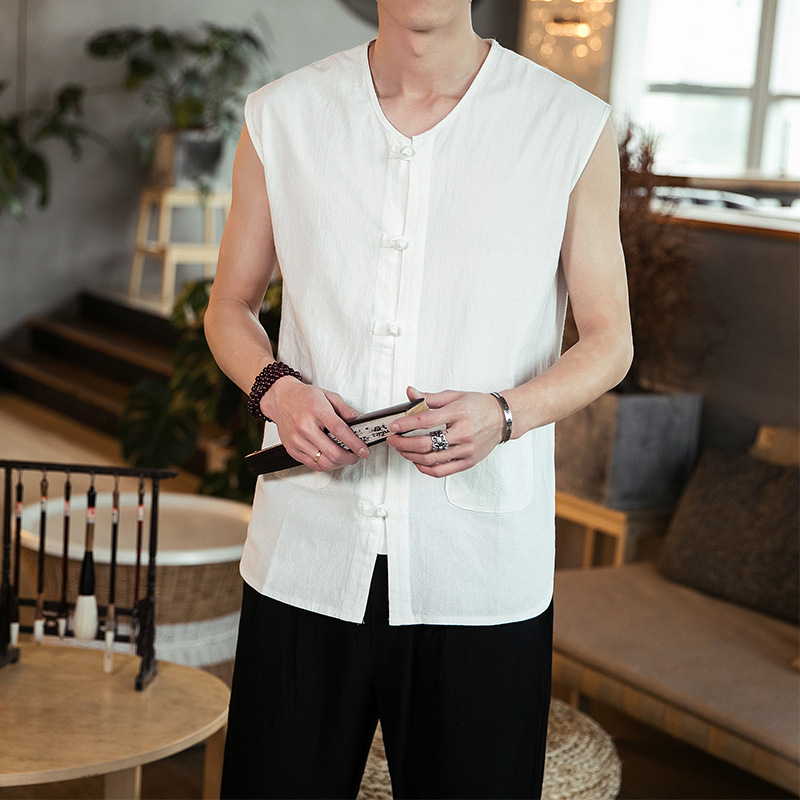 여름 중국 스타일 코튼 리넨 민소매 셔츠 남성용 루즈 레트로 버클 조끼 셔츠 플러스 사이즈 탕 세트 한푸 조끼스토어 가기