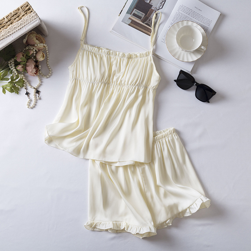 국경 간 여름 아이스 실크 파자마 여성용 얇은 슬링 반바지 파자마 투피스 세트 가슴 패드 순수 욕망 스타일 홈 옷