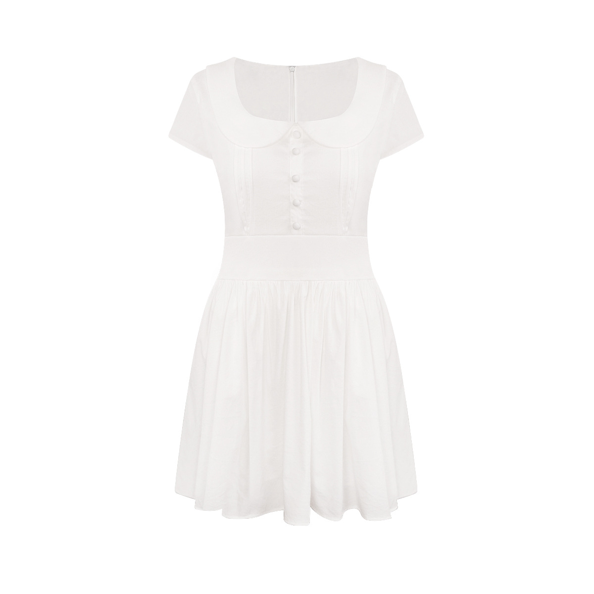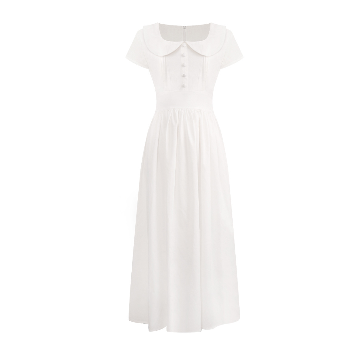 백차 소녀 스타일 프렌치 스타일의 부드러운 여성스러운 인형 칼라 허리라인 드레스 달콤한 스타일 주름진 반팔 롱 드레스