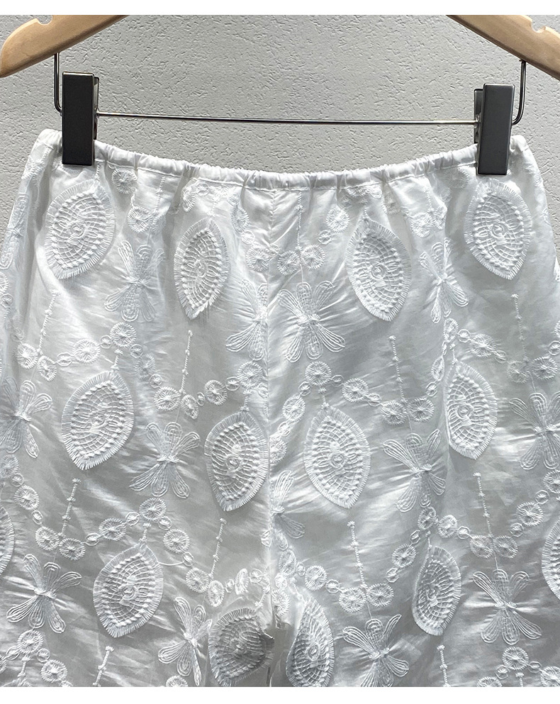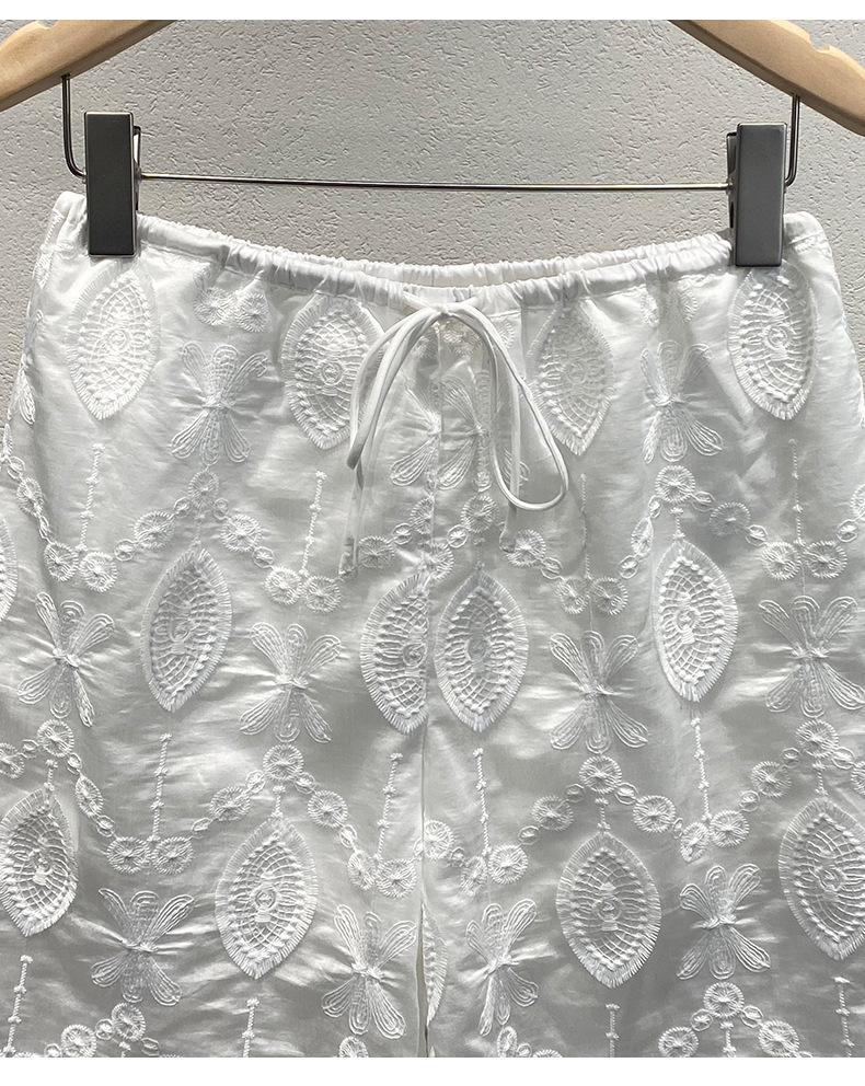 틈새 2024 여름 여성을위한 새로운 화이트 타이트 허리 레이스 업 자수 레이스 반바지