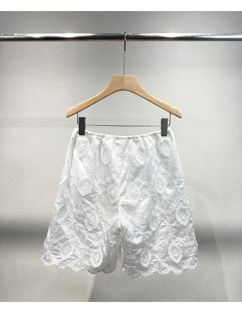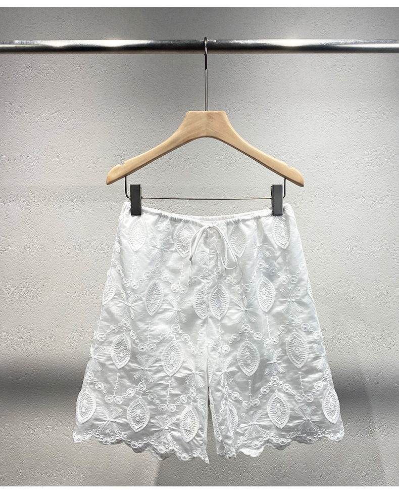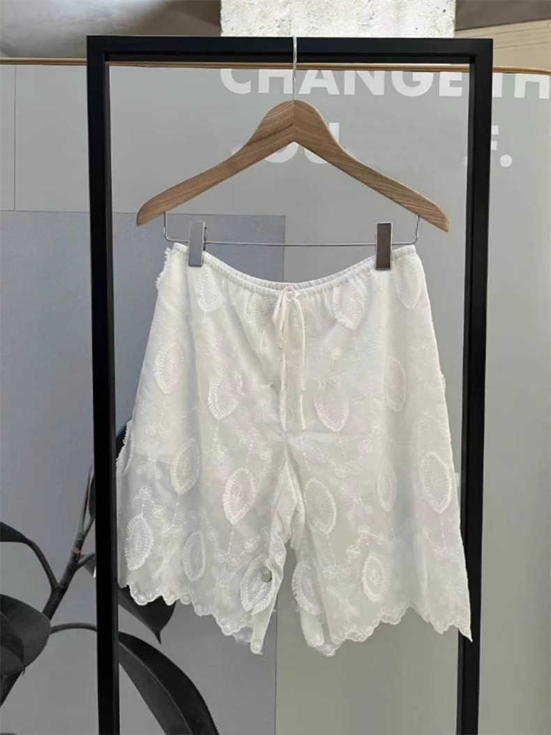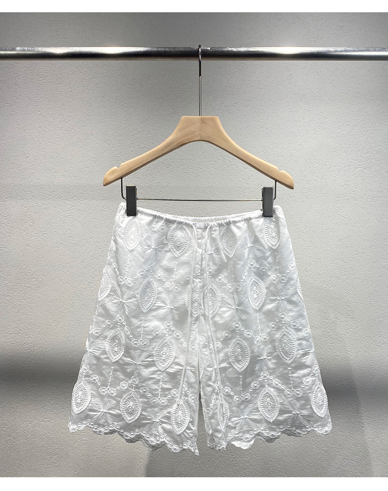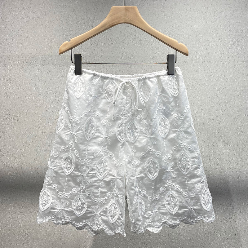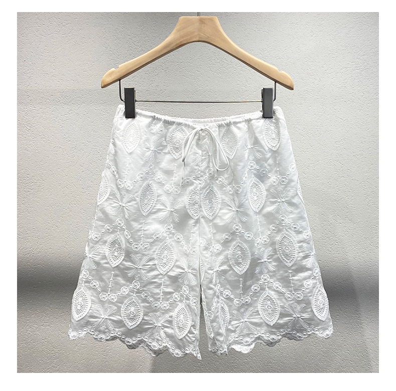 틈새 2024 여름 여성을위한 새로운 화이트 타이트 허리 레이스 업 자수 레이스 반바지스토어 가기
