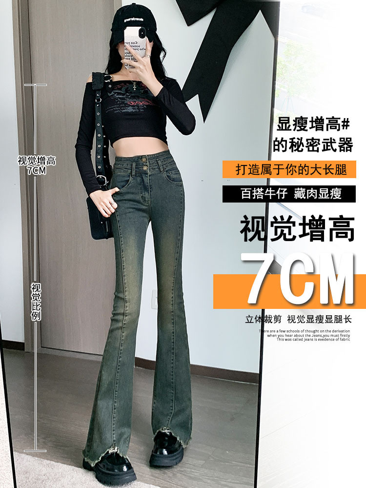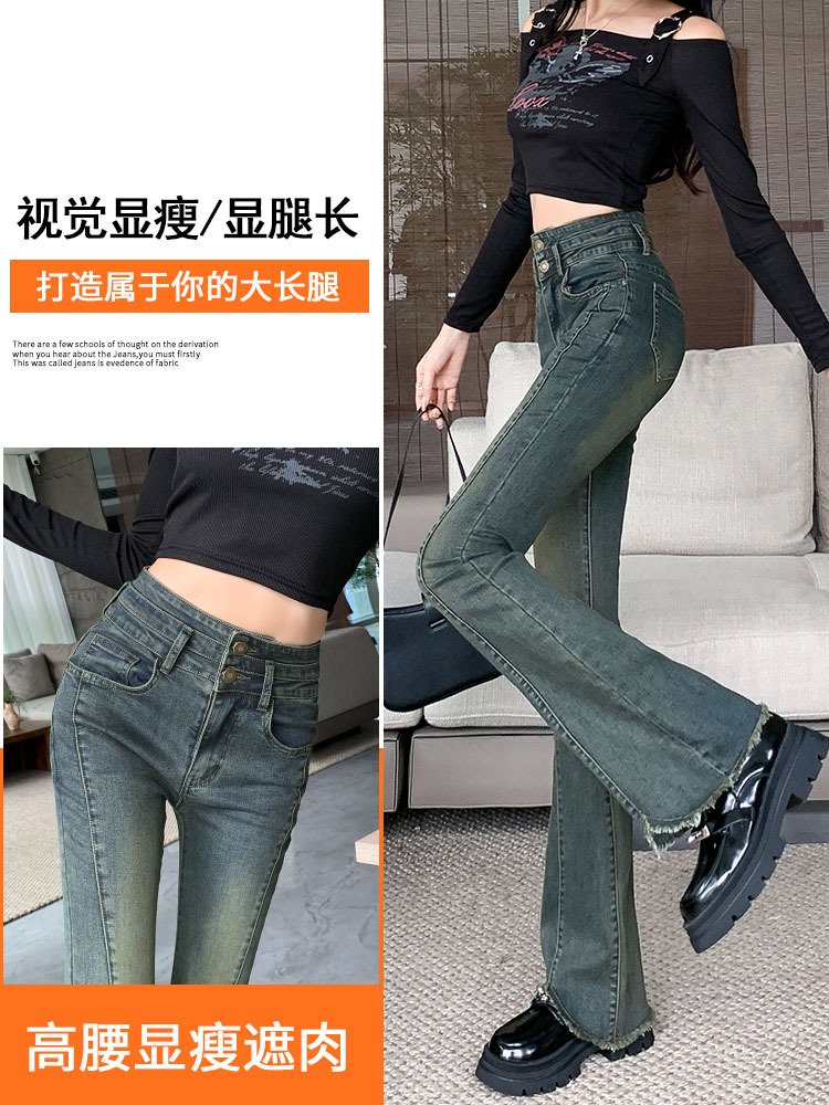 시멘트 회색 약한 청바지 여성의 봄과 가을 높은 허리 더블 버클 벨리 투쿠 노스톨 레트로 홍콩 스타일 랩 호스 슈 바닥 바지스토어 가기