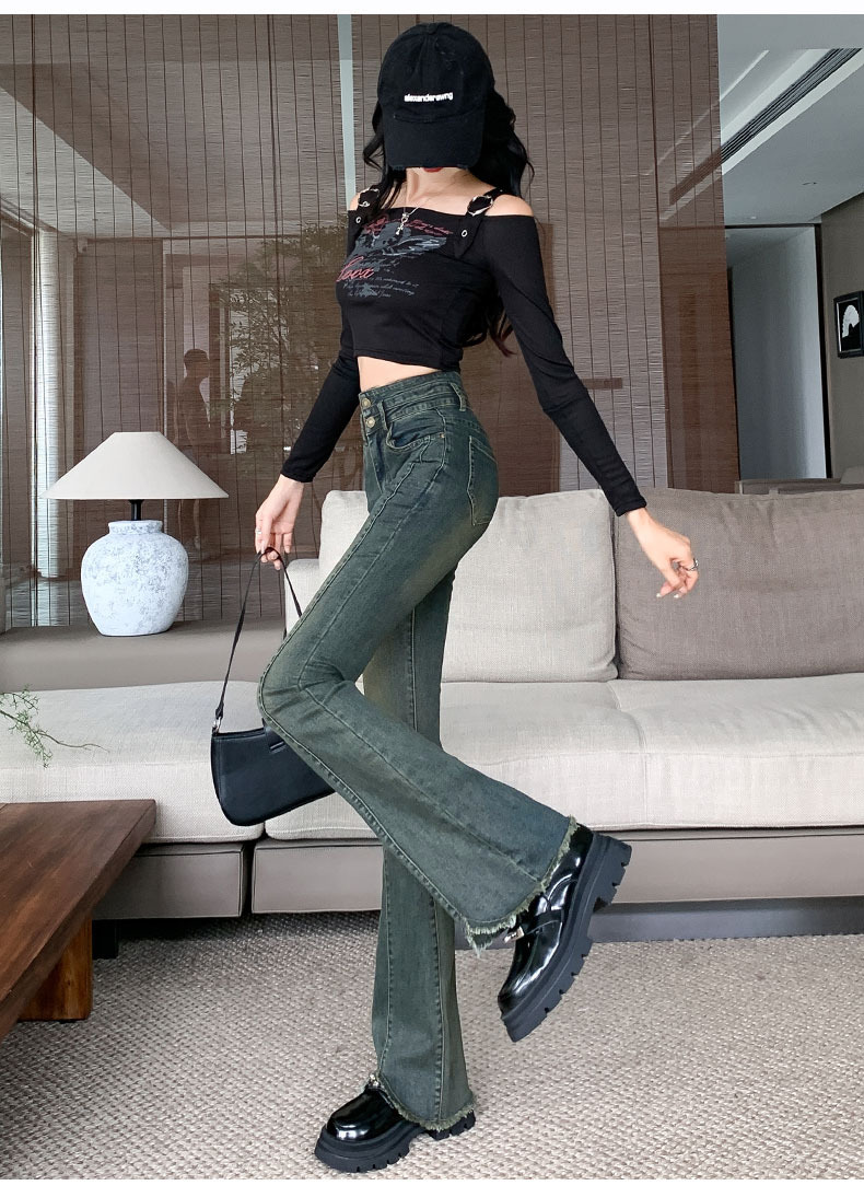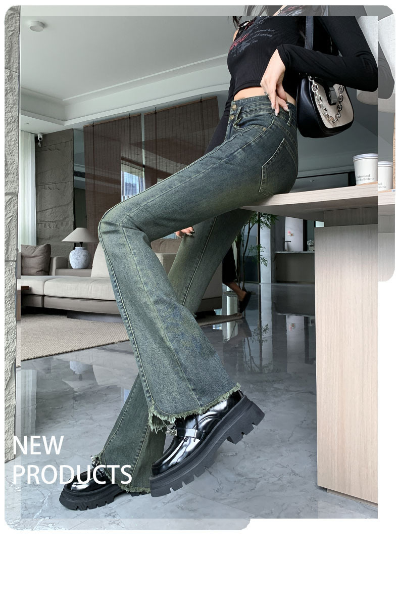 시멘트 회색 약한 청바지 여성의 봄과 가을 높은 허리 더블 버클 벨리 투쿠 노스톨 레트로 홍콩 스타일 랩 호스 슈 바닥 바지