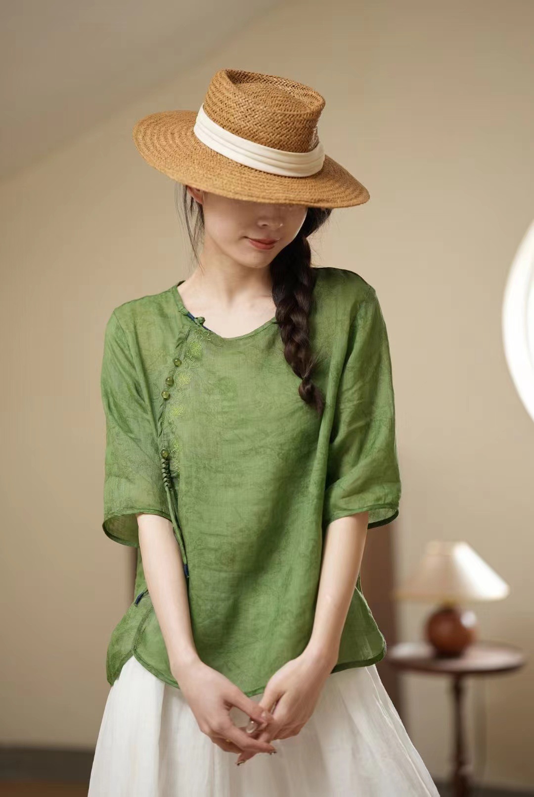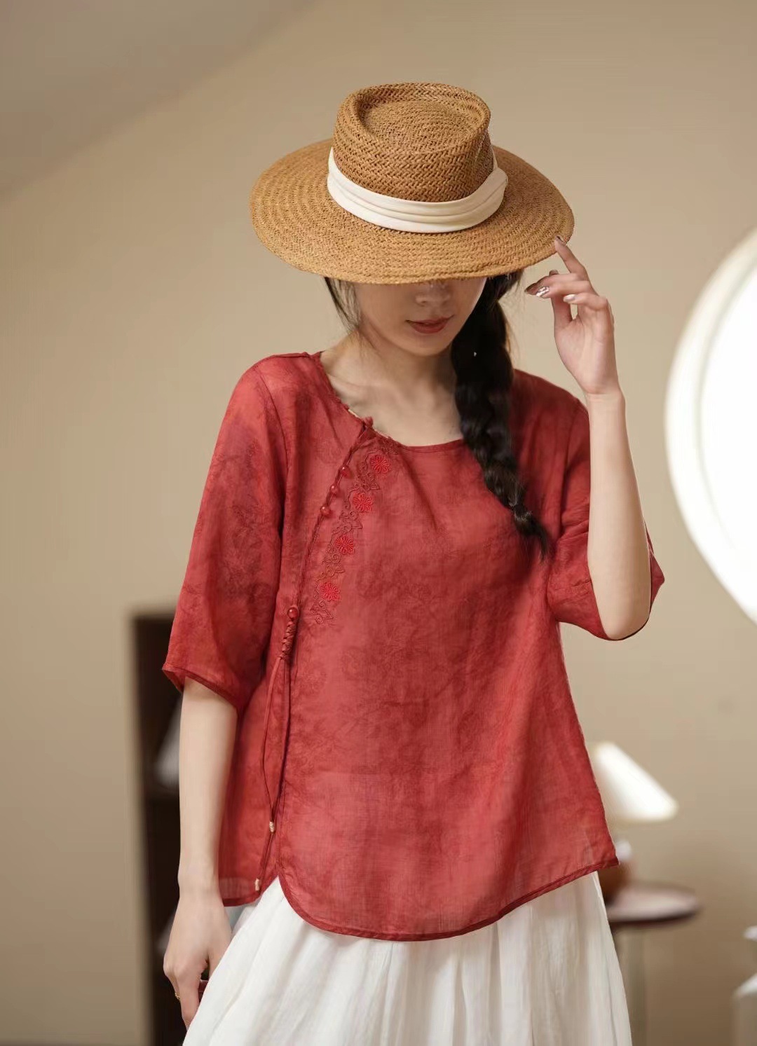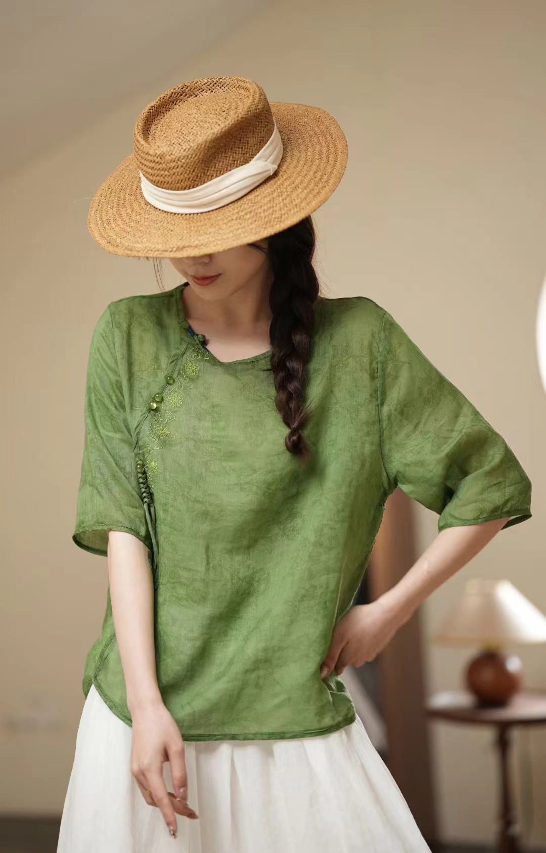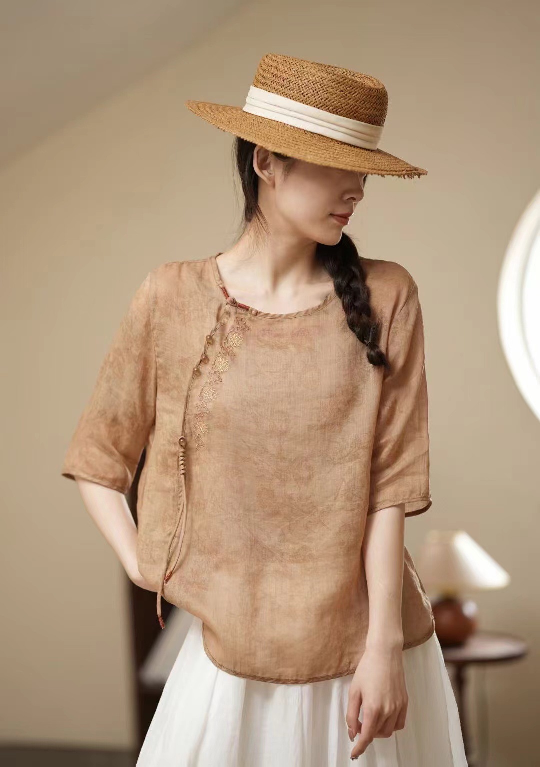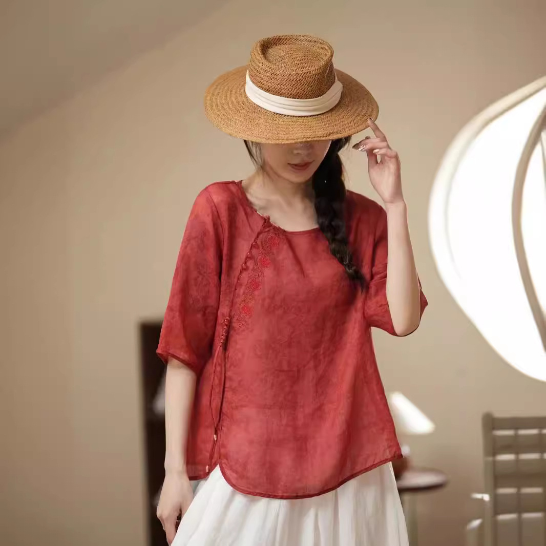 새로운 중국 스타일 라미 자카드 라운드 넥 하프 슬리브 셔츠 2024 여름 슬랜트 플랩 버튼 레트로 스타일 경량 여성용 탑스토어 가기