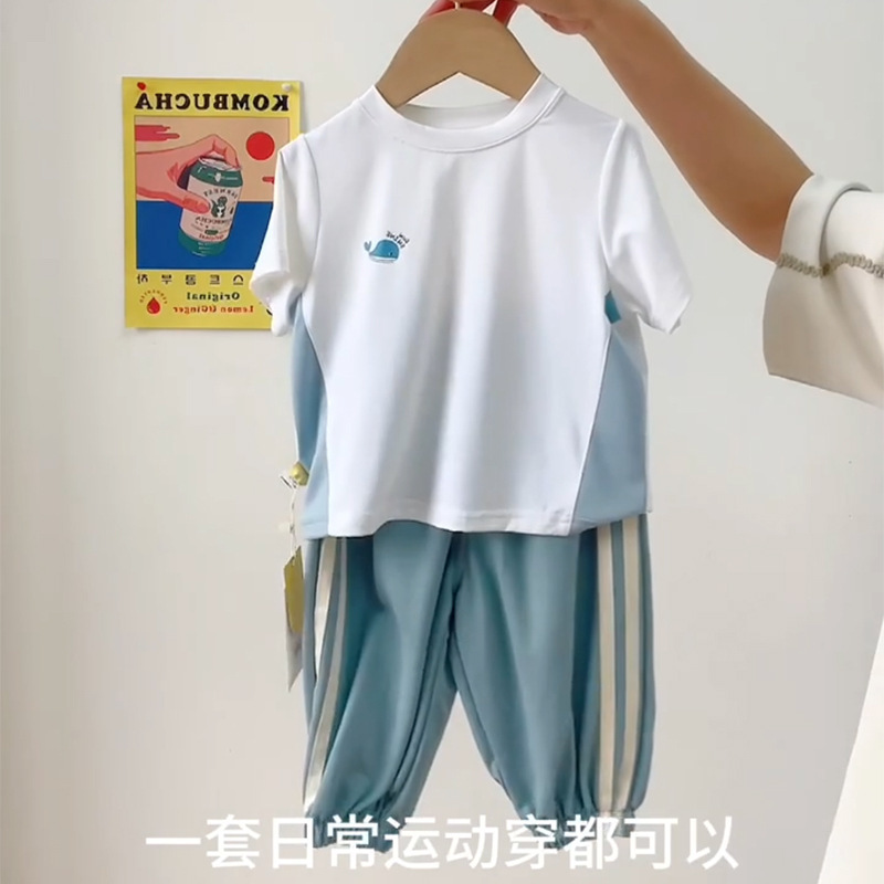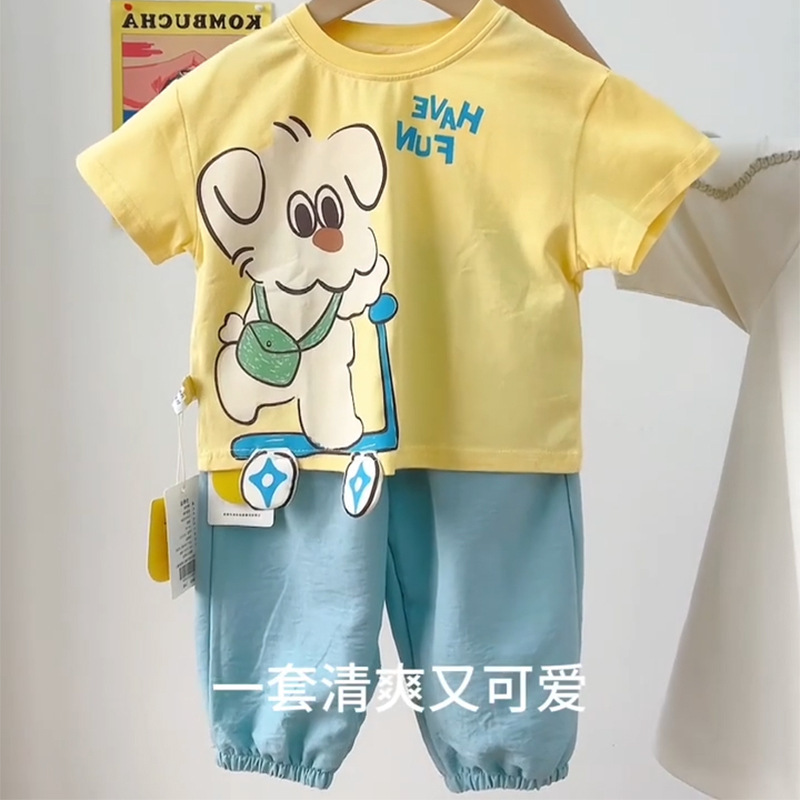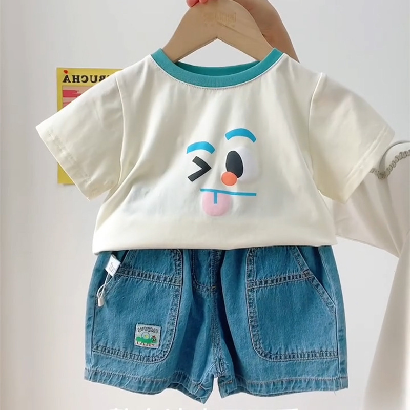[6 세트 착용] 낙서 가족 어린이 청바지 여름 티셔츠 아기 반팔 반바지 여름 아기 바지