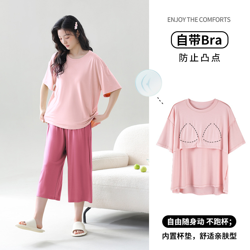 [시원한 느낌] 가슴 패드 새로운 잠옷 여성 모달 여름 반팔 바지 캐주얼 여성의 얇은 홈 의류