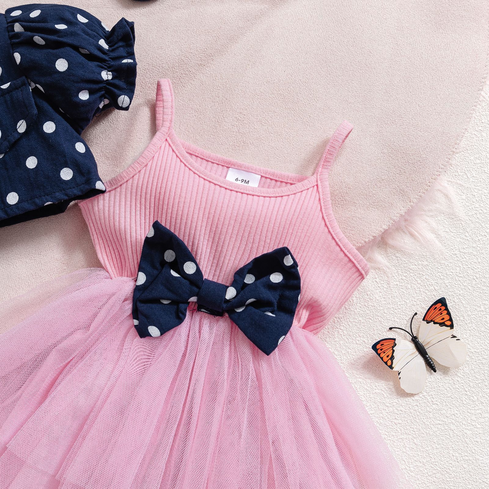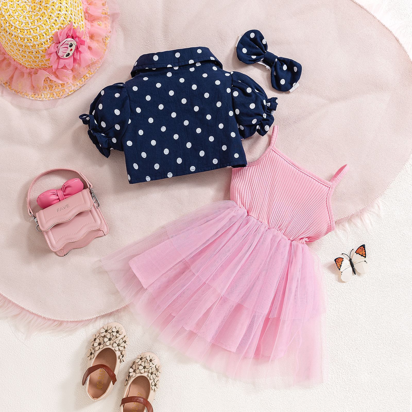 국경을 넘나 드는 유럽과 미국의 걸스 세트 웨이브 도트 버블 슬링 앤 보우 거즈 스커트 걸스 3 피스 세트가있는 반팔 재킷스토어 가기