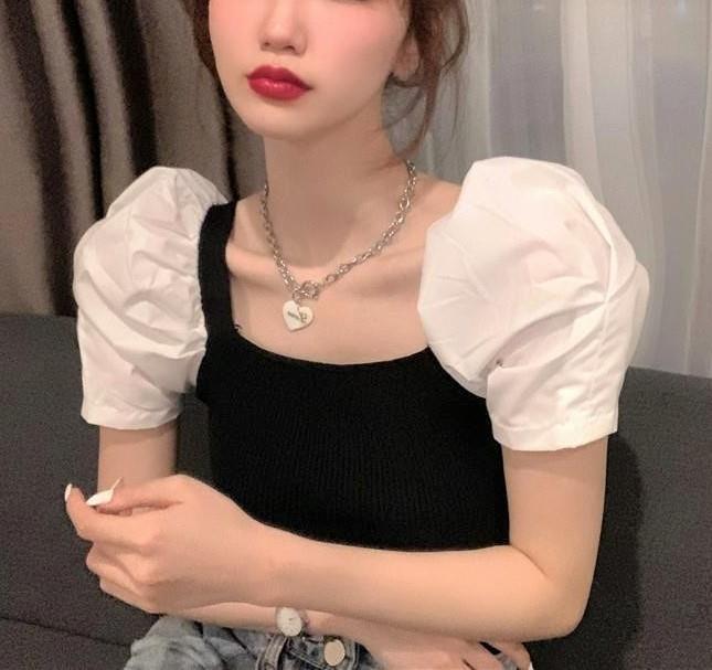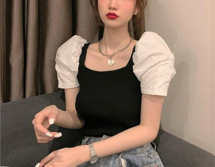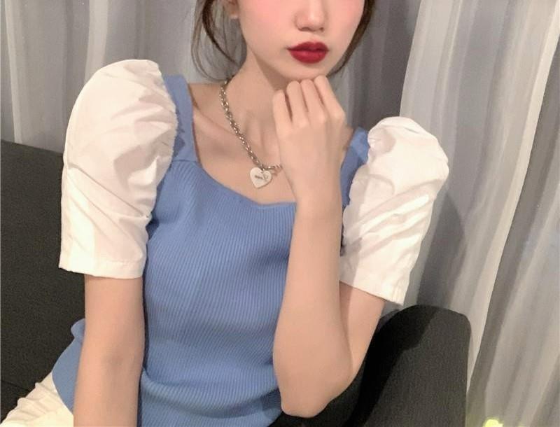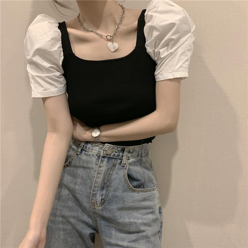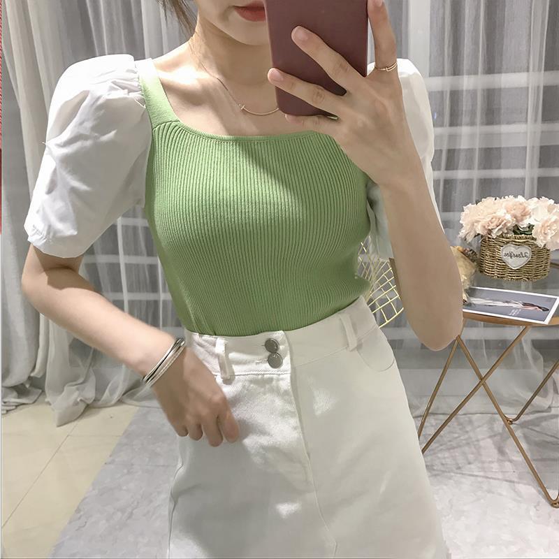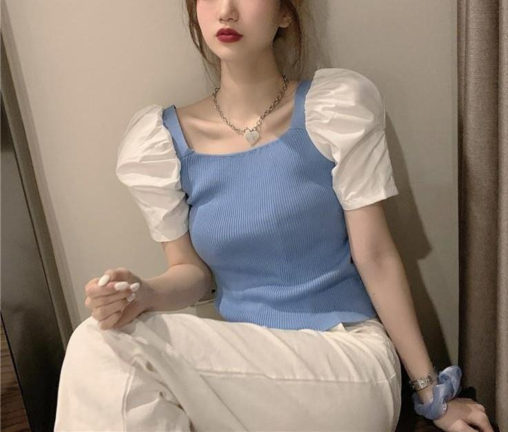 2025 봄 신상 인기 인스타 스타일 퍼프 소매 스퀘어 넥 다용도 탑 반팔 배색 니트 티셔츠 여성복스토어 가기