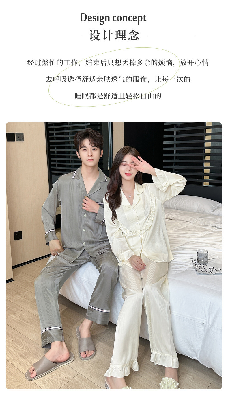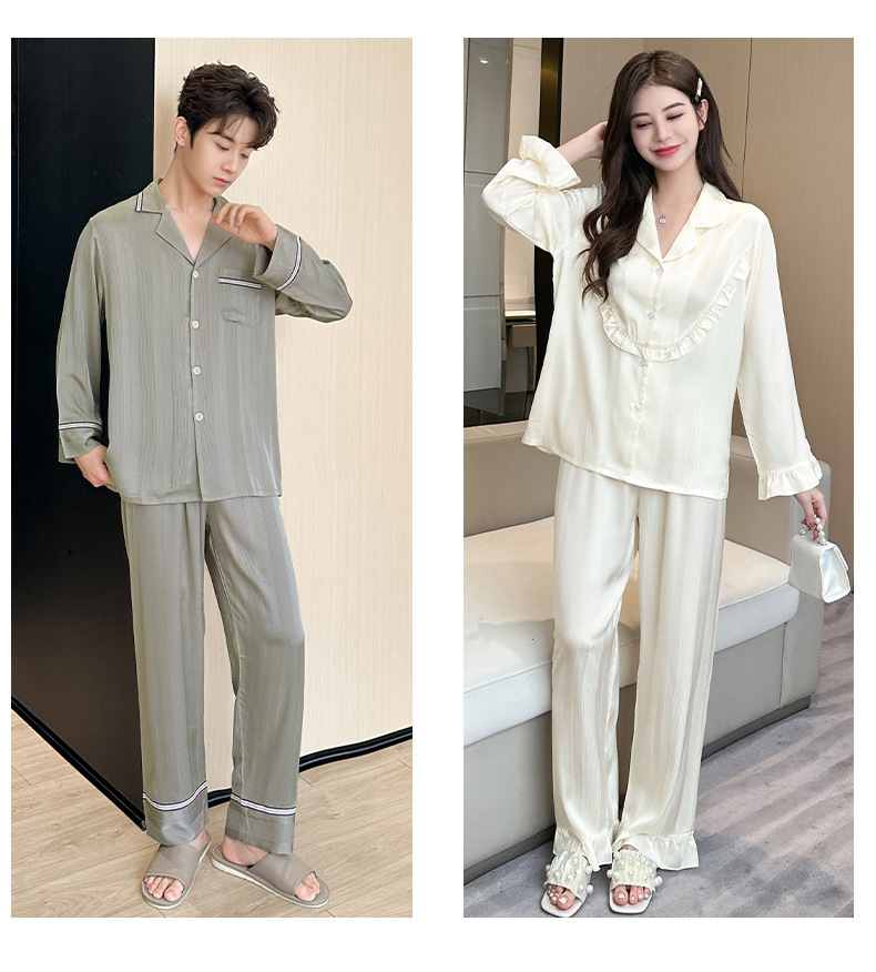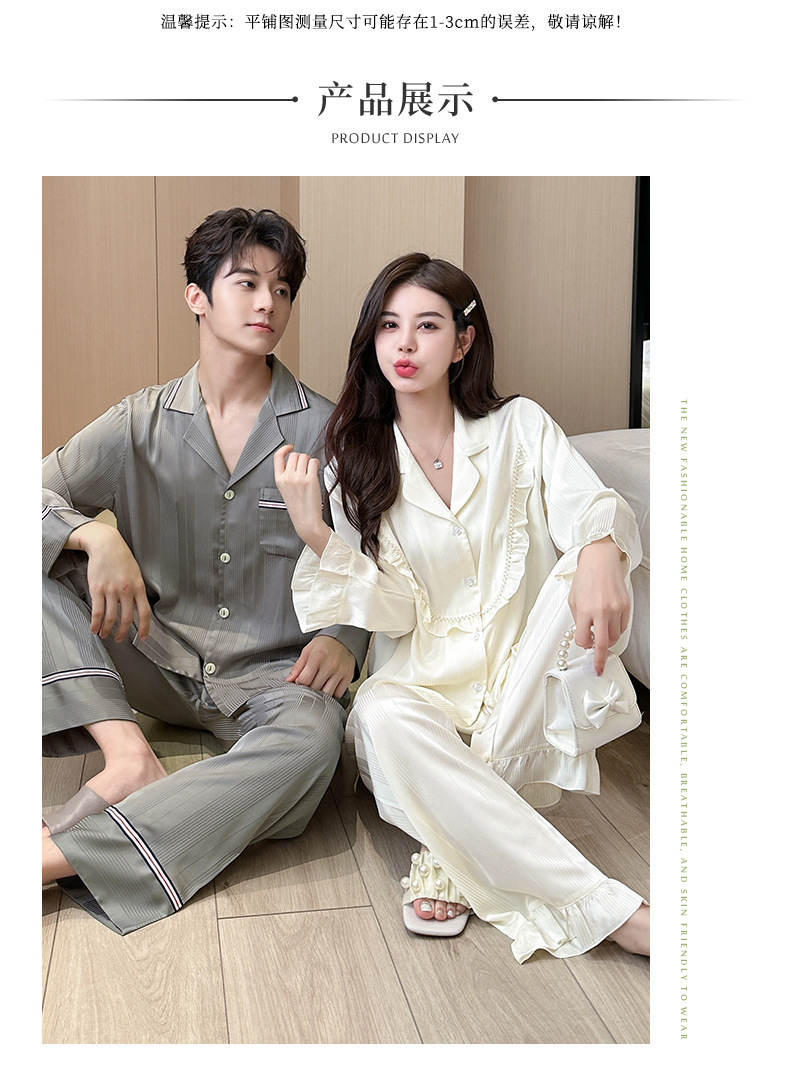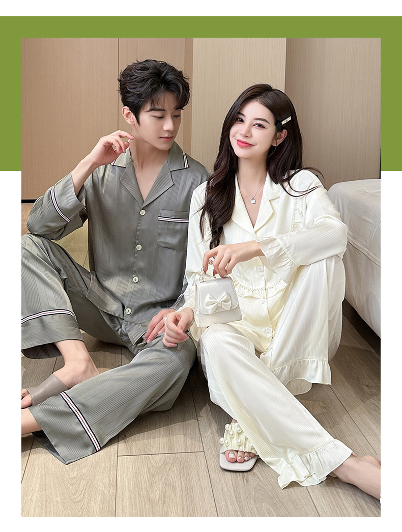 2024 봄과 가을 새 커플 잠옷 아이스 실크 얇은 긴팔 바지 2 피스 세트 남성과 여성의 줄무늬 인쇄 홈