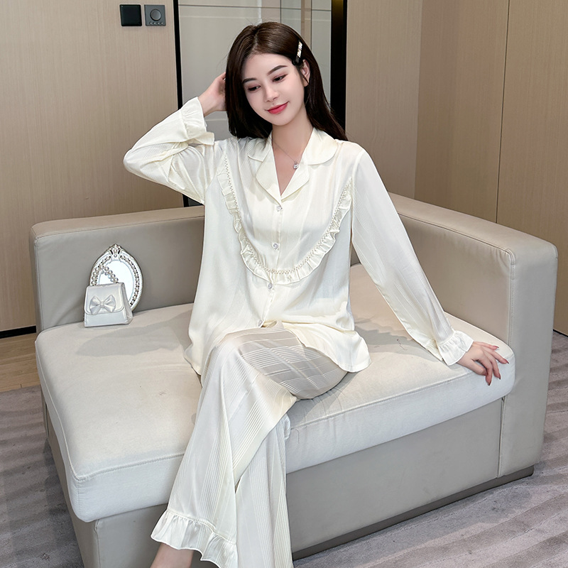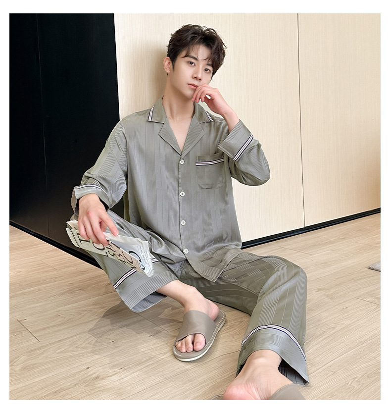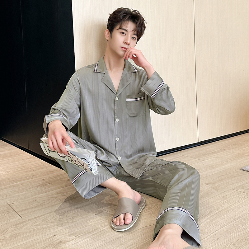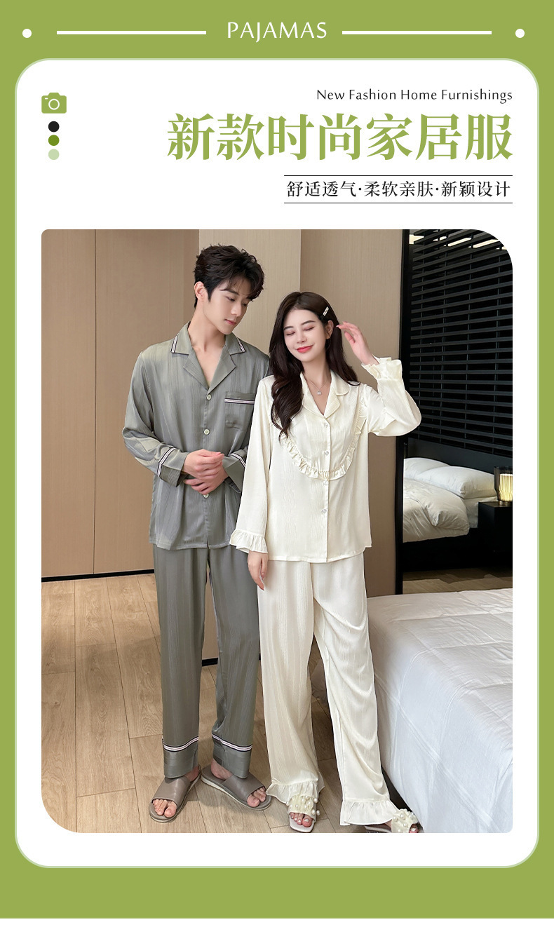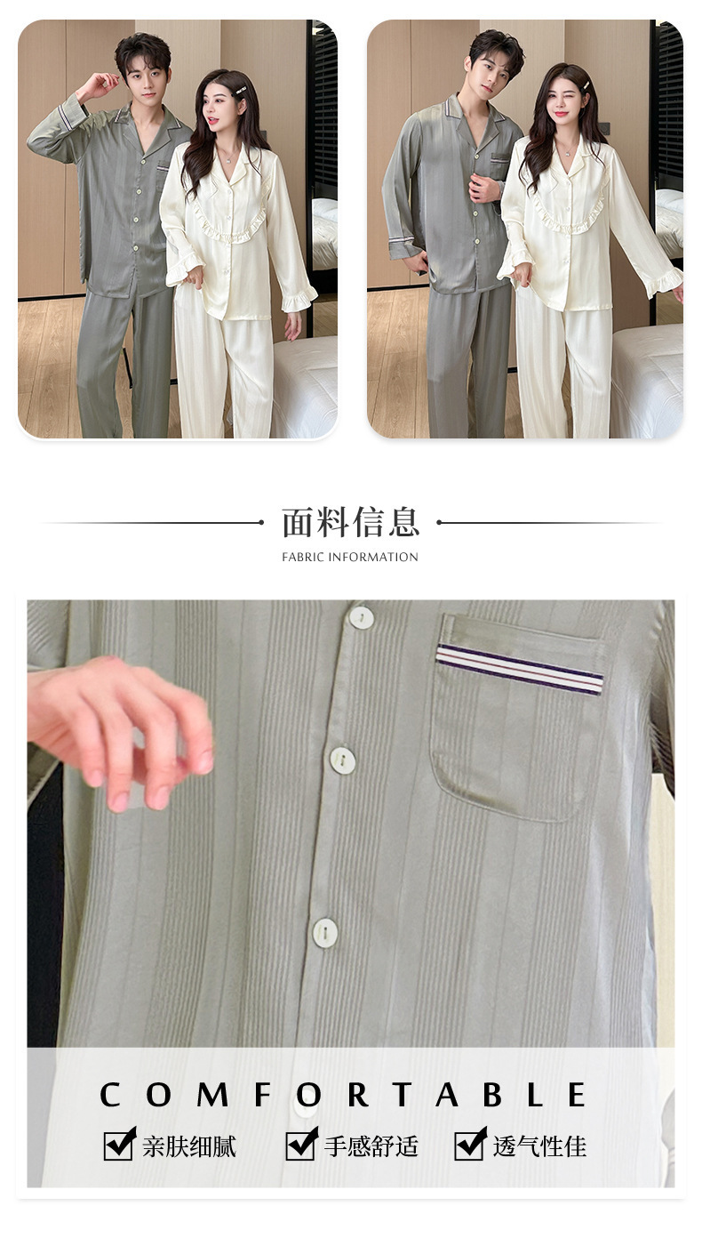 2024 봄과 가을 새 커플 잠옷 아이스 실크 얇은 긴팔 바지 2 피스 세트 남성과 여성의 줄무늬 인쇄 홈