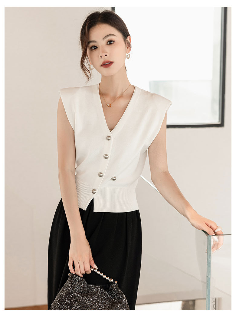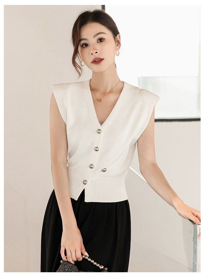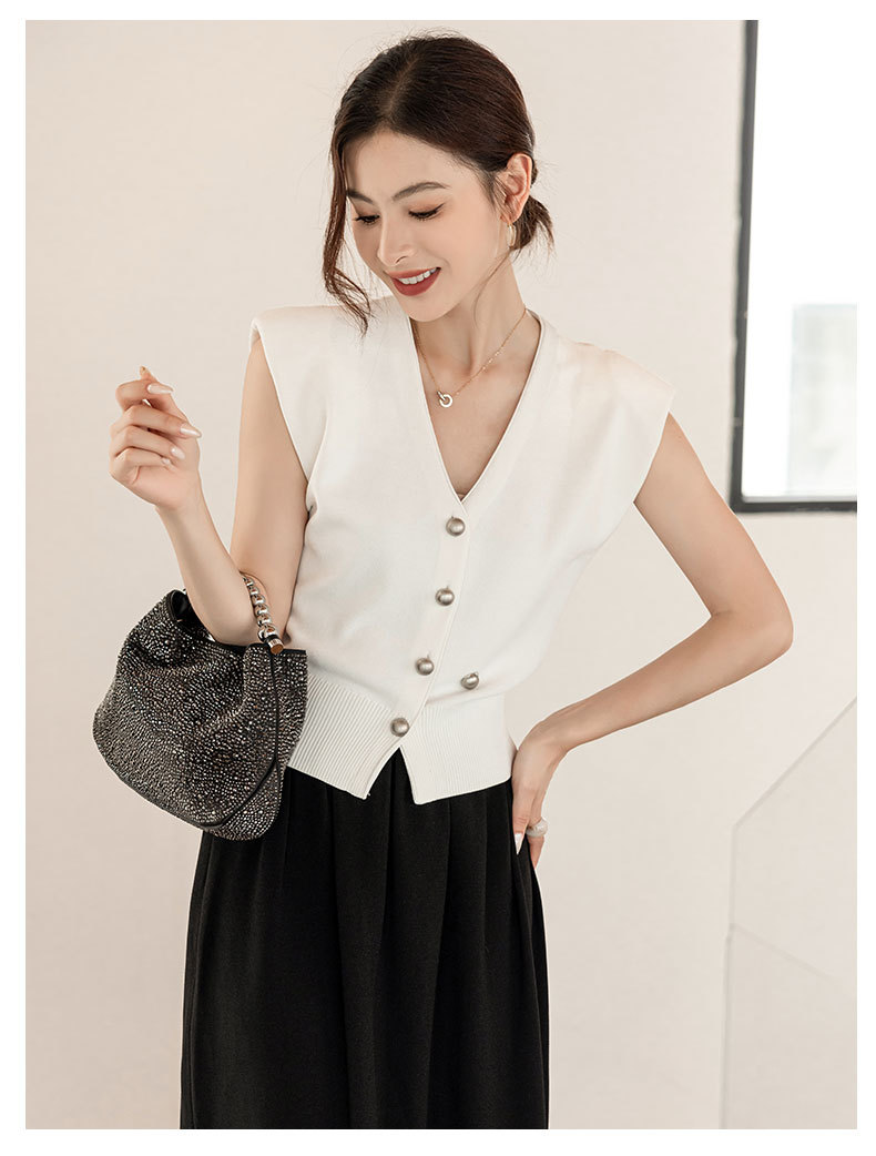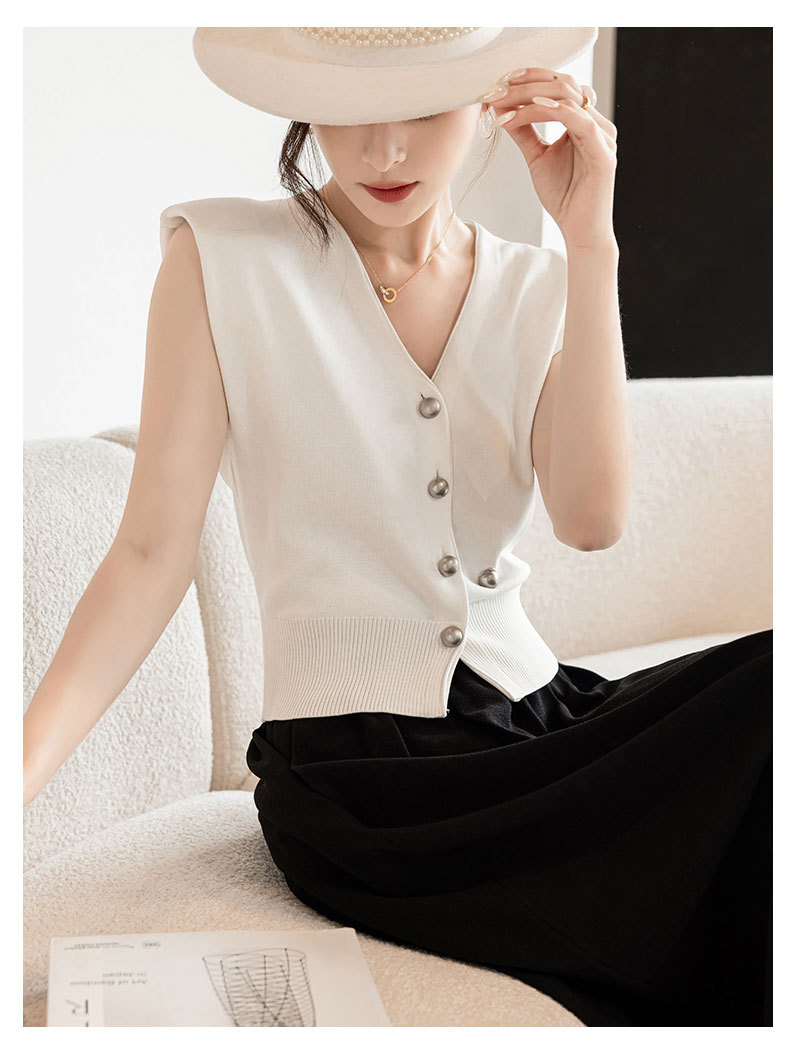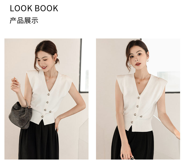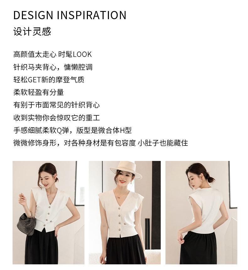엔디 니트 조끼 여자 2024 년 여름 새로운 금속 대비 컬러 통근 리틀 V-넥 우아한 허리 코트