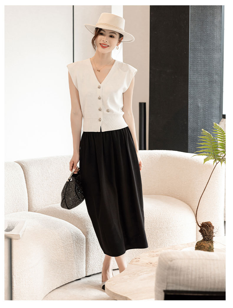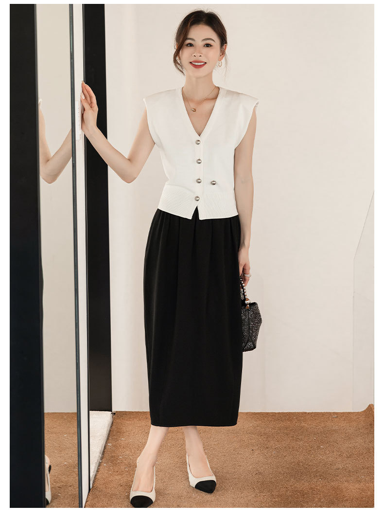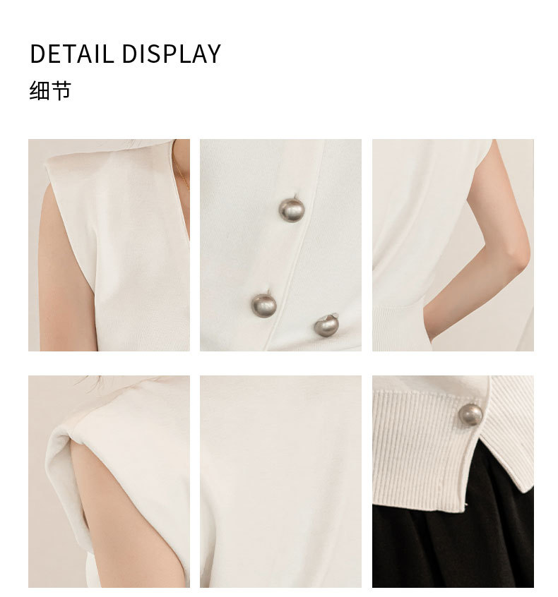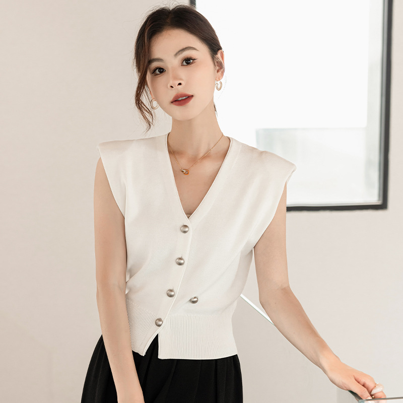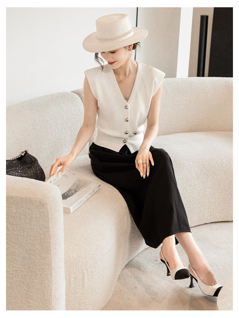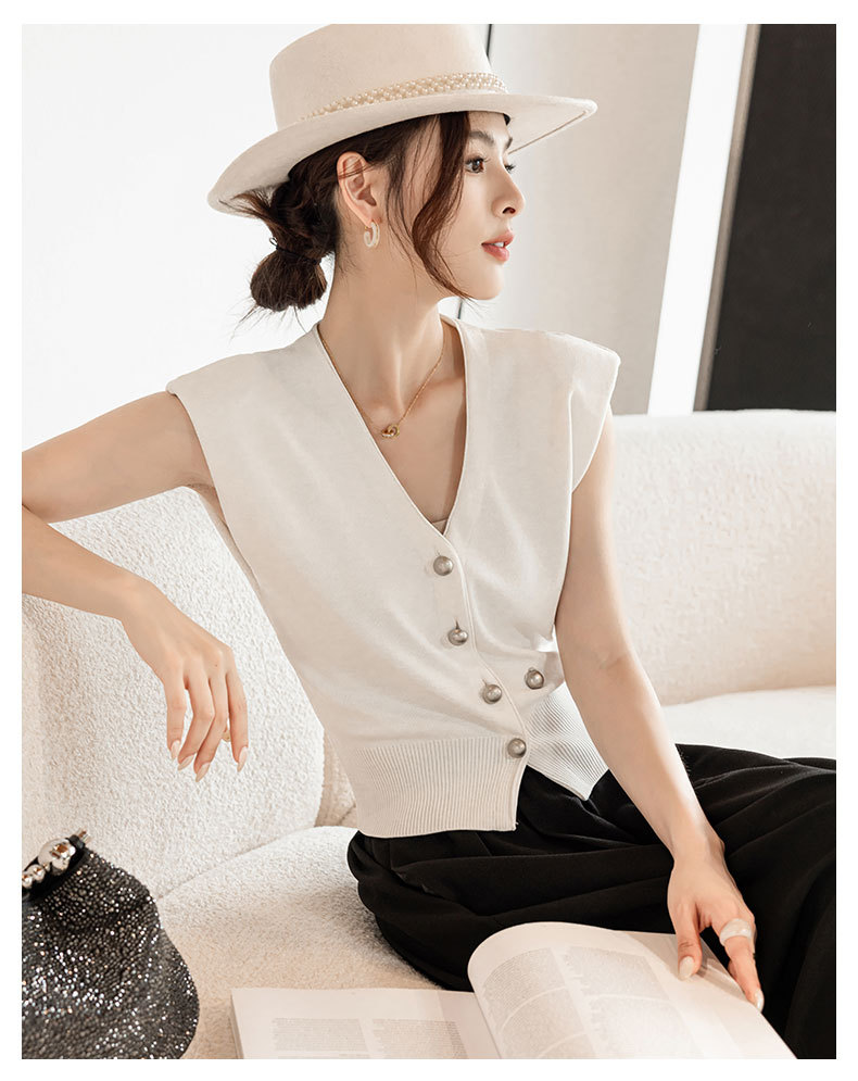 엔디 니트 조끼 여자 2024 년 여름 새로운 금속 대비 컬러 통근 리틀 V-넥 우아한 허리 코트