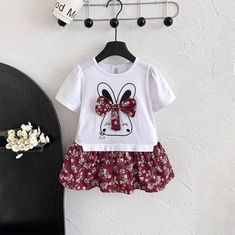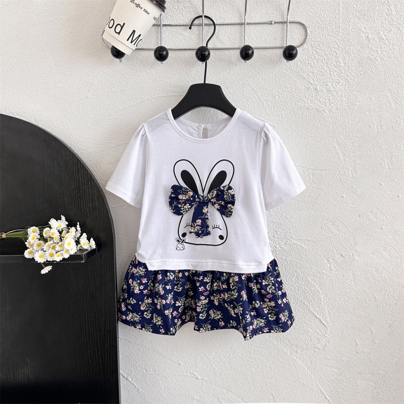 6278 소녀의 여름 인쇄 반팔 둥근 목 티셔츠 인쇄 활 패치 워크 꽃 인쇄 소녀의 여름 원피스