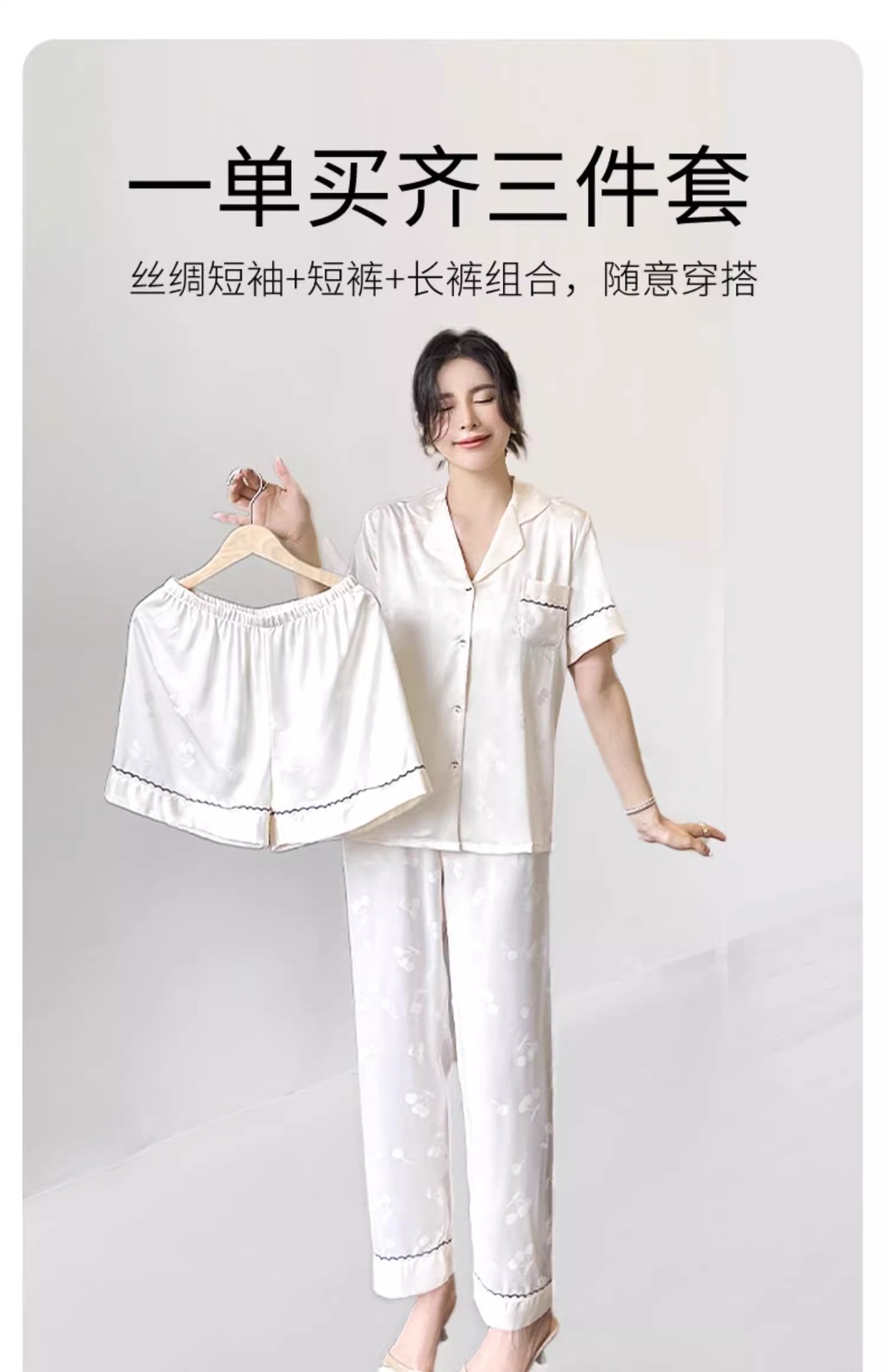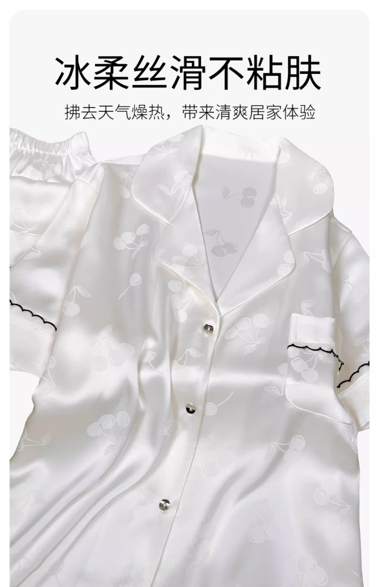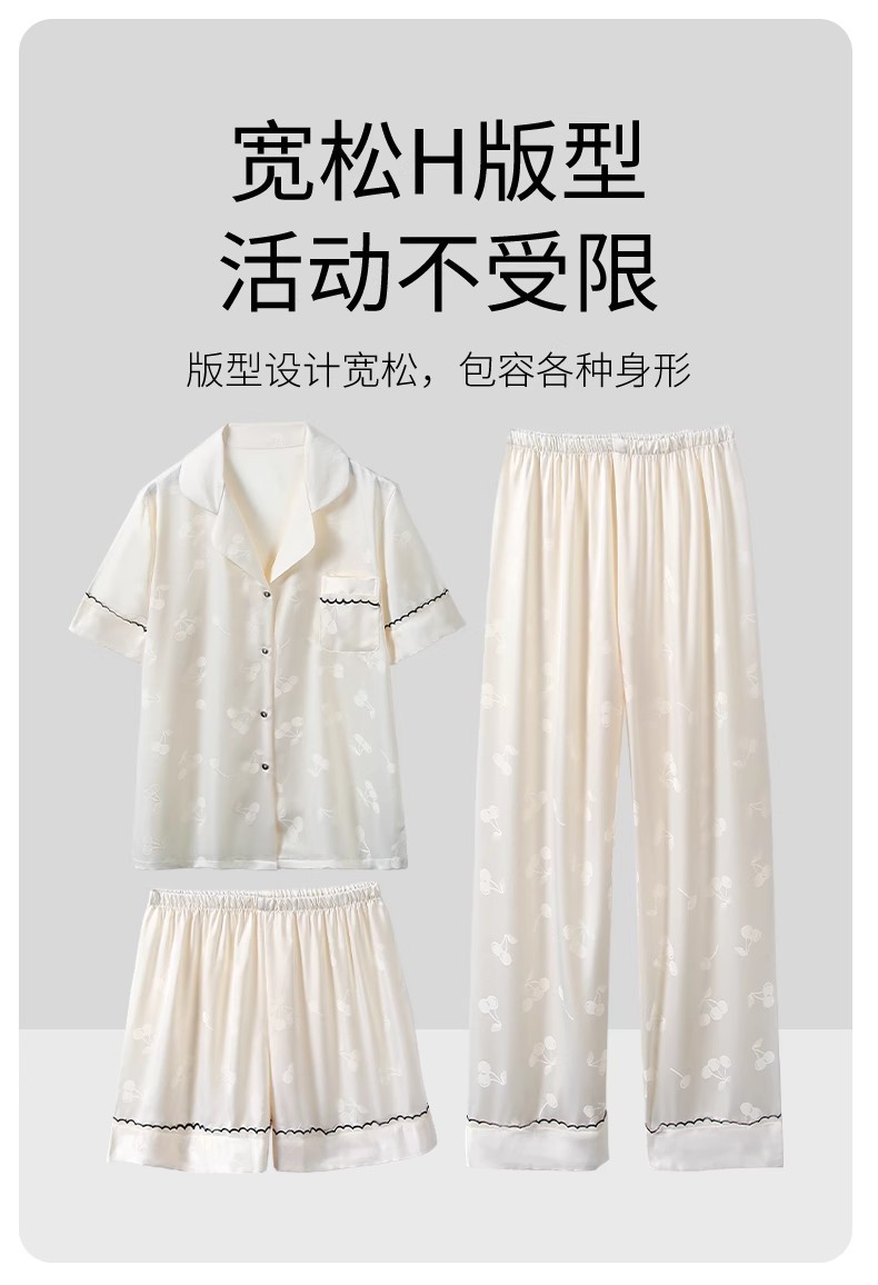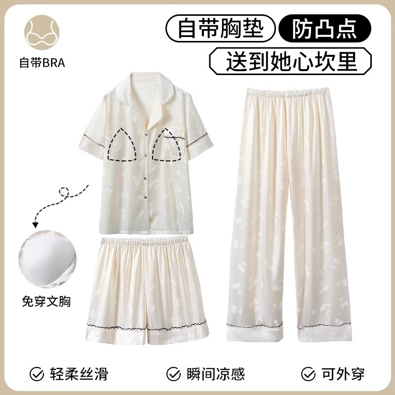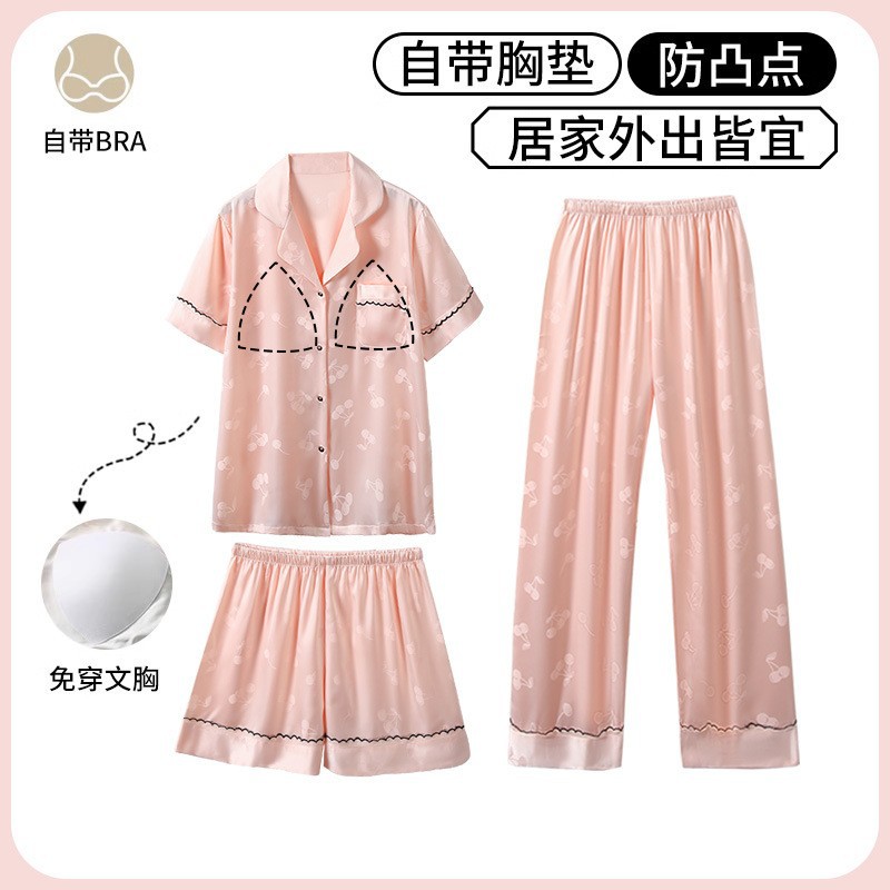 여성용 잠옷 여름 얼음 실크 3 피스 세트 시원한 실크 잠옷 홈웨어 여성 정장 귀여운 체리스토어 가기