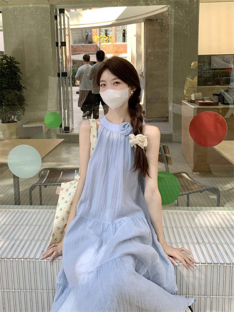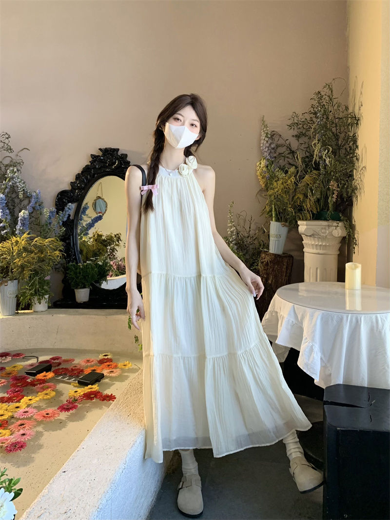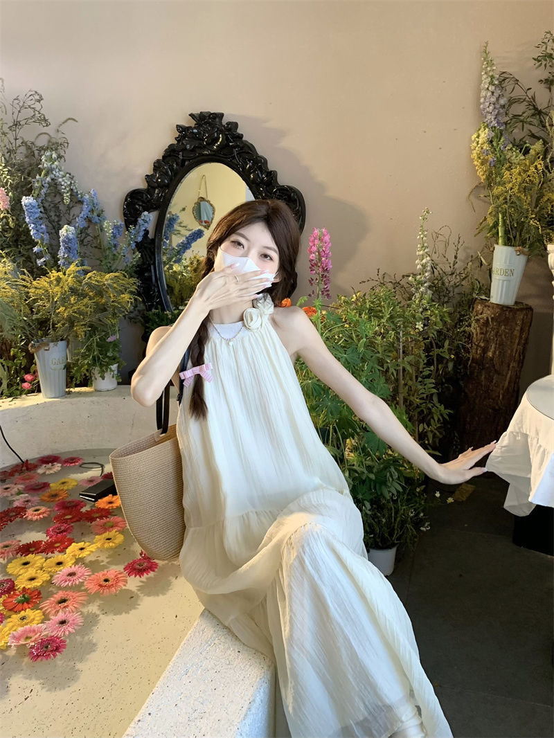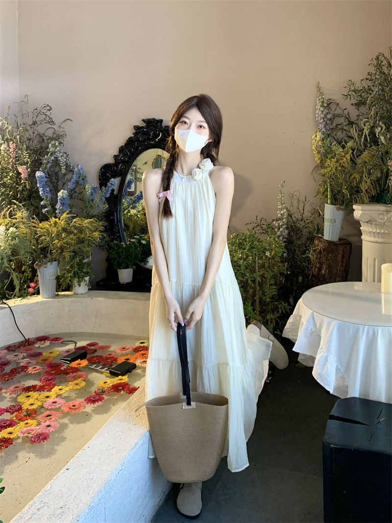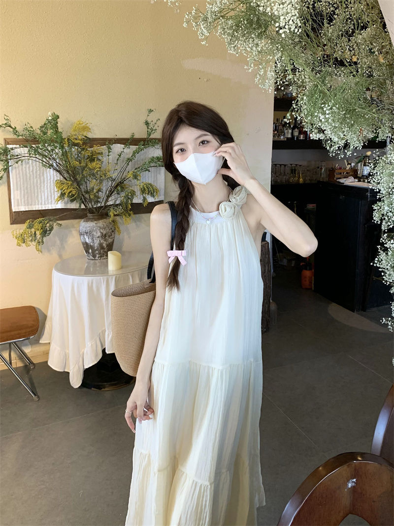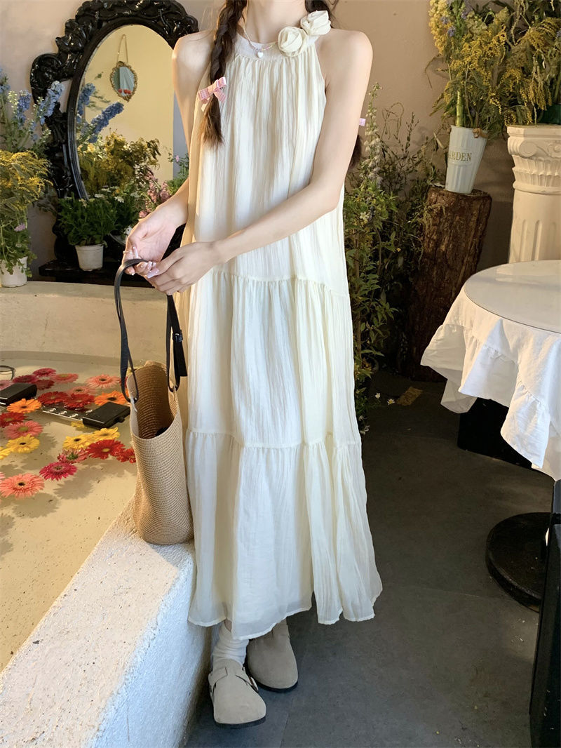 부드러운 스타일 입체 꽃 목 교수형 원피스 여성 여름 해변 휴일 요정 원피스 우아한 슬림 A 라인 긴 원피스