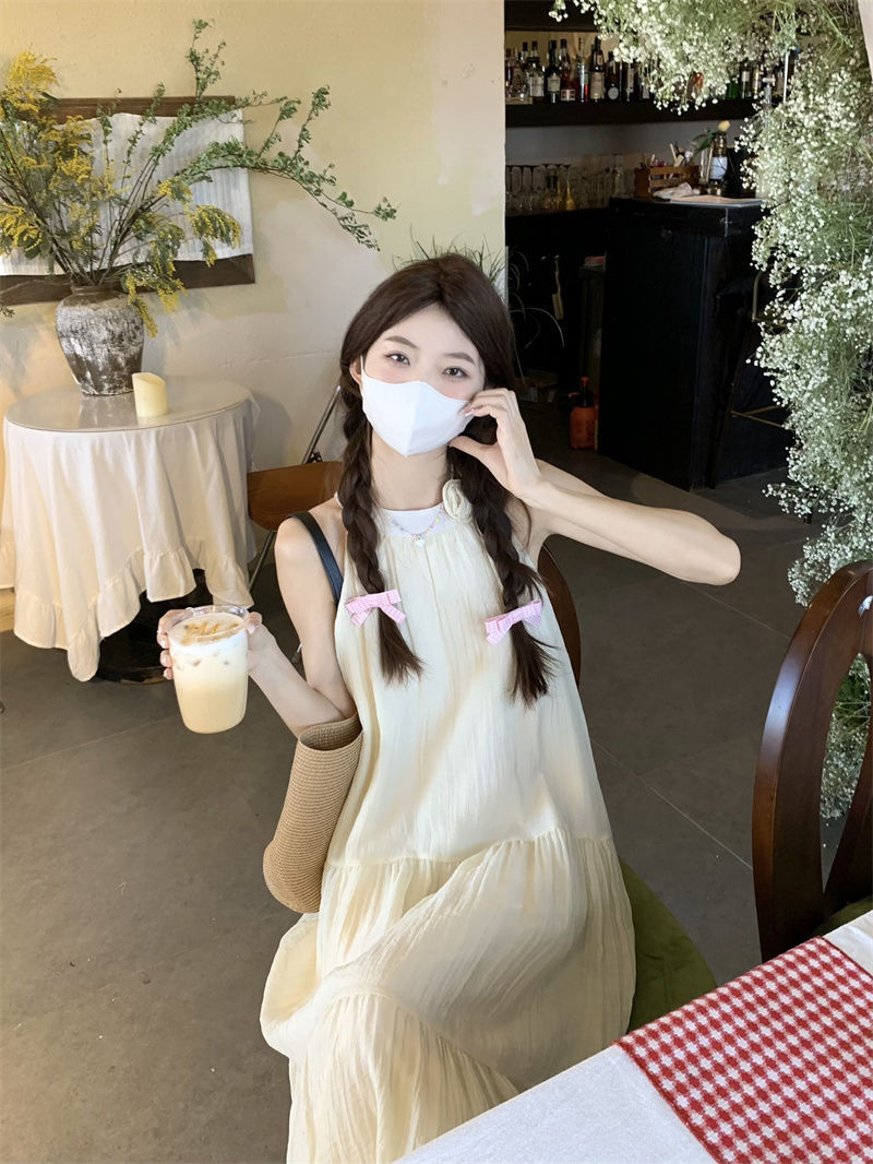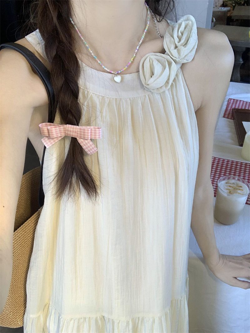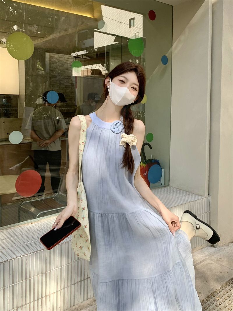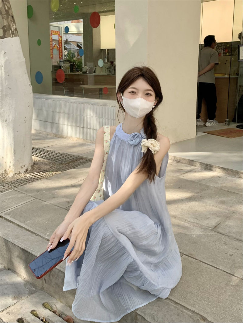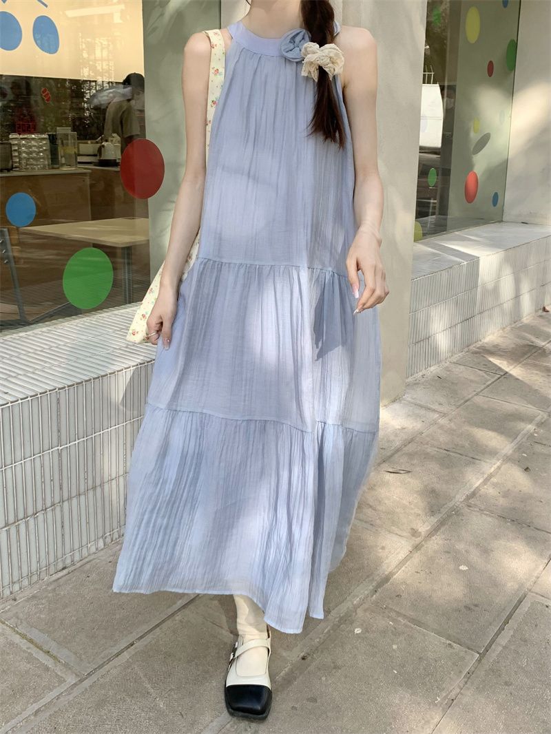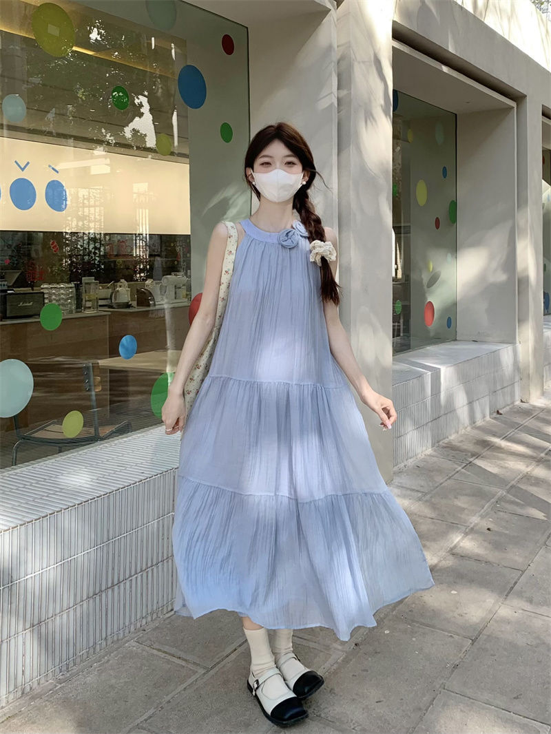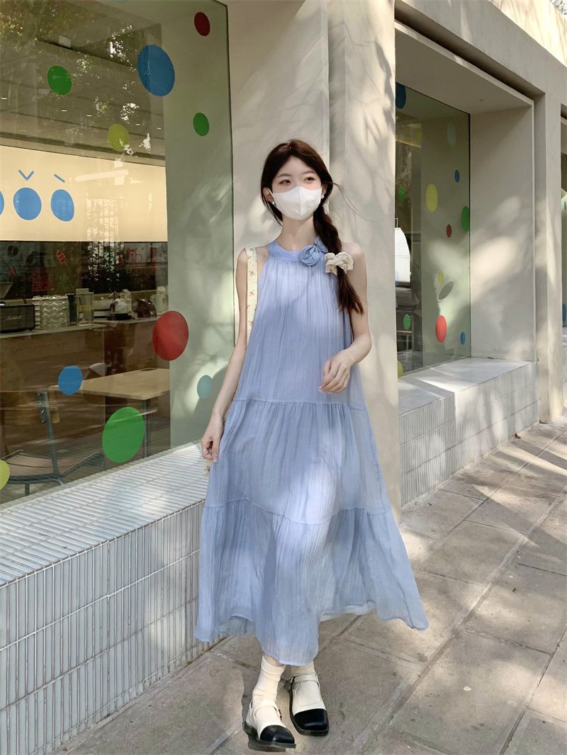 부드러운 스타일 입체 꽃 목 교수형 원피스 여성 여름 해변 휴일 요정 원피스 우아한 슬림 A 라인 긴 원피스
