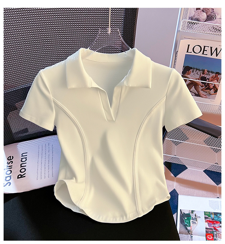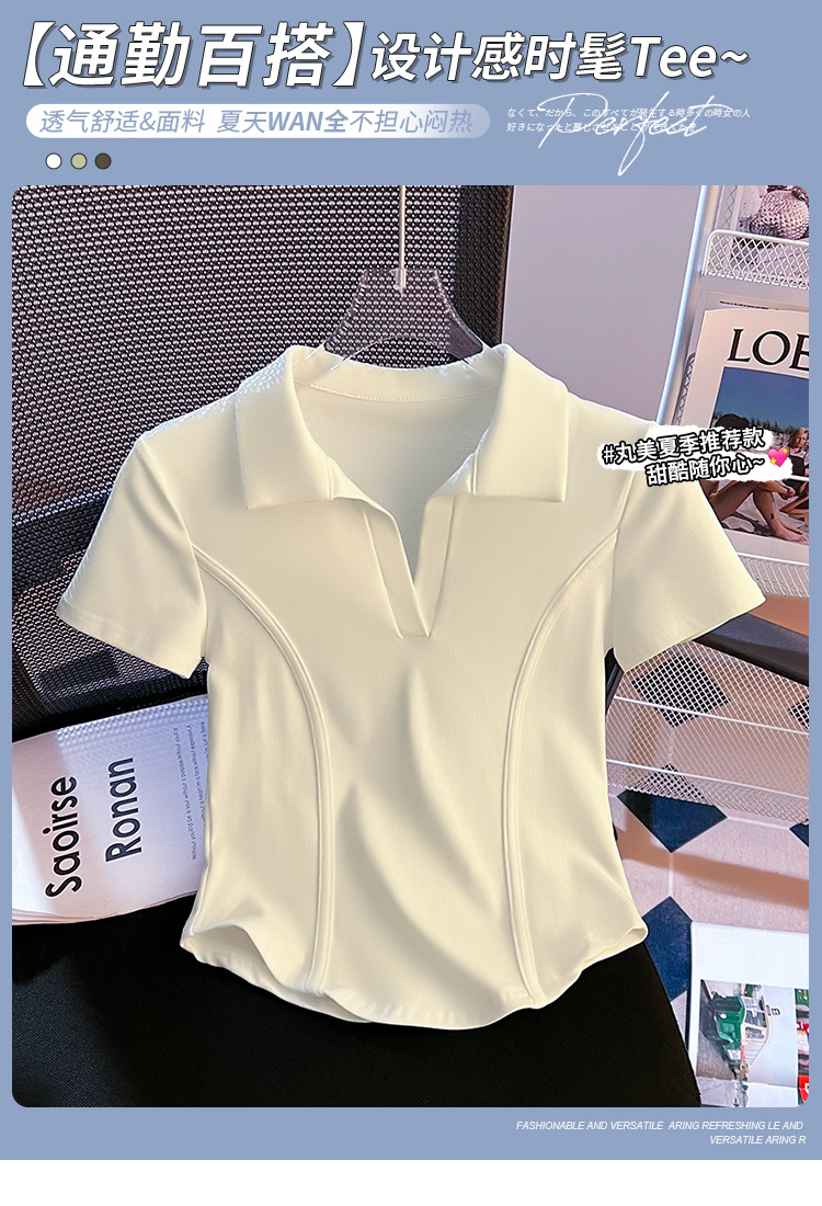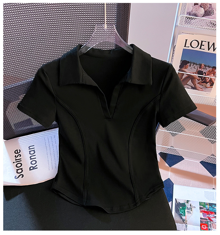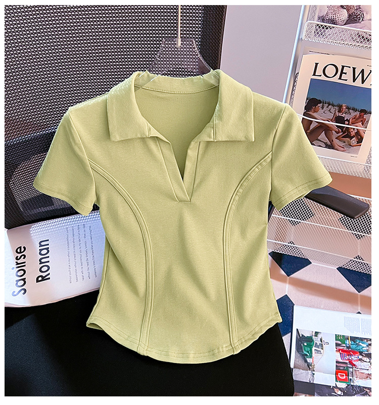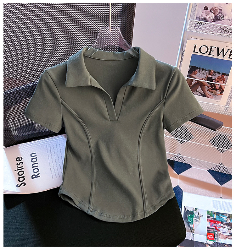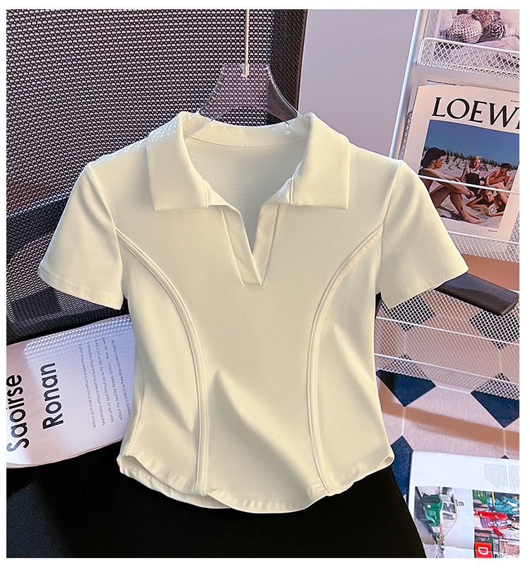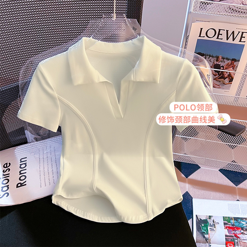 폴로 칼라 어깨 반팔 티셔츠 여성용 여름 아메리칸 스타일 레트로 핫 걸베이스 셔츠 달콤한 매운 스타일 Fishbone 타이트 웨이스트 탑