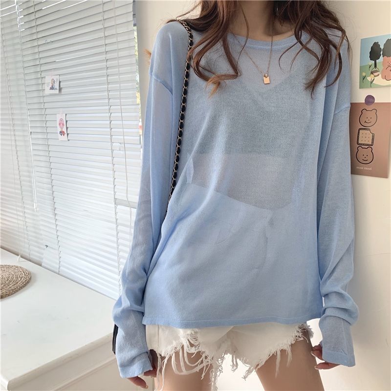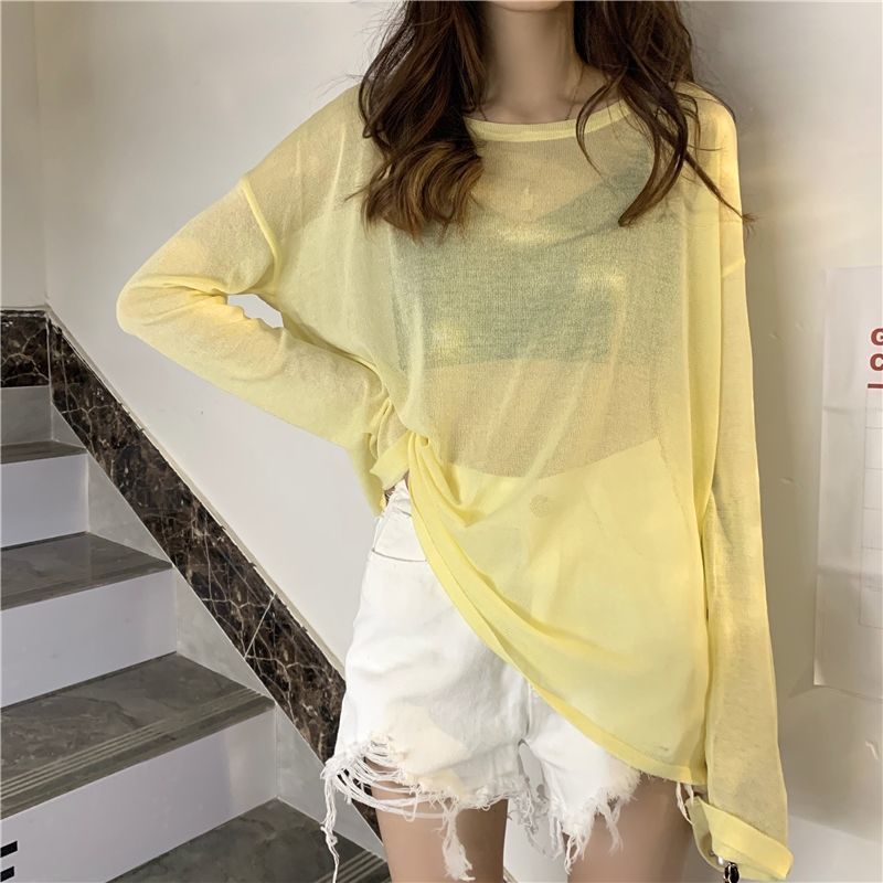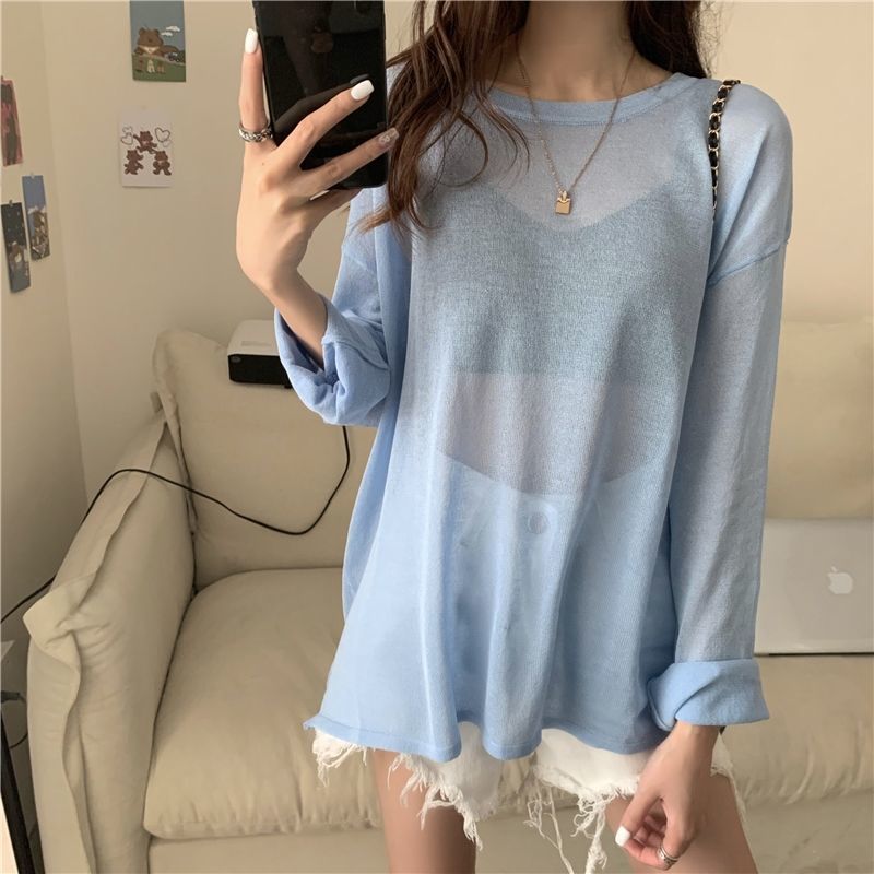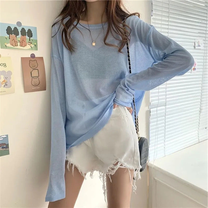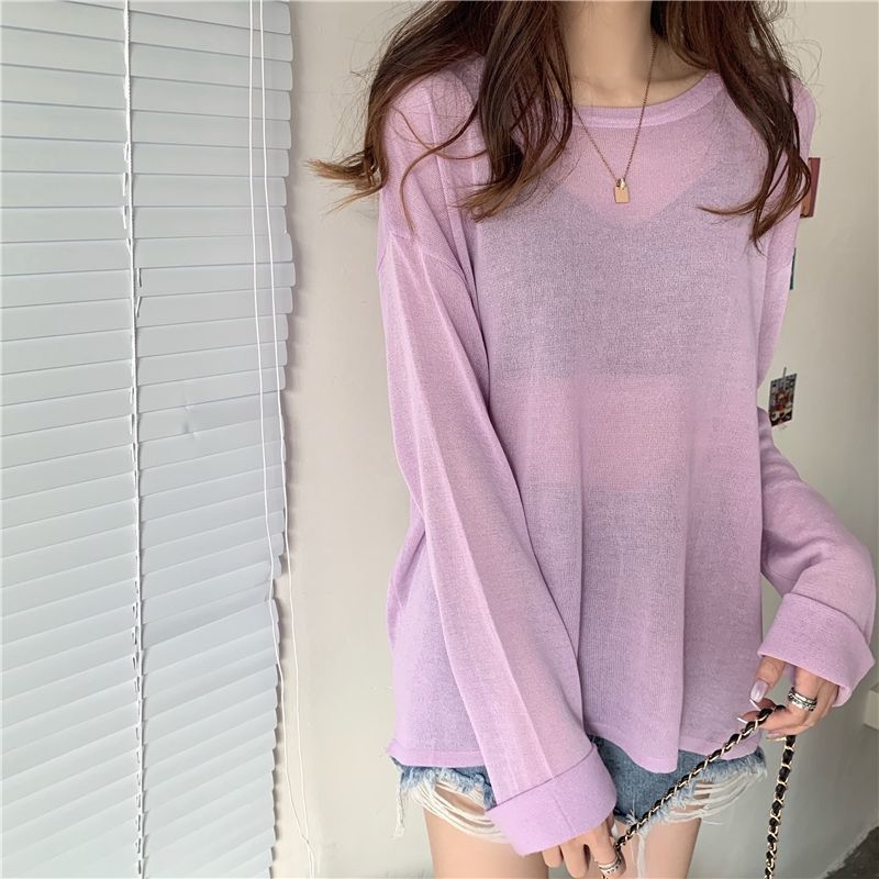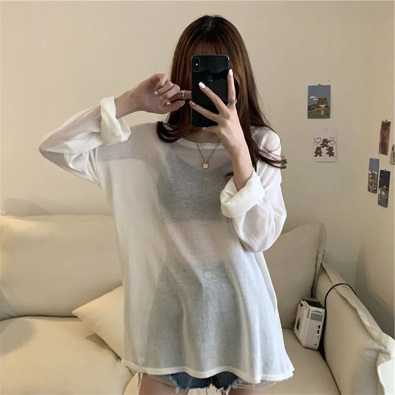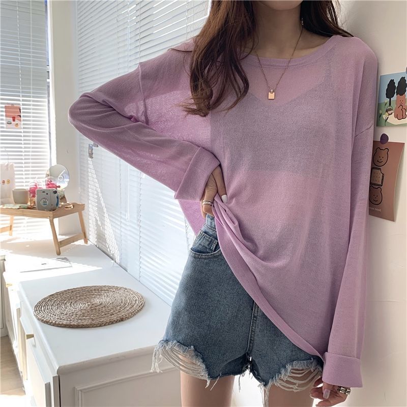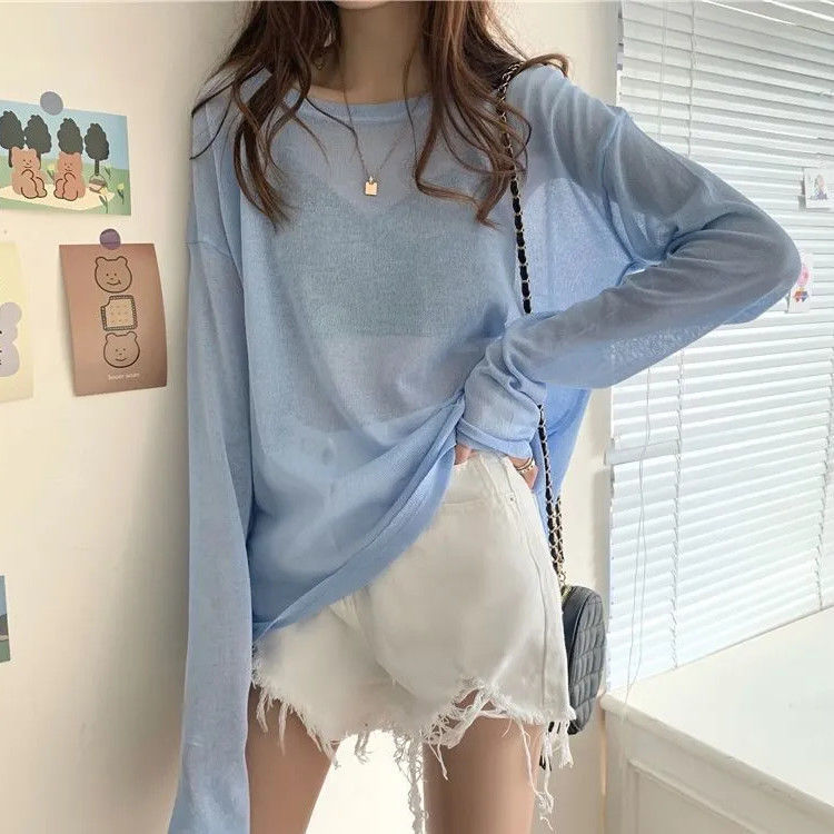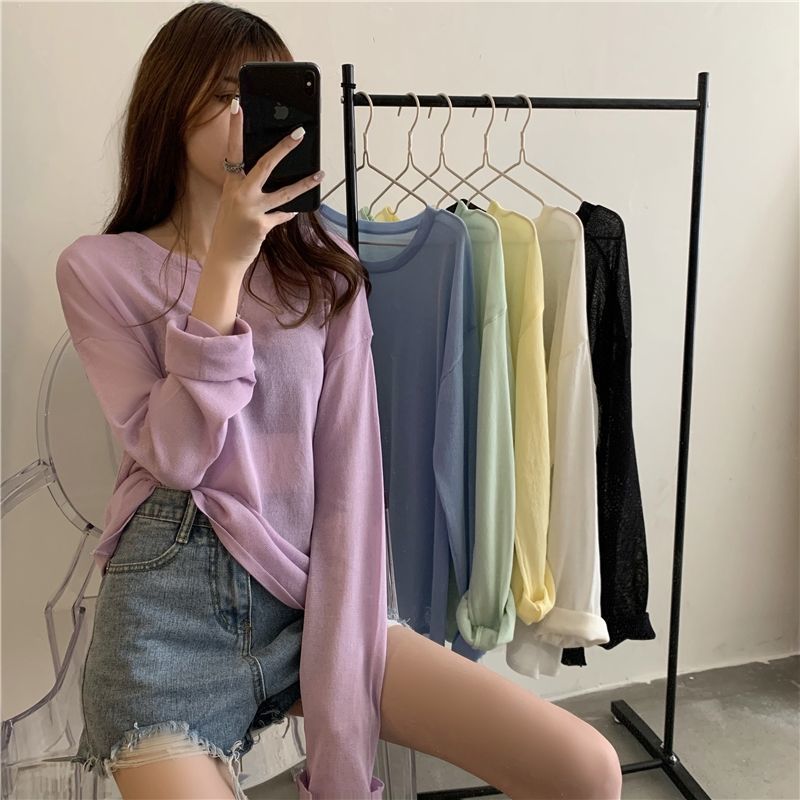 여름 선 스크린 블라우스 최고의 여성 서양식 중공 얇은 긴 소매 아이스 실크 스웨터 트렌디 풀오버스토어 가기