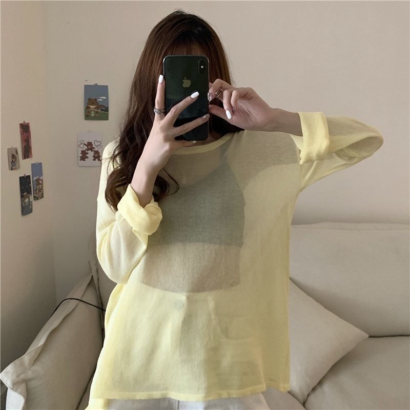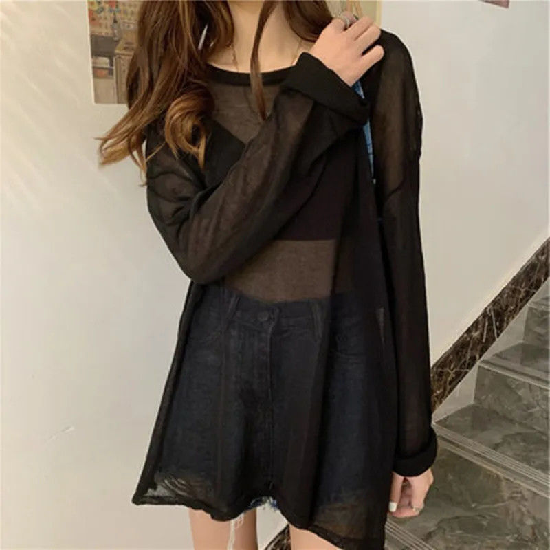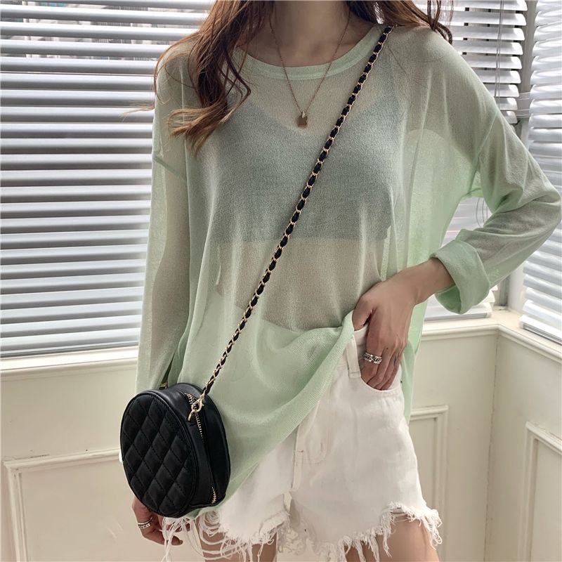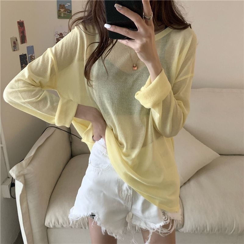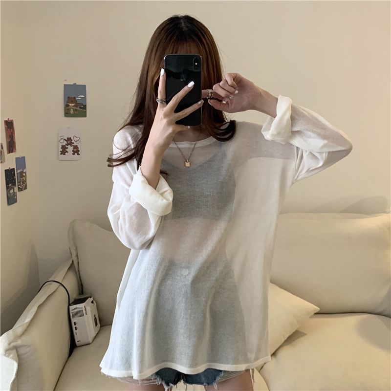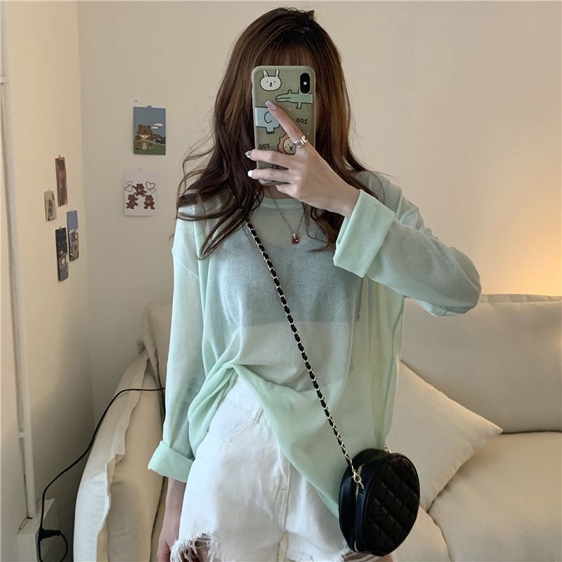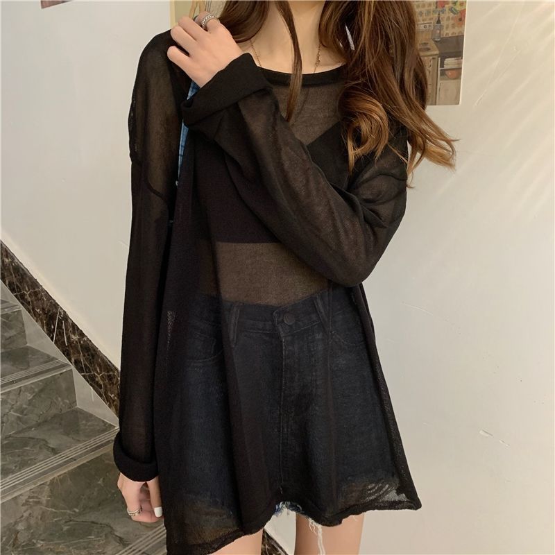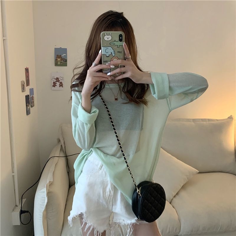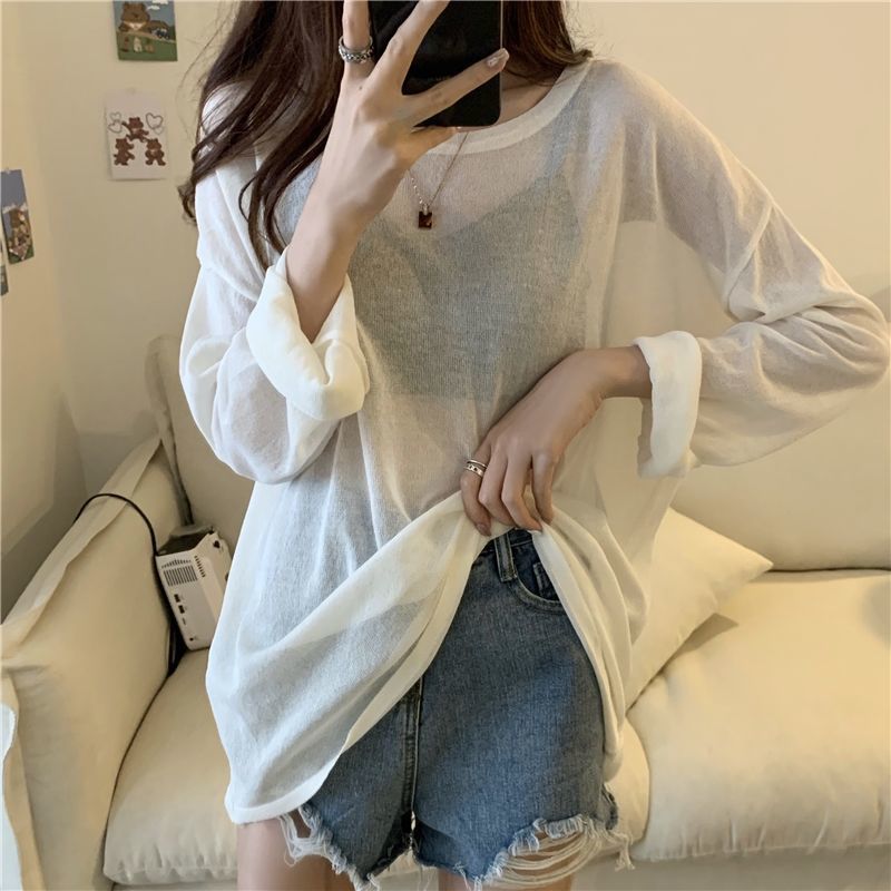 여름 선 스크린 블라우스 최고의 여성 서양식 중공 얇은 긴 소매 아이스 실크 스웨터 트렌디 풀오버스토어 가기