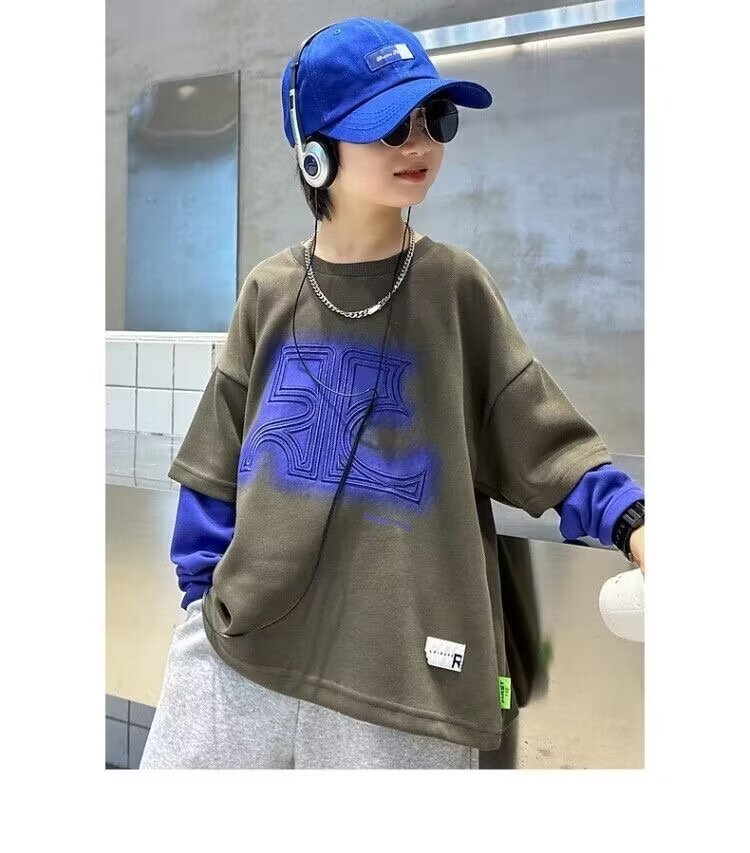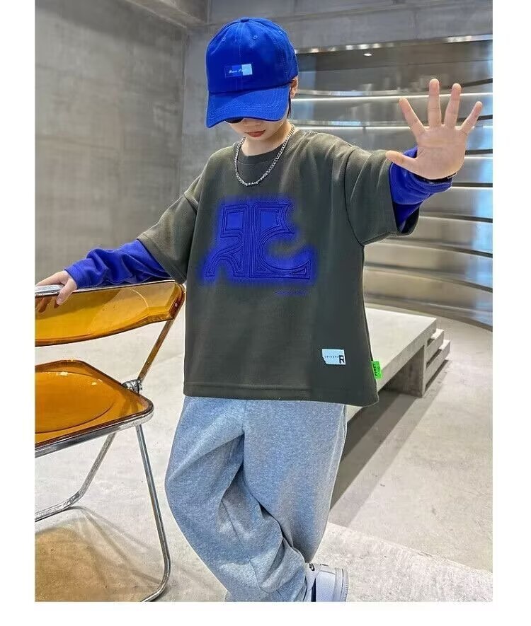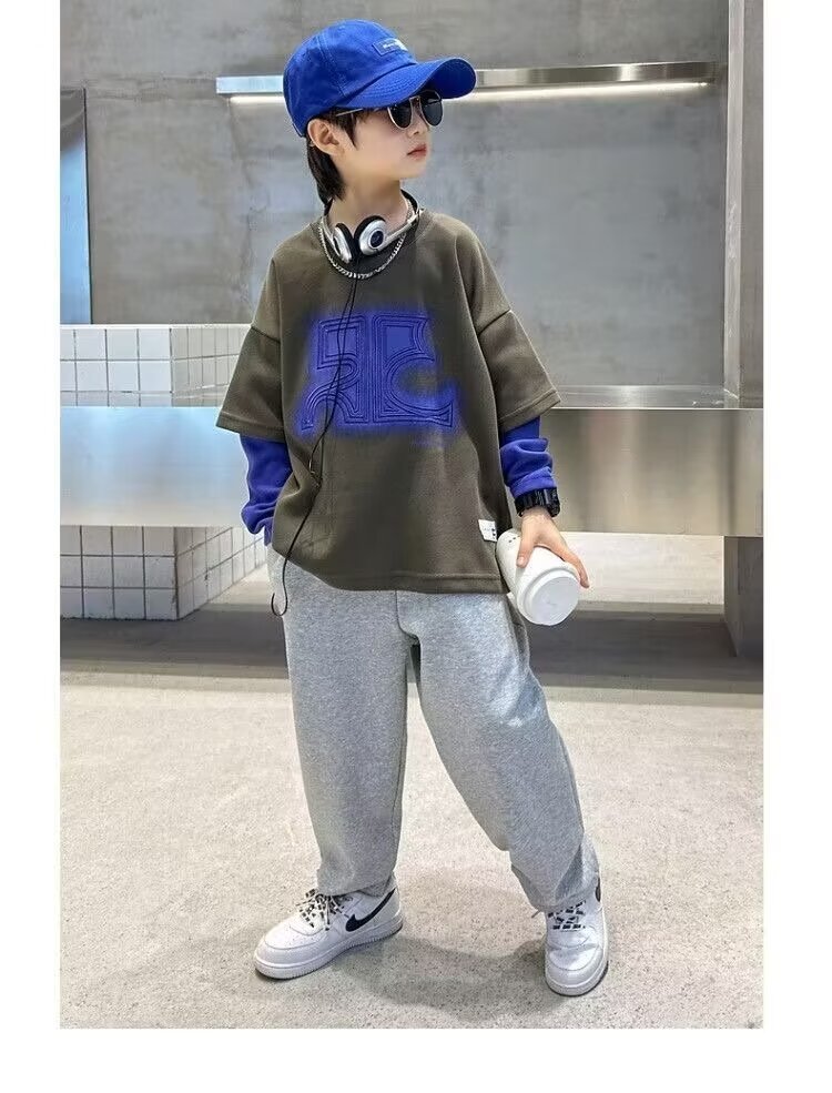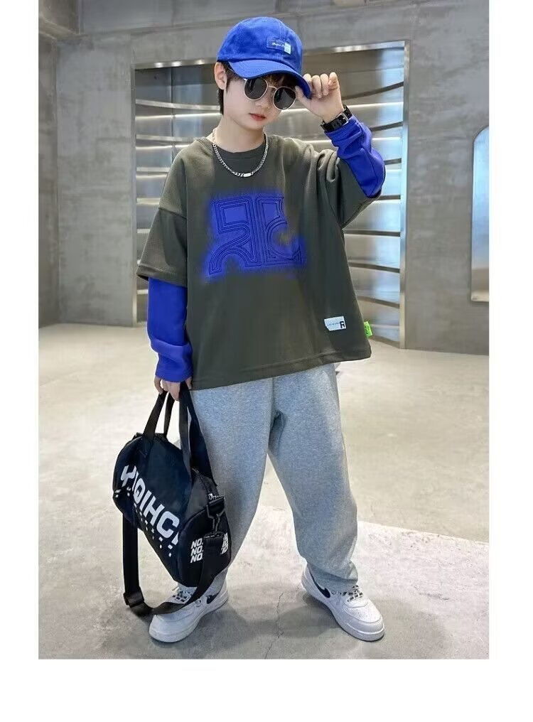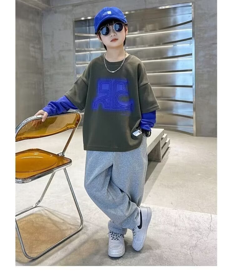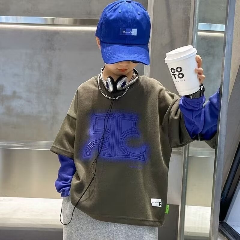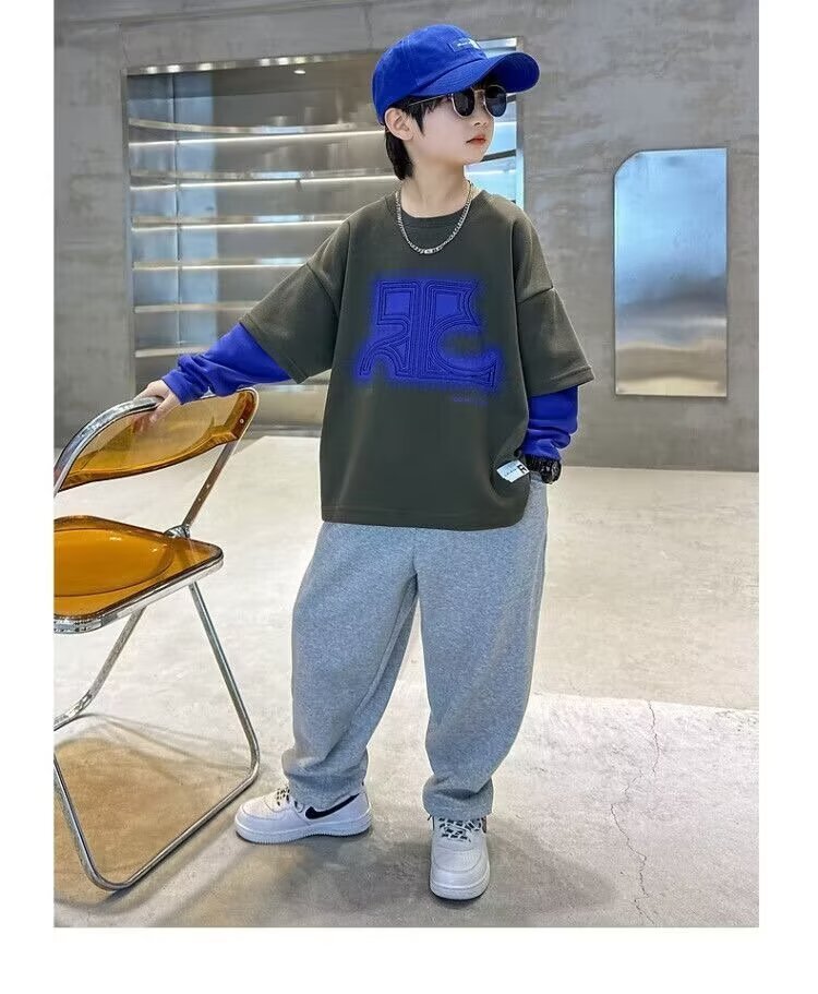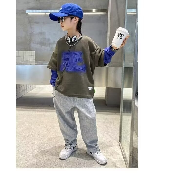 어린이 의류 소년 운동복 2024 년 봄과 가을 새 스타일 소년 옷 어린이 가짜 투피스 긴팔 티셔츠 탑스토어 가기