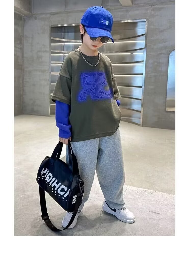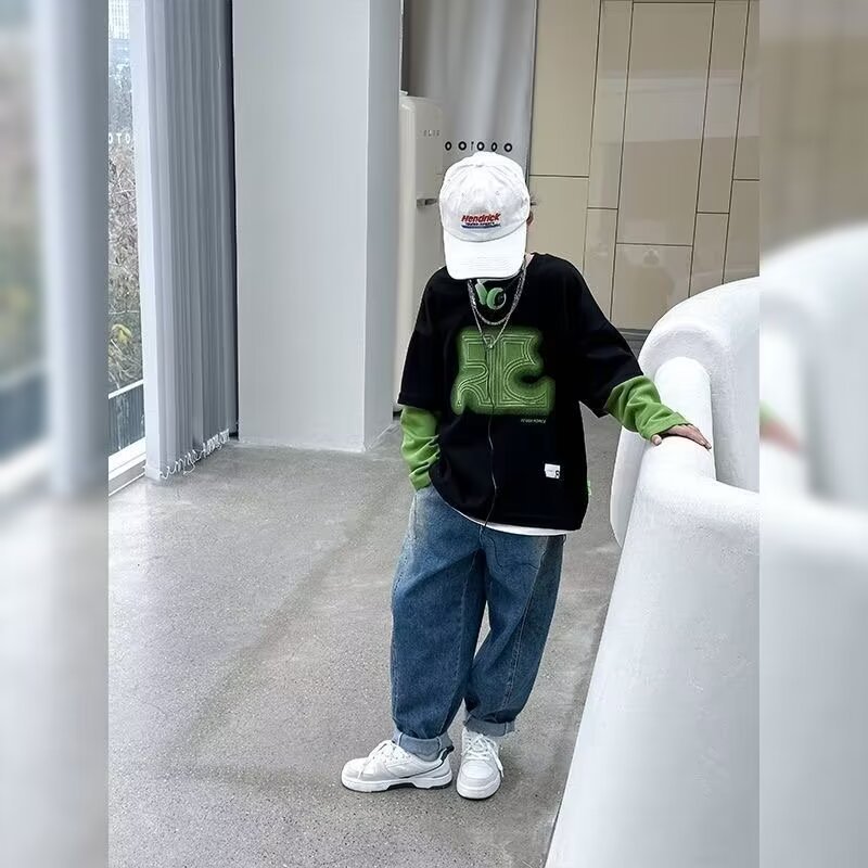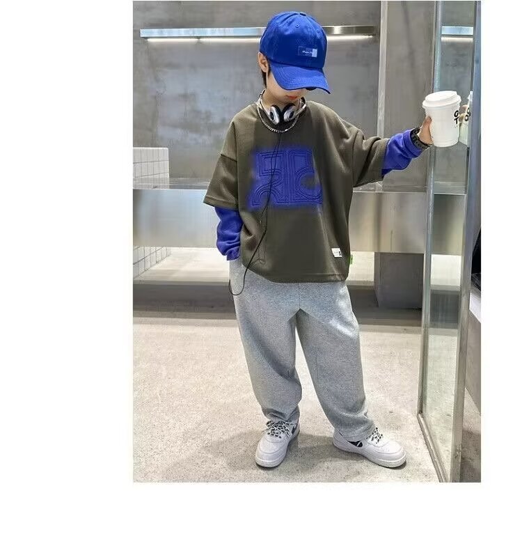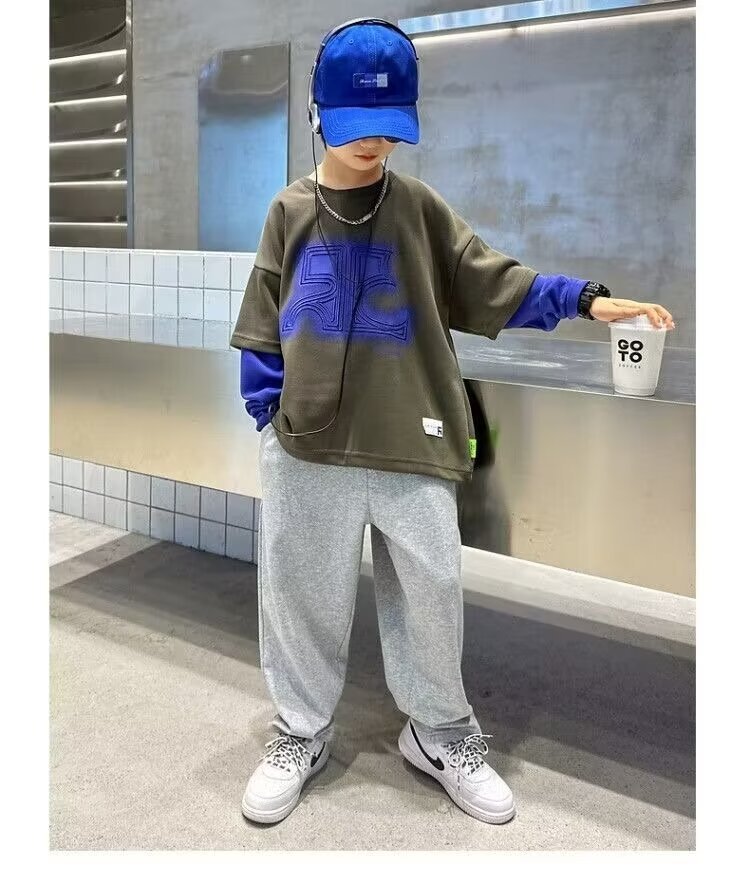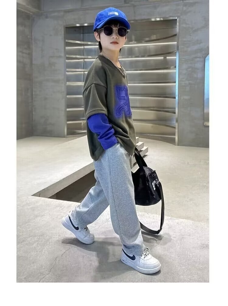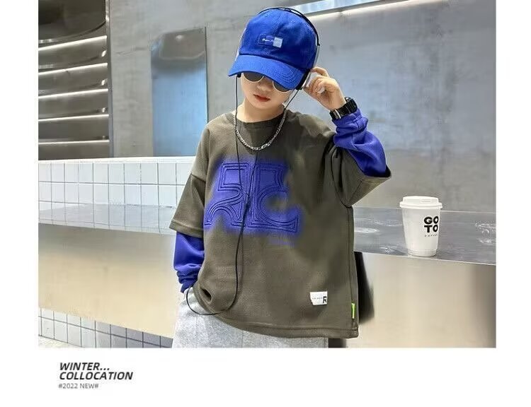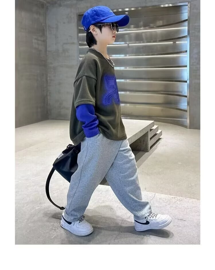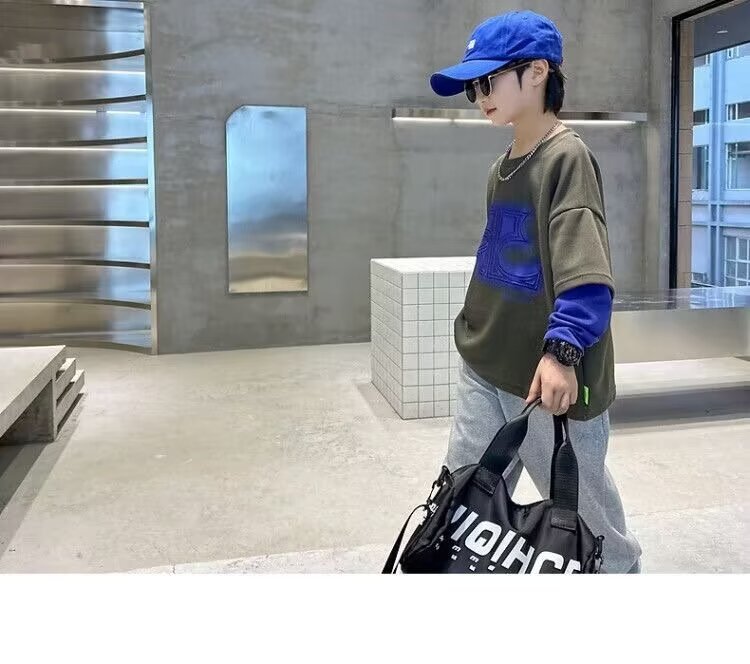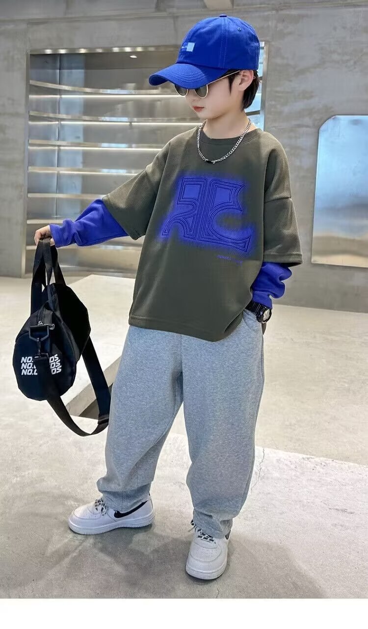 어린이 의류 소년 운동복 2024 년 봄과 가을 새 스타일 소년 옷 어린이 가짜 투피스 긴팔 티셔츠 탑스토어 가기