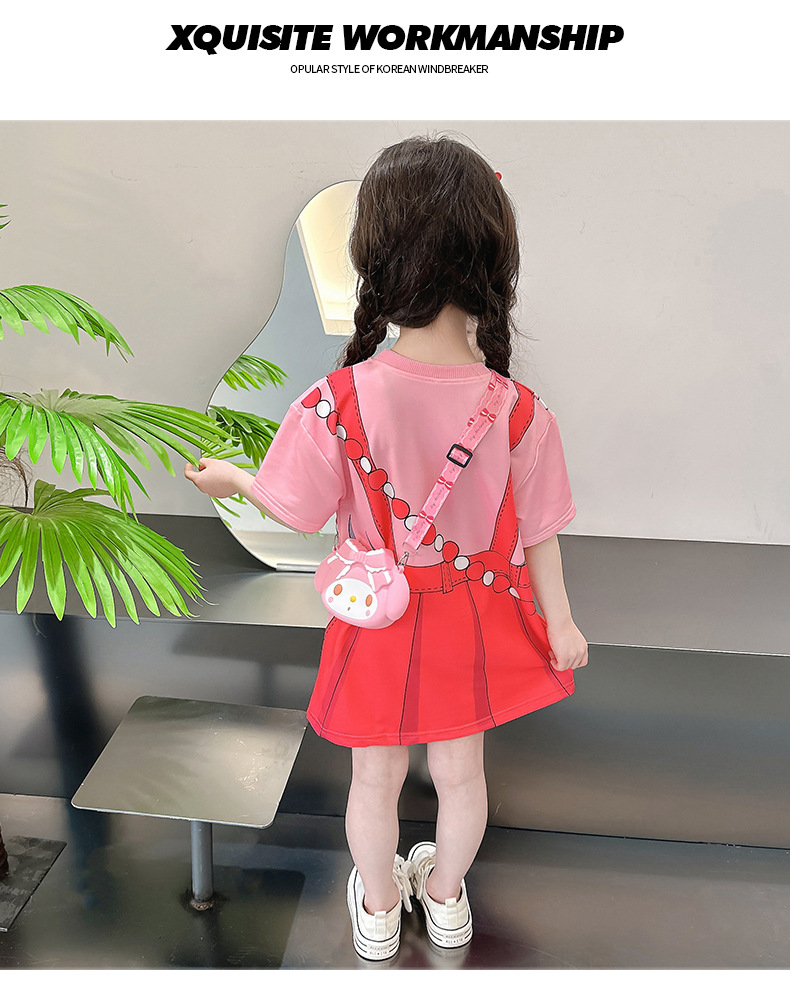 여자 캐주얼 만화 치마 여름 2024 새로운 어린이 여름 티셔츠 치마 아기 소녀 가짜 투피스 원피스