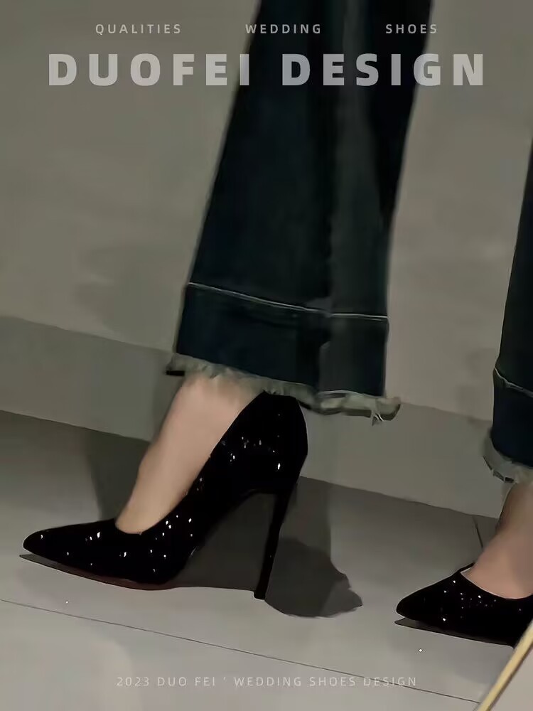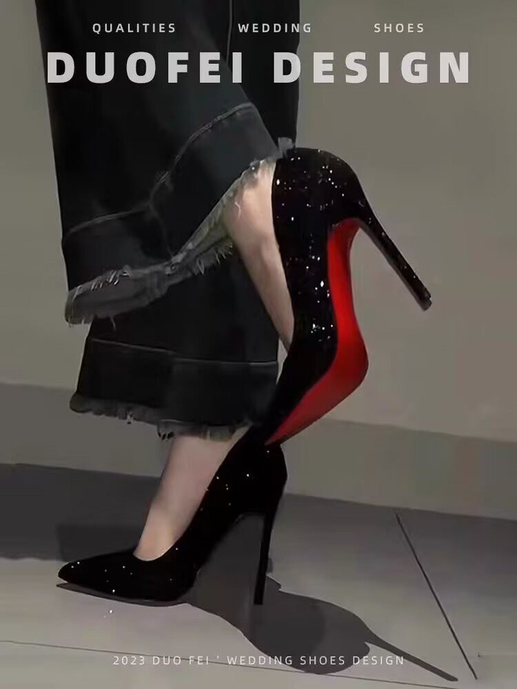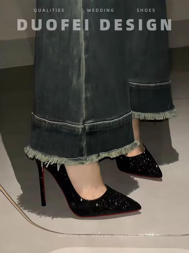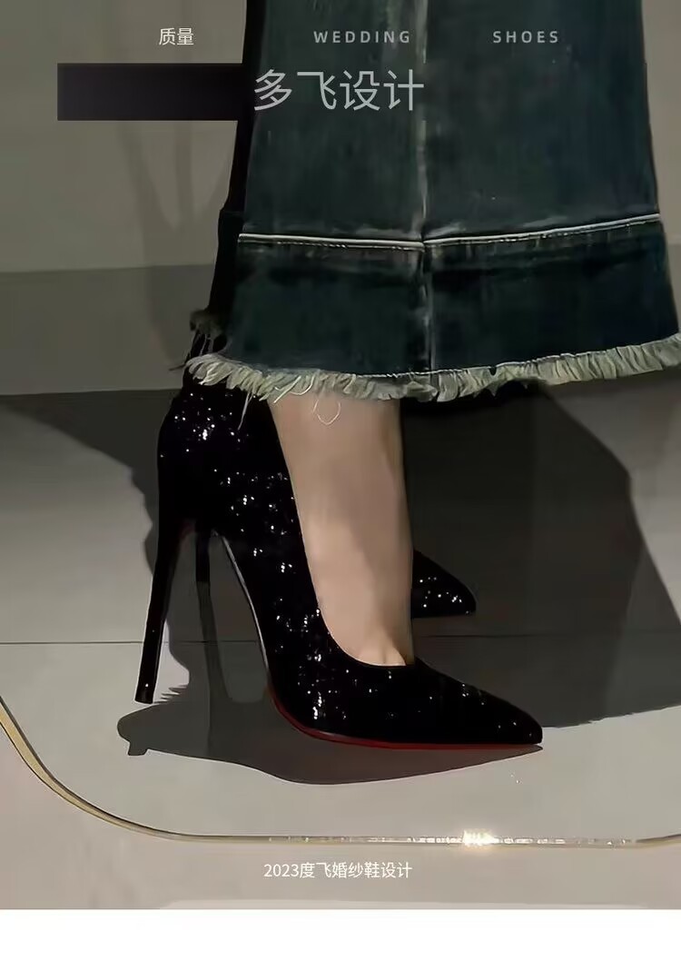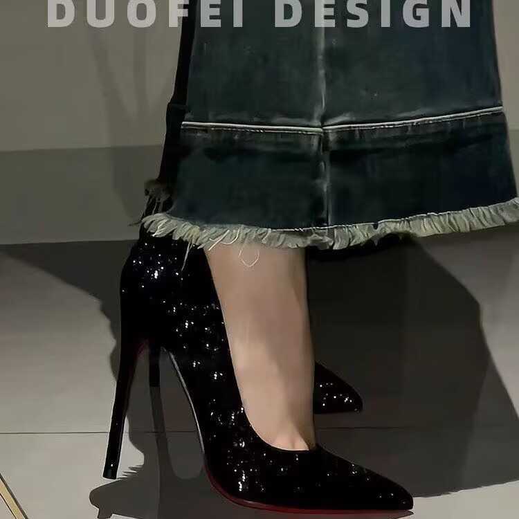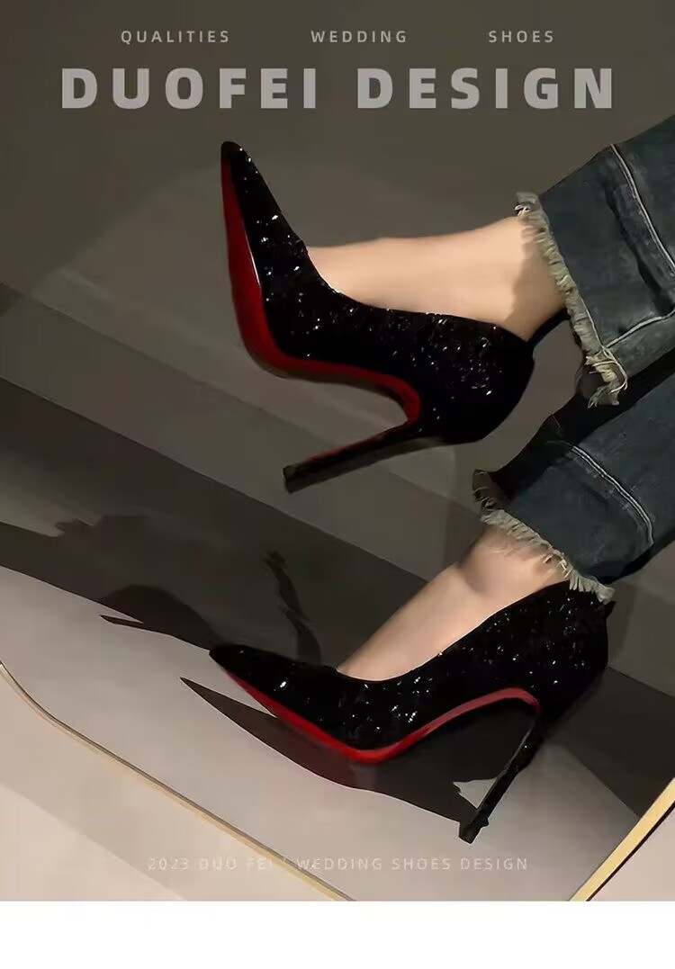 빨간 바닥 검은 속편 아름다운 하이힐 여성의 새로운 봄과 여름 섹시한 얕은 스틸레토 힐 비즈니스 연회를위한 우아한 싱글 레이어 신발스토어 가기