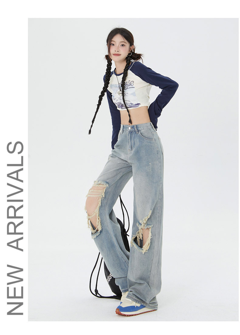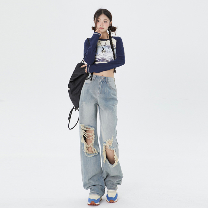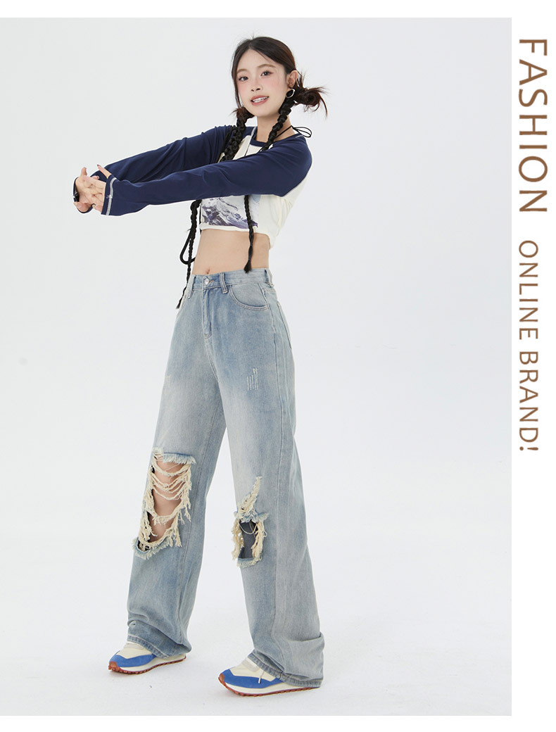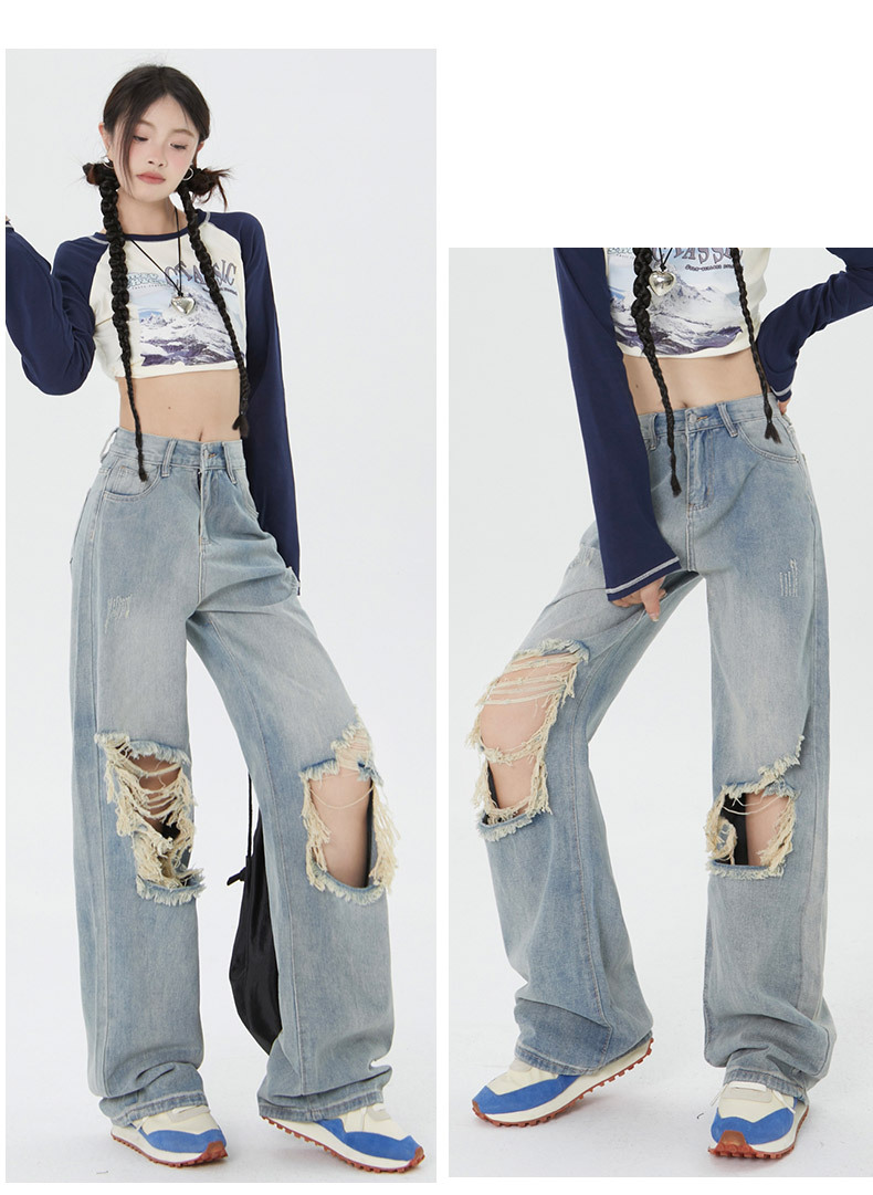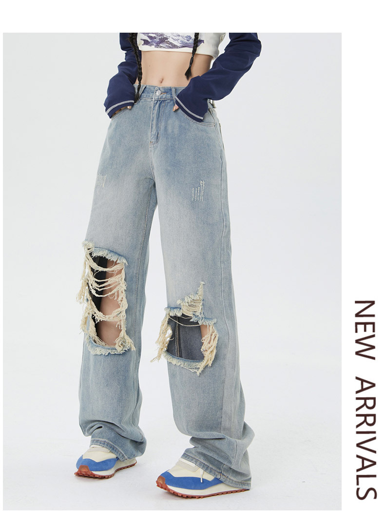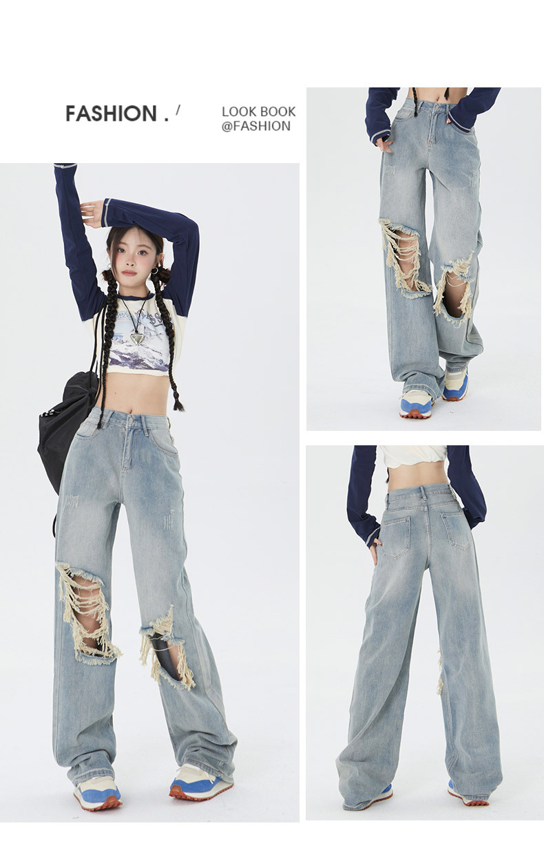 찢어진 청바지 여자 느슨한 넓은 다리 바지 2024 년 여름 새로운 올 매치 높은 허리 슬리밍 느슨한 직선 바지스토어 가기