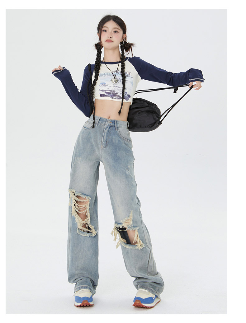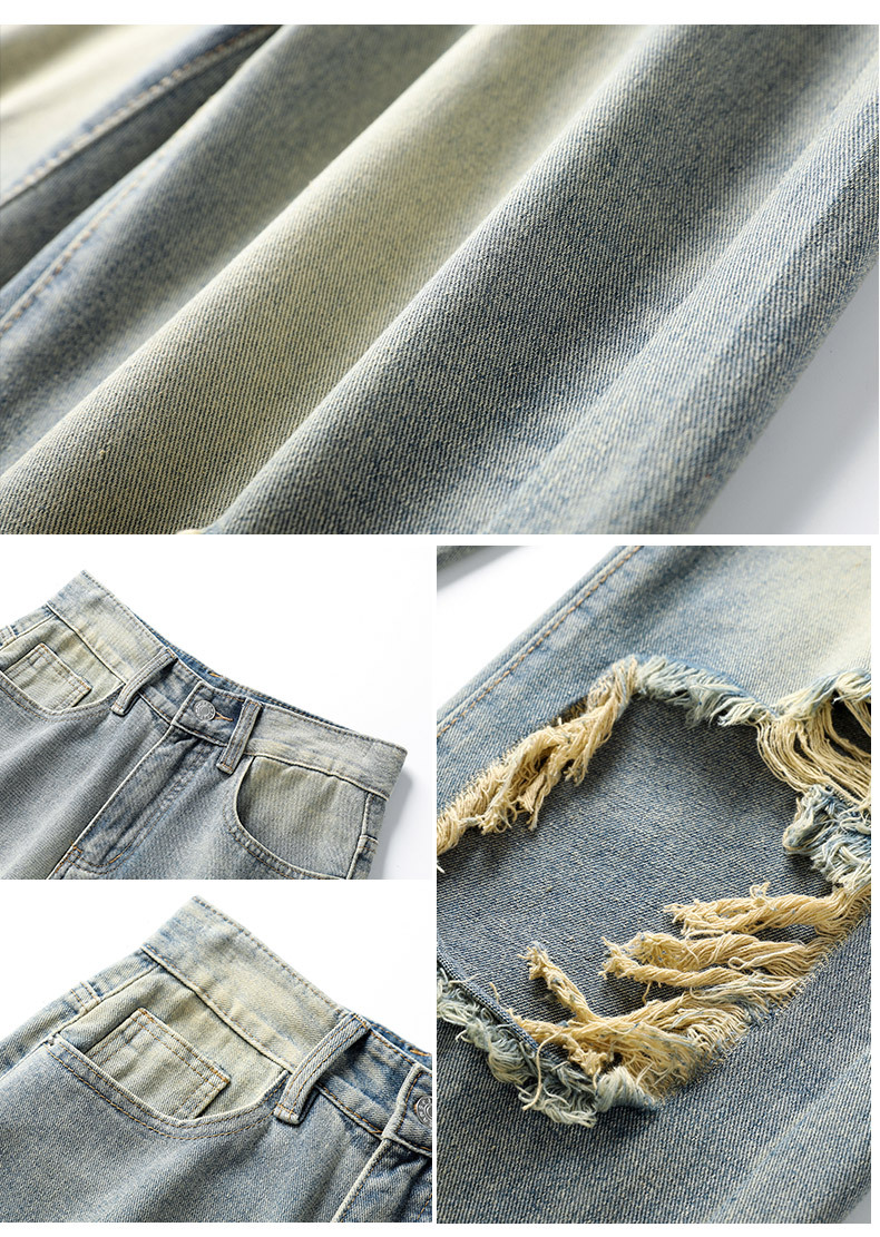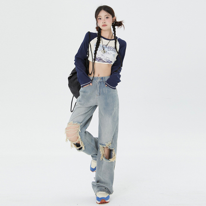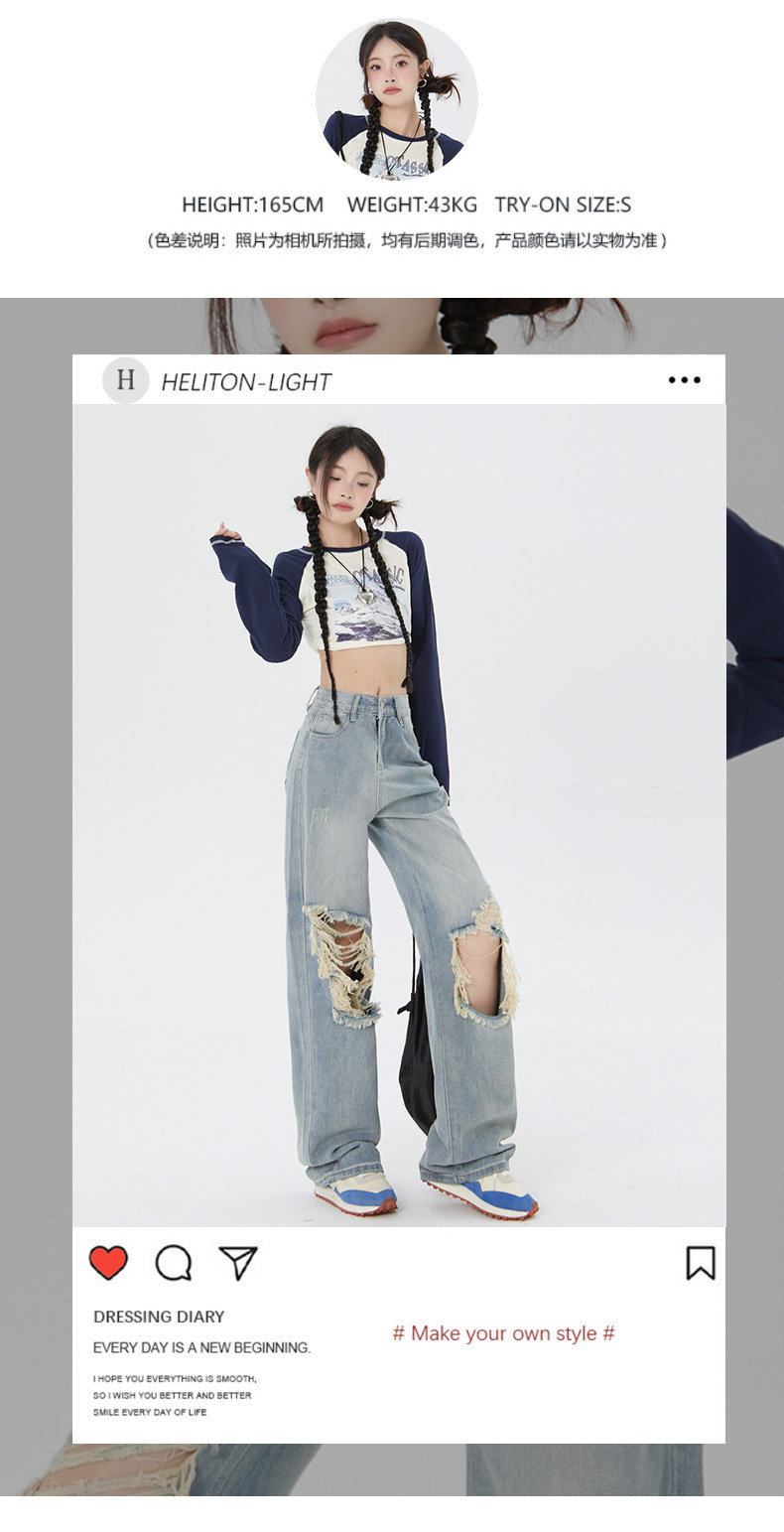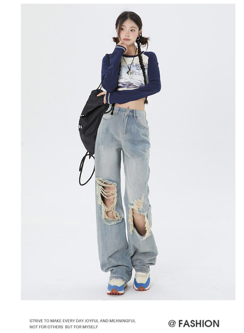 찢어진 청바지 여자 느슨한 넓은 다리 바지 2024 년 여름 새로운 올 매치 높은 허리 슬리밍 느슨한 직선 바지스토어 가기