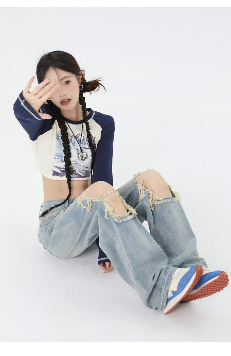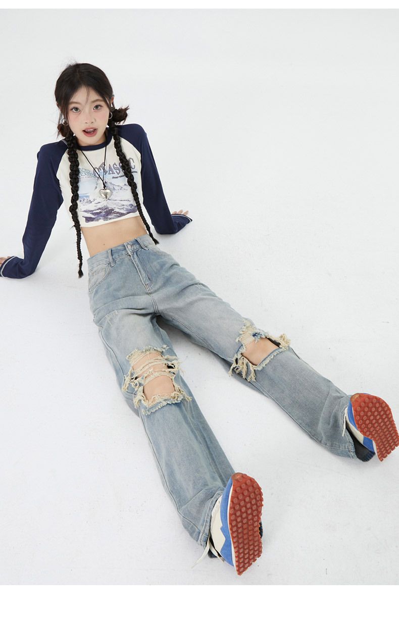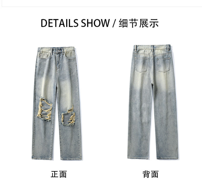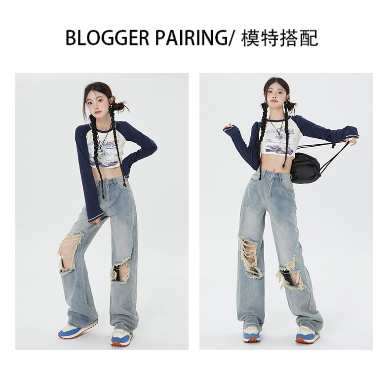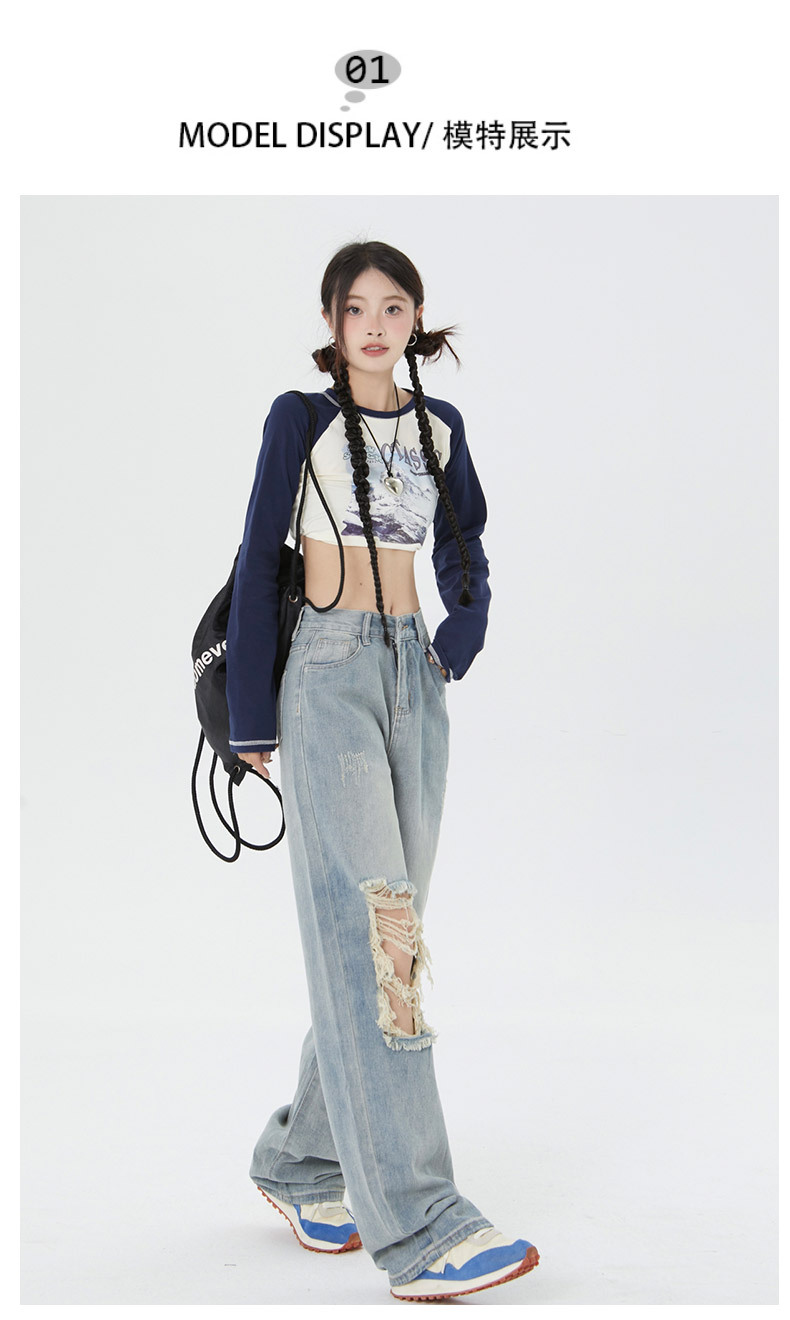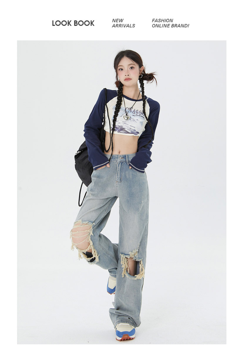찢어진 청바지 여자 느슨한 넓은 다리 바지 2024 년 여름 새로운 올 매치 높은 허리 슬리밍 느슨한 직선 바지스토어 가기