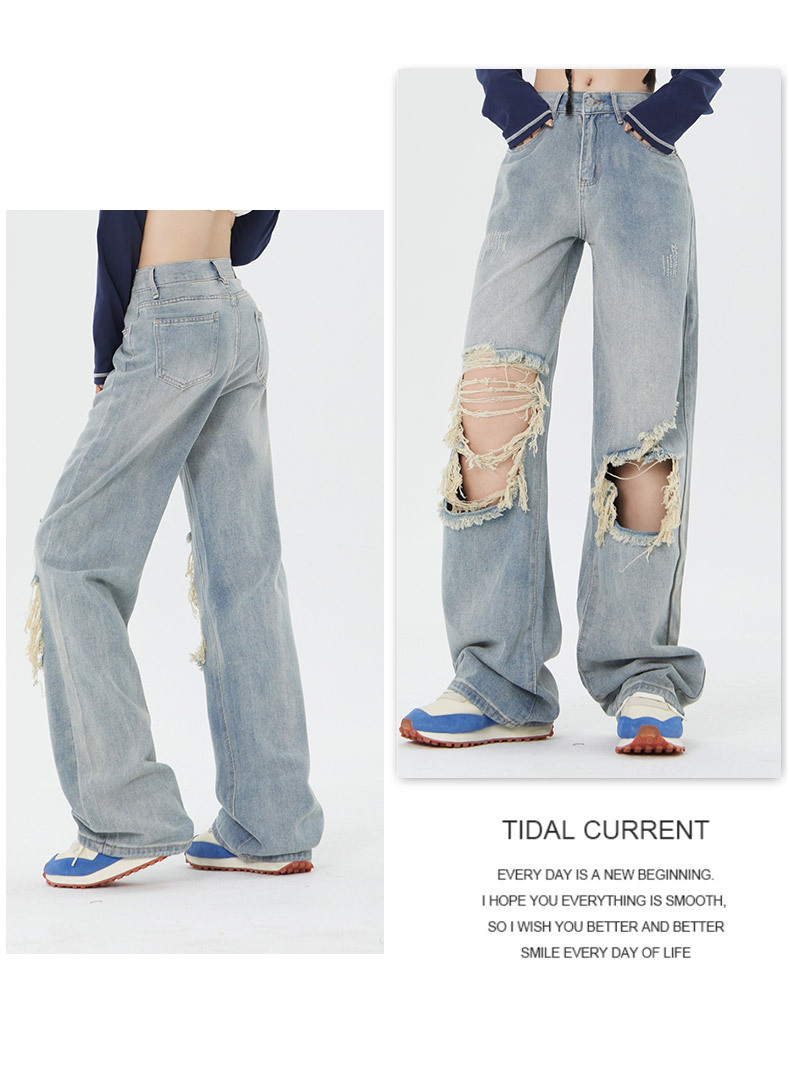 찢어진 청바지 여자 느슨한 넓은 다리 바지 2024 년 여름 새로운 올 매치 높은 허리 슬리밍 느슨한 직선 바지
