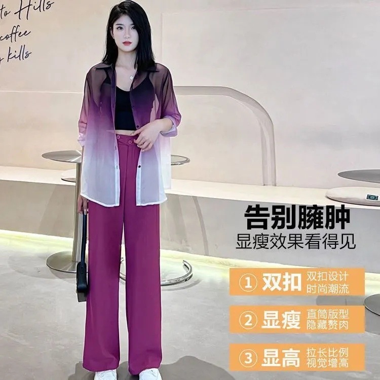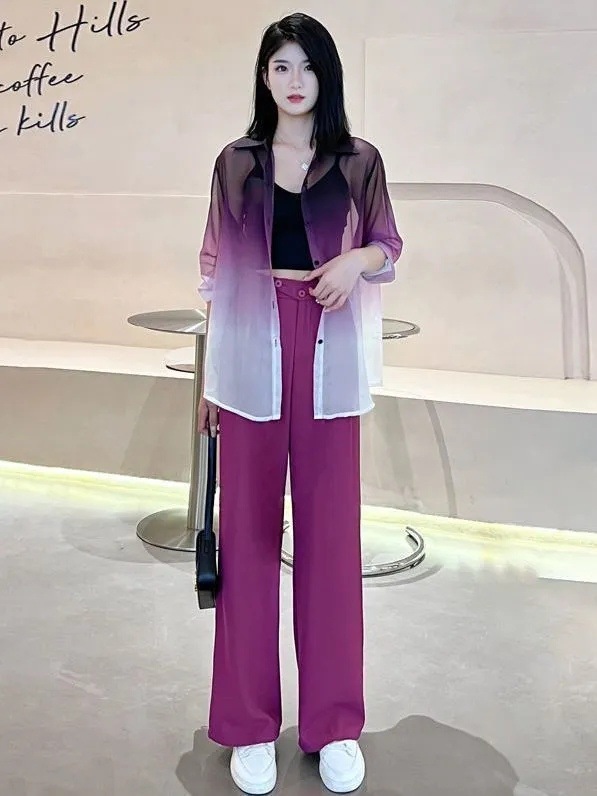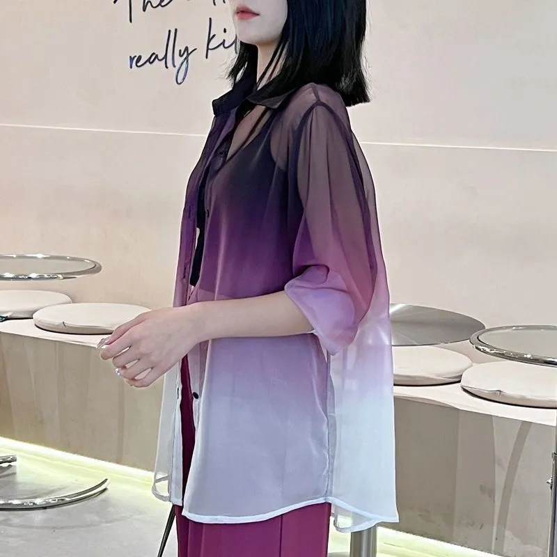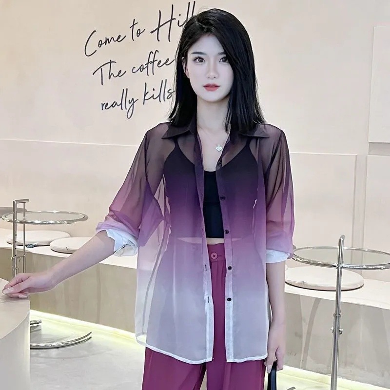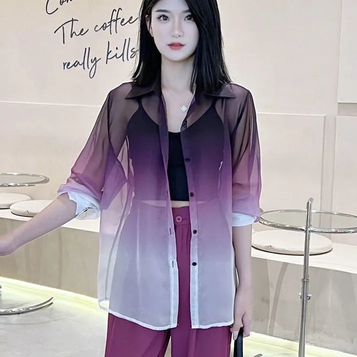 선스크린 POLO 칼라 여성 여름 긴팔 쉬폰 셔츠 경량 그라디언트 카디건 시스루 탑 트렌디