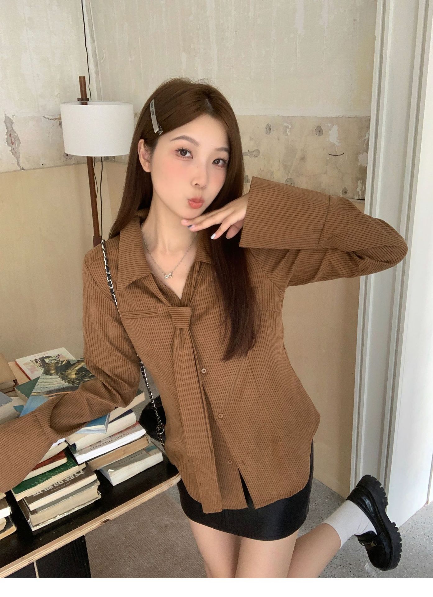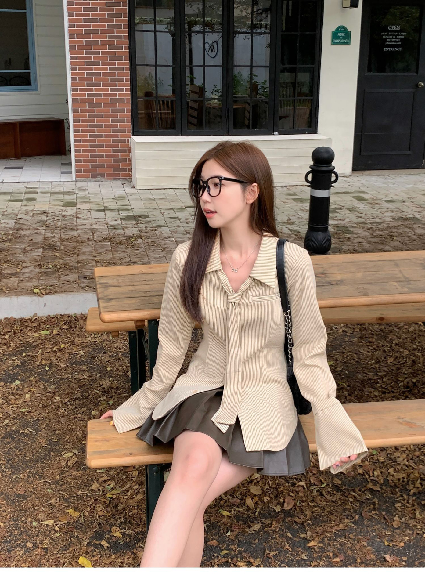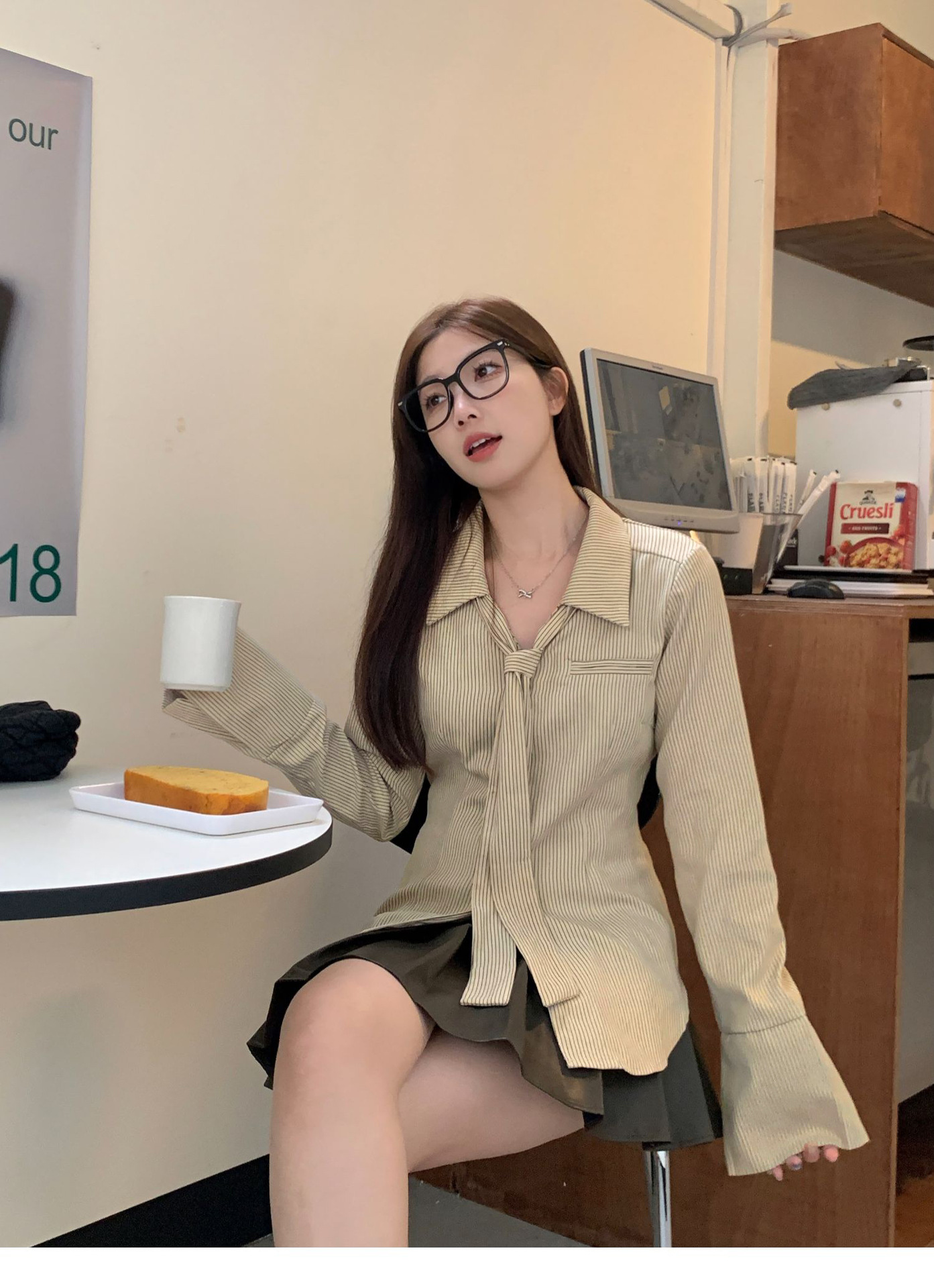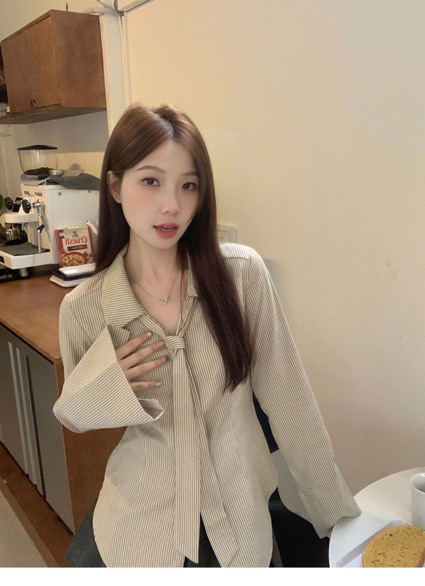 봄 새로운 마일라드 옷깃 중간 길이 셔츠 통통녀 틈새 디자인 센스 스트라이프 셔츠 최고 여성 패션스토어 가기