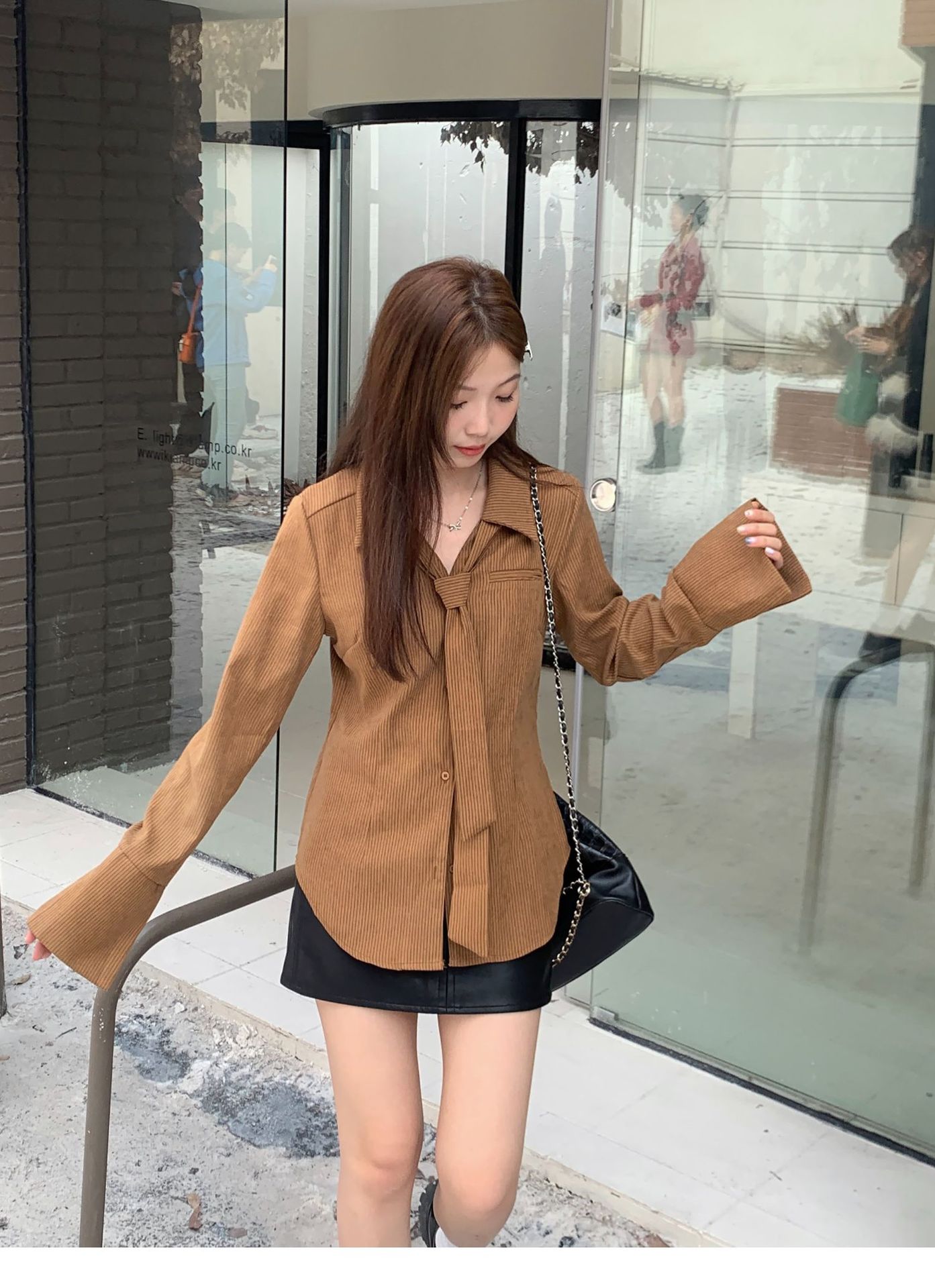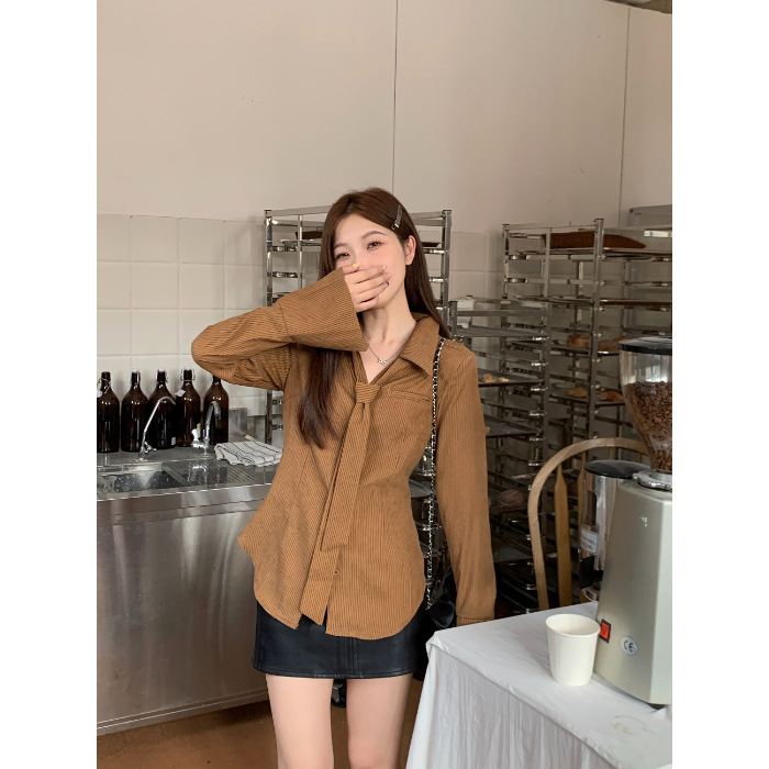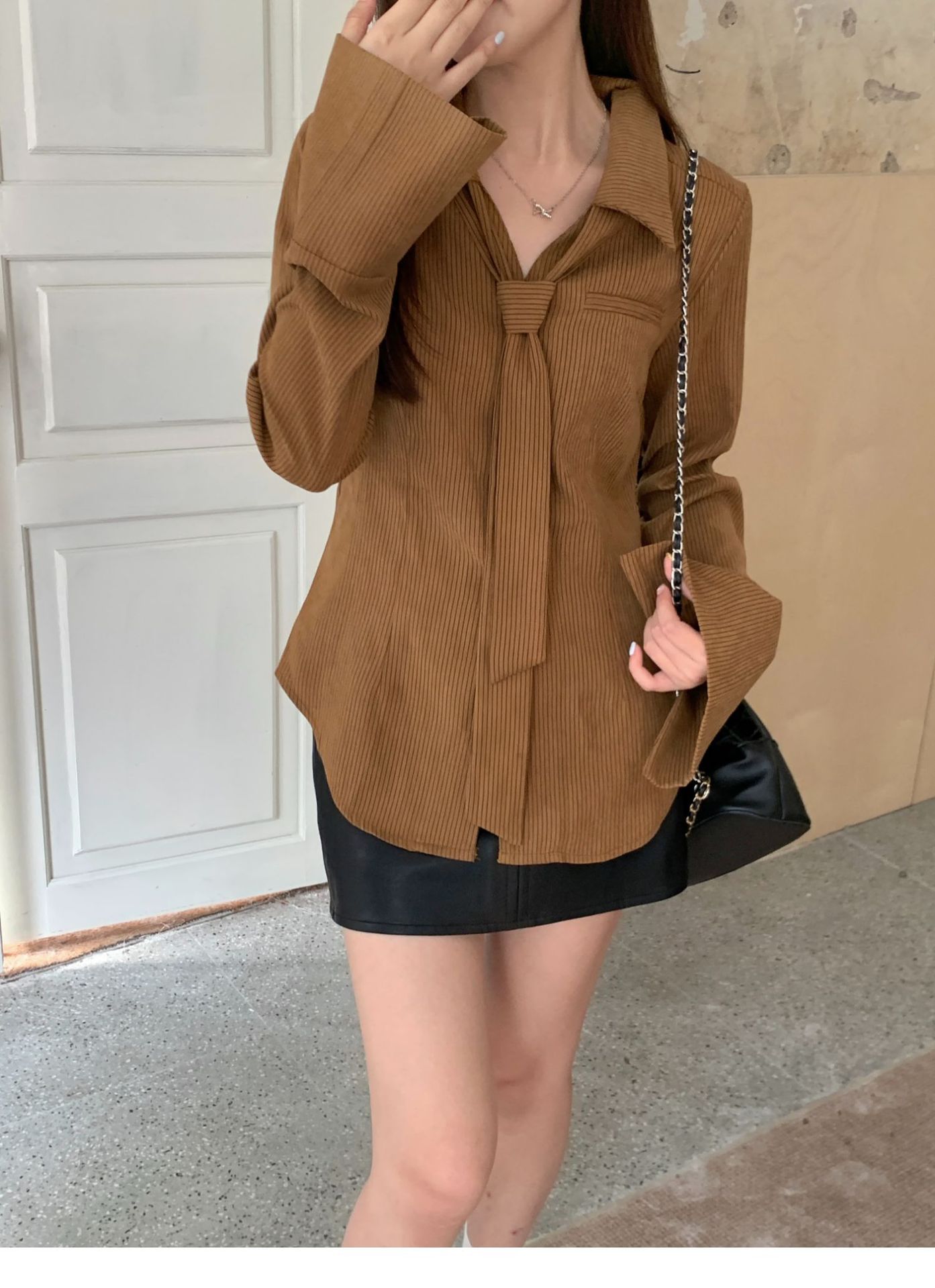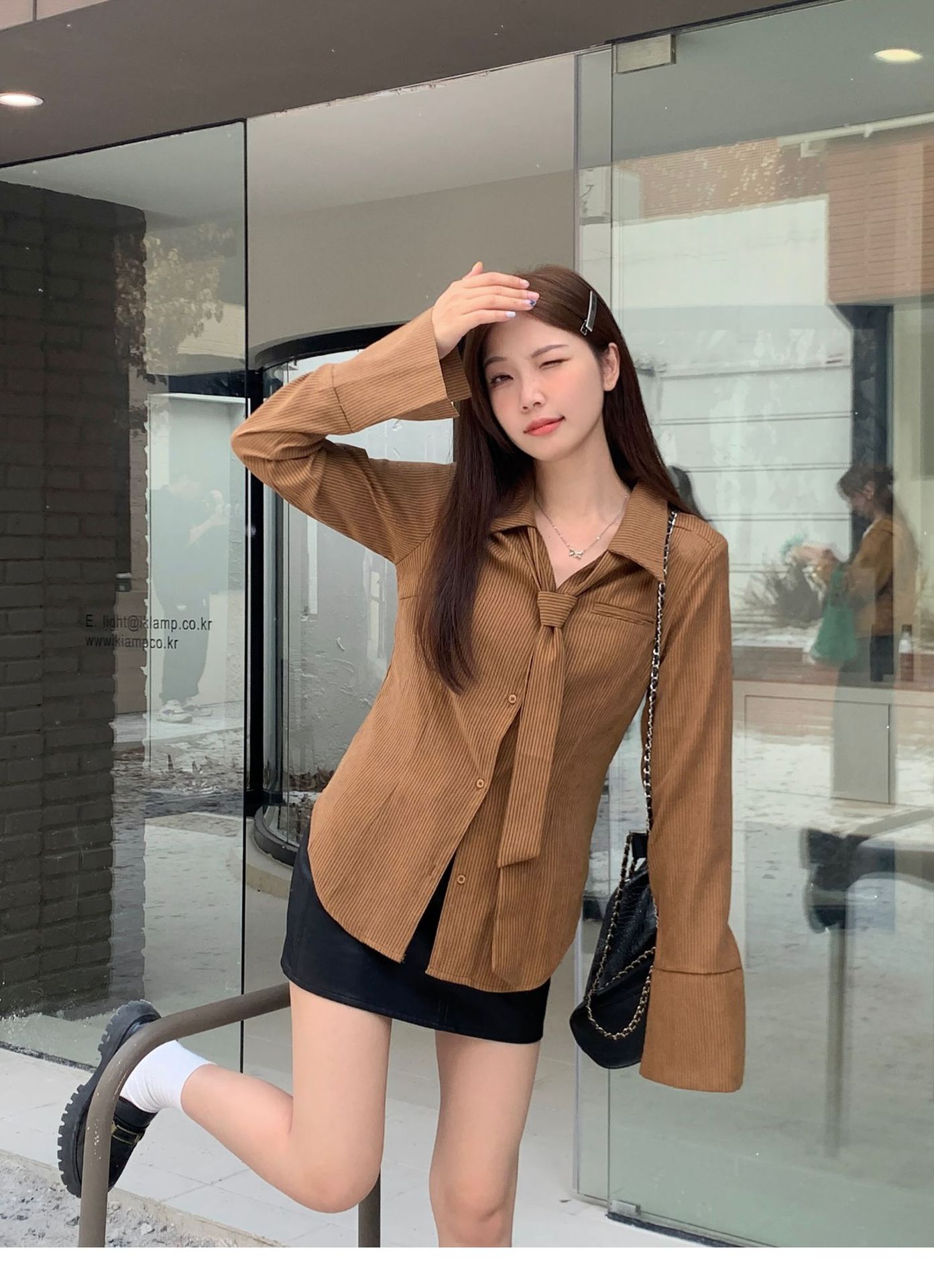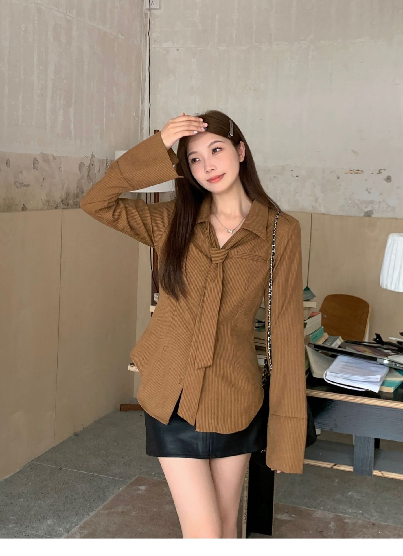 봄 새로운 마일라드 옷깃 중간 길이 셔츠 통통녀 틈새 디자인 센스 스트라이프 셔츠 최고 여성 패션스토어 가기