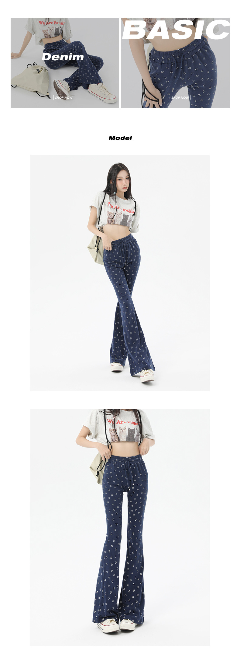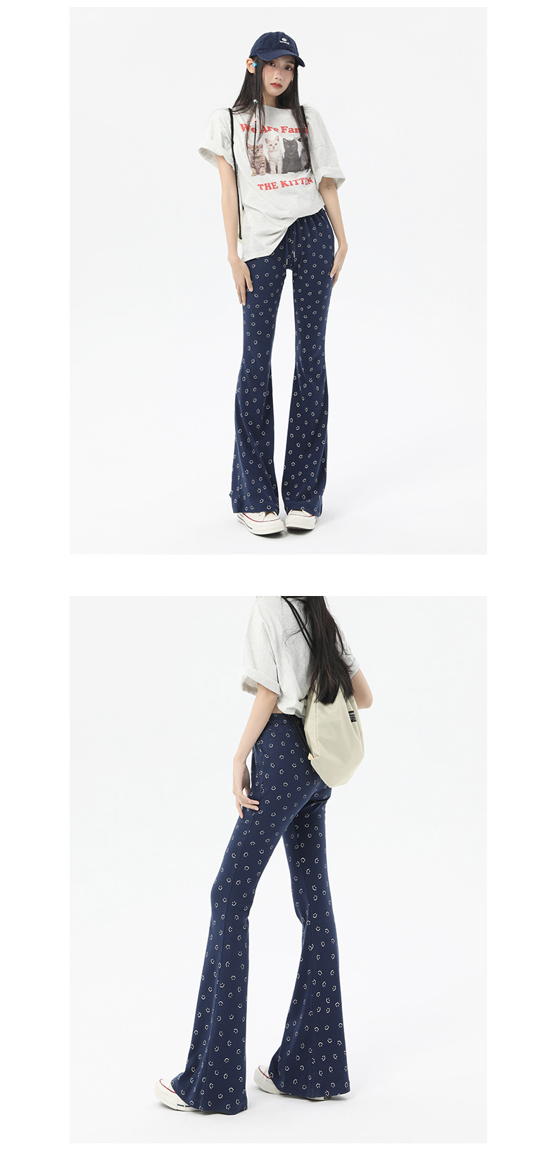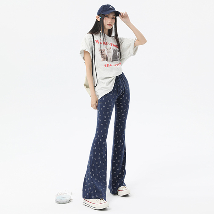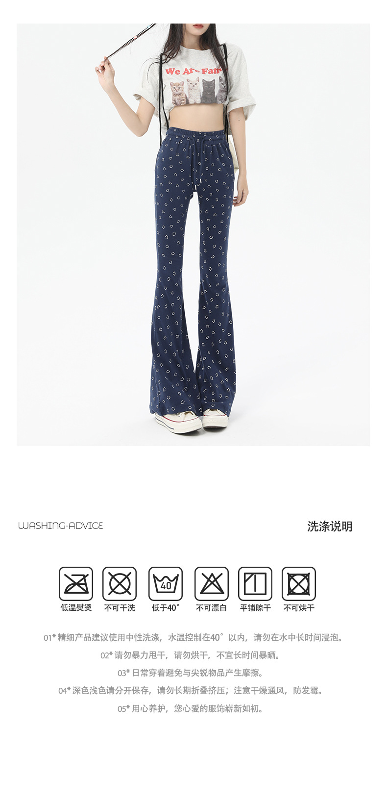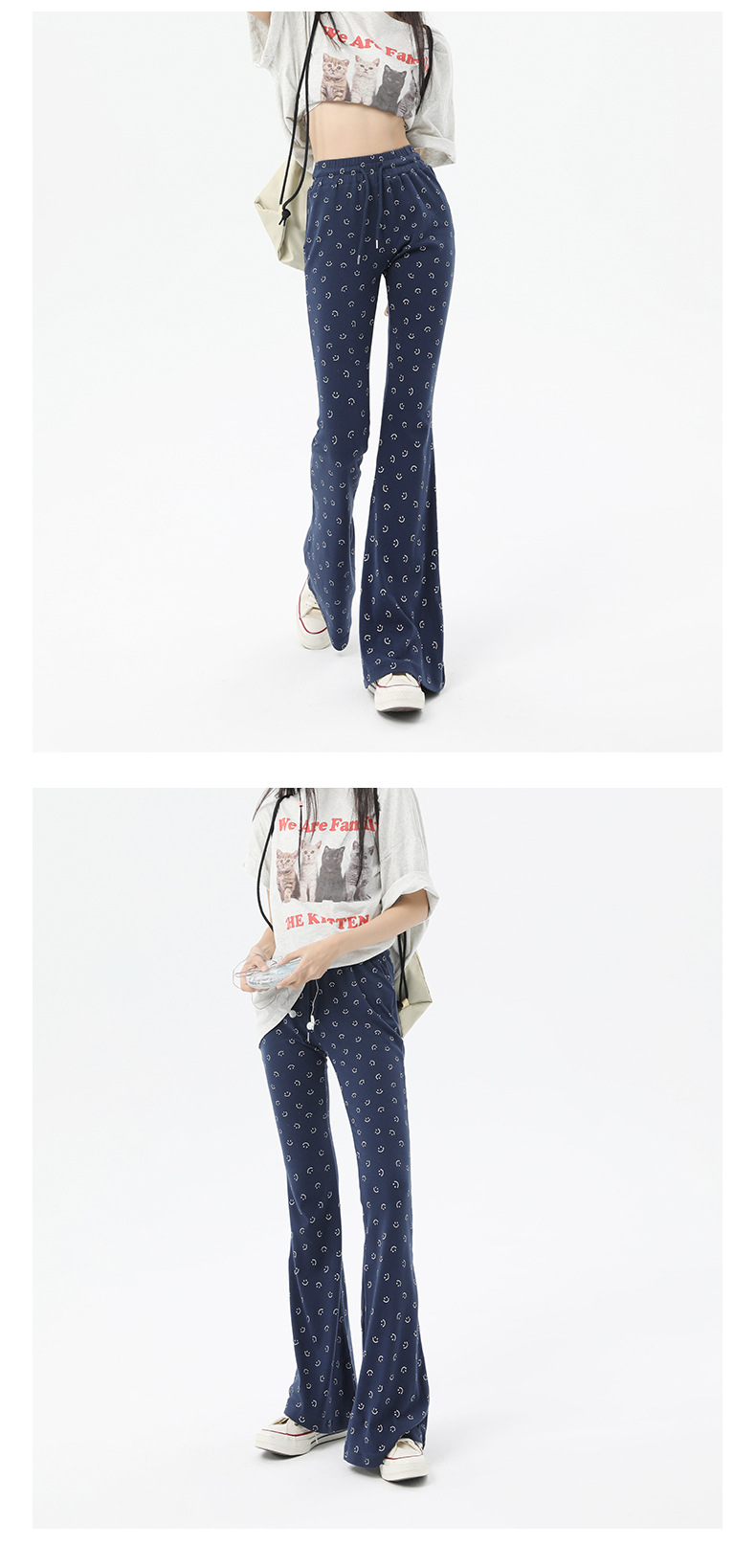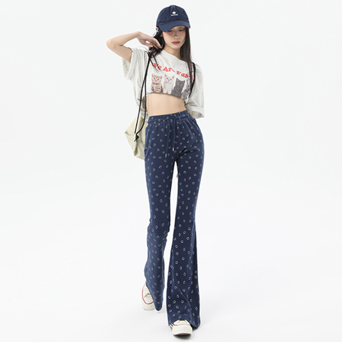 마이크로 라 캐주얼 바지 여성 패션 한펑 스마일리 디자인 높은 허리 봄 올매치 느슨한 슬리밍 교수형 트럼펫 바지스토어 가기