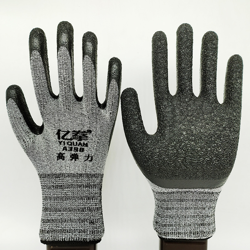 높은 스트레치 그레이 원사 블랙 접착제 주름 플랫 교수형 작업 장갑 착용 방지, 부드럽고 편안한 작업 장갑 현장에서 손을 덮지 않음