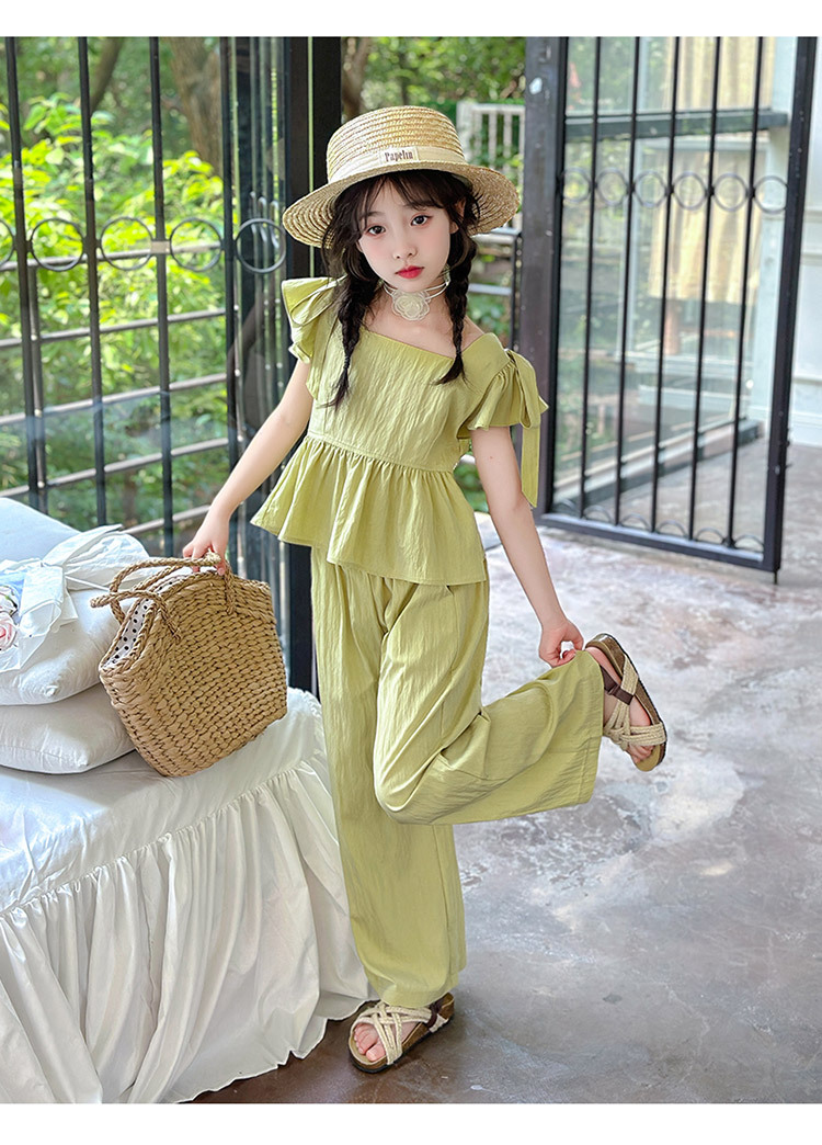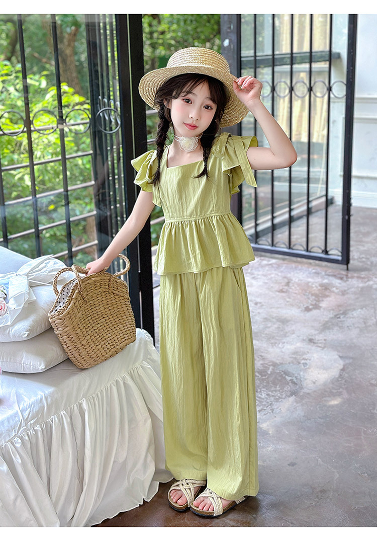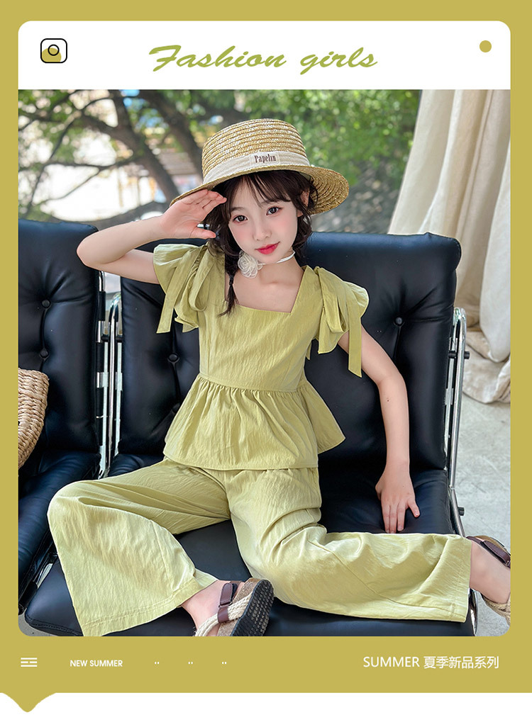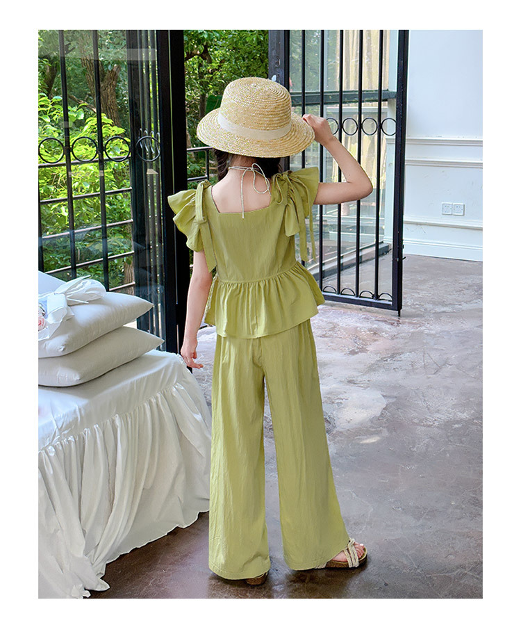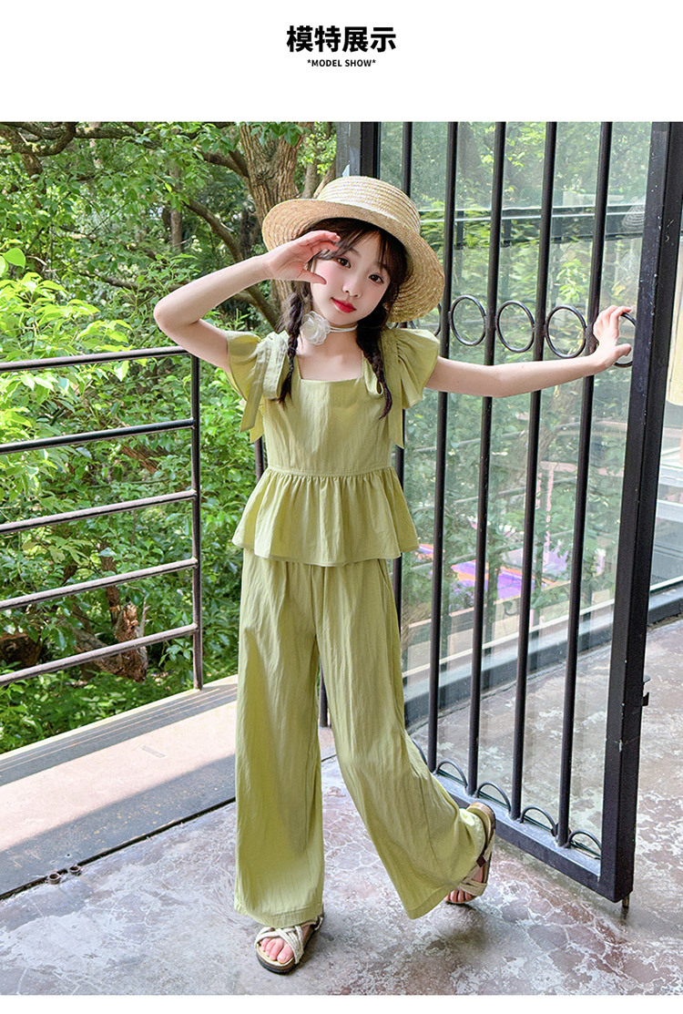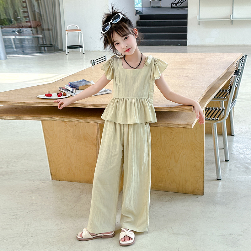 여자 여름 세트 2024 새로운 어린이 서양식 소녀 여름 원피스 한국 스타일 플라잉 슬리브 탑 와이드 다리 바지 투피스 세트