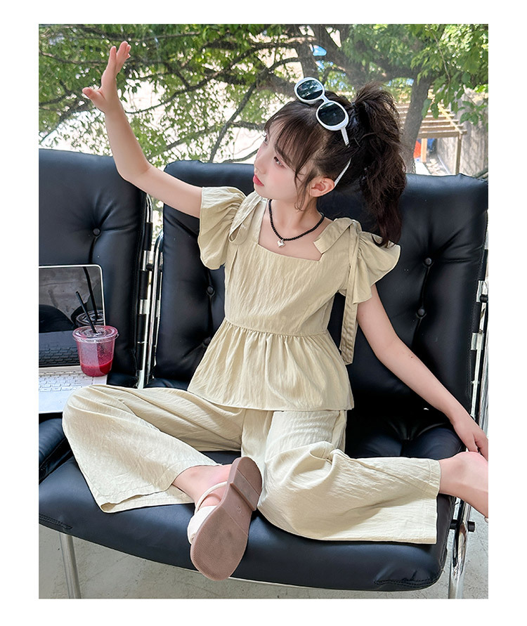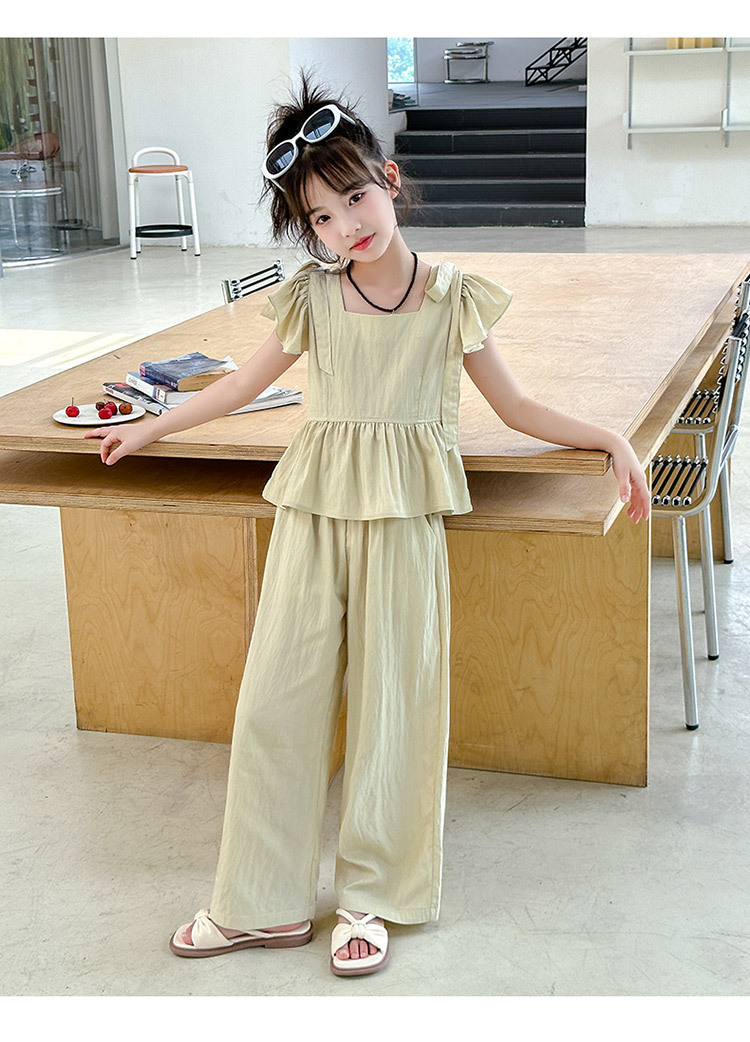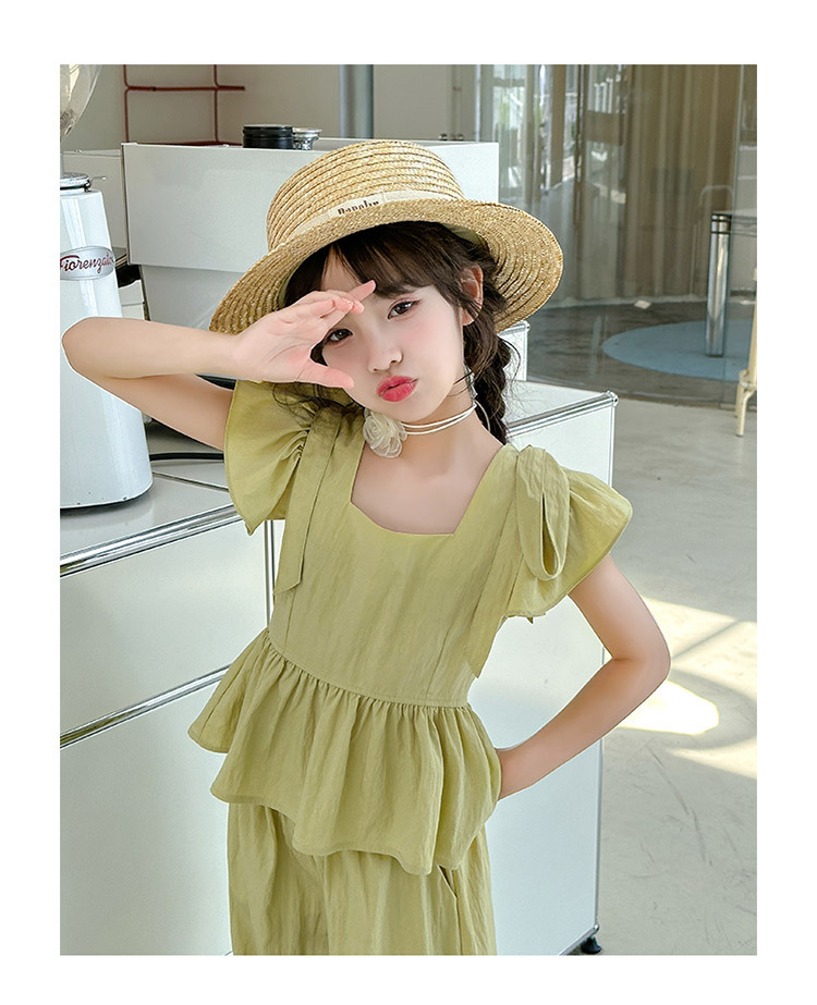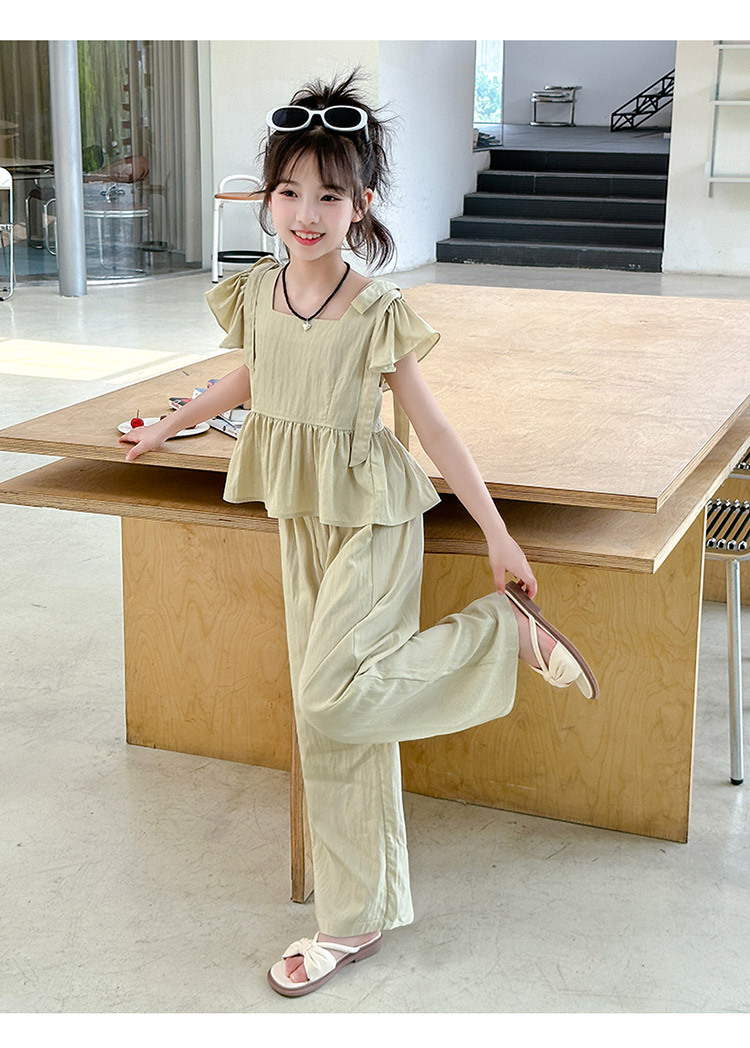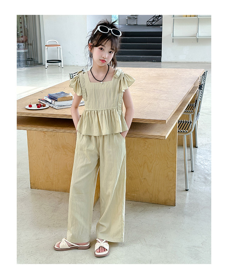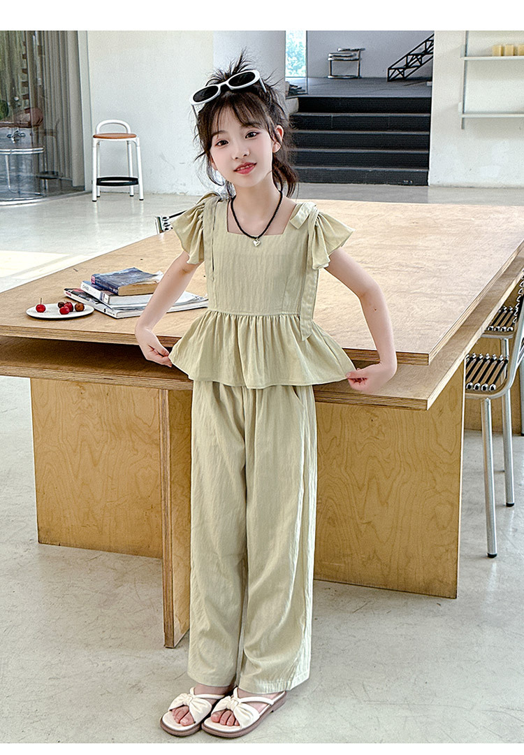 여자 여름 세트 2024 새로운 어린이 서양식 소녀 여름 원피스 한국 스타일 플라잉 슬리브 탑 와이드 다리 바지 투피스 세트